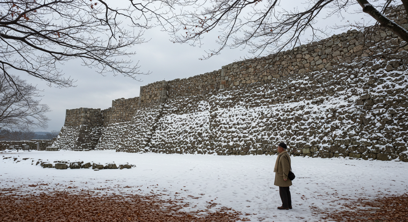 A quiet winter morning at the ruins of Nobeoka Castle in Japan. This scene depicts the remains of an ancient stone wall covered with light snow. A lone figure, a man in his 70s wearing a long coat and scarf, stands in the foreground, gazing meditatively at the ruins of the castle. The sky is cloudy and the soft, diffused light creates a peaceful atmosphere. Bare trees with intricate branches frame the landscape, and scattered fallen leaves add texture to the snowy ground. The atmosphere is introspective and solemn, evoking a sense of history and quiet beauty.