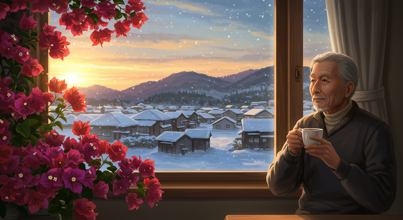 A warm and reflective interior winter scene in the final chapter. It is a cozy room where you can see the snowy scenery outside from the window and see the small town under the soft dusk. Bougainvillea blooms brightly on the windowsill in the foreground, illuminated by the warm light of the setting sun. An elderly Japanese tourist sits nearby, cup of tea in hand, looking out the window with a calm and thoughtful expression on his face. The calm and nostalgic atmosphere symbolizes the end of a meaningful journey.