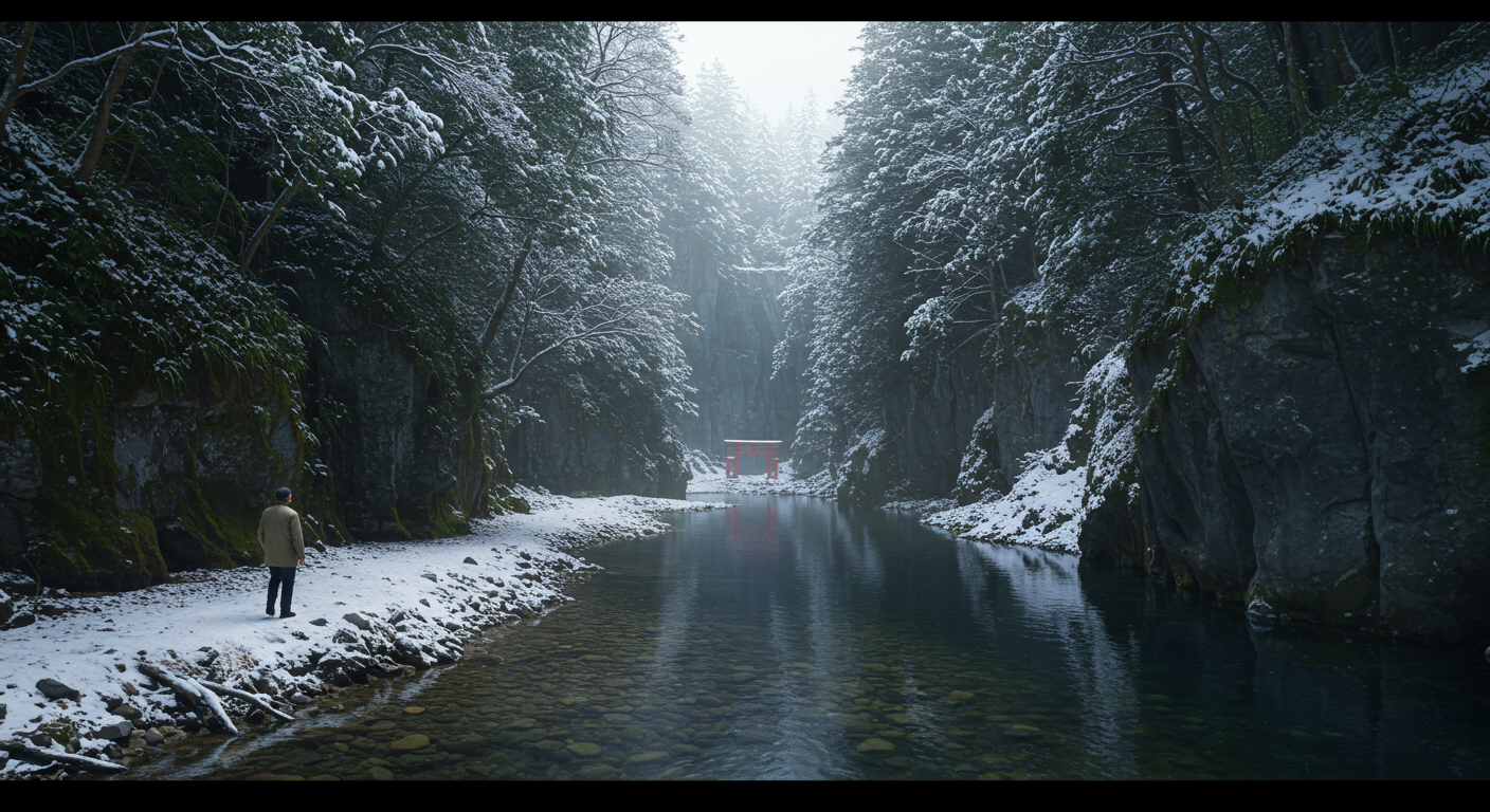 Chapter 2 provides a serene depiction of Japan's Takachiho Gorge in winter. The scene shows a deep, narrow canyon covered in snow-capped trees and with sheer cliffs on either side. The river water below is clear and calm, reflecting the surrounding cliffs and winter sky. A lone male traveler in his 70s wearing a heavy coat walks meditatively along a narrow path at the edge of a valley, admiring the scenery. In the distance, a small red torii gate can be seen faintly among the trees, adding a spiritual and tranquil atmosphere to the scene. The atmosphere is calm and reflective, highlighting the natural beauty of the valley.