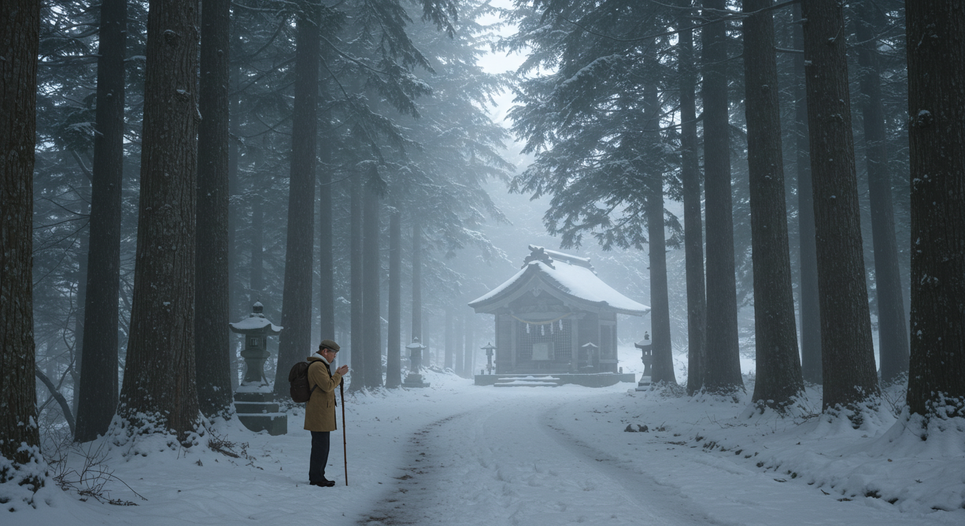 Chapter 3 depicts a quiet and mysterious winter forest deep in the mountains of Kyushu, Japan. The scene includes tall cedar trees with snow-capped branches, and a narrow, winding road covered in fresh snow leading to a small shrine hidden among the trees. A lone traveler, a man in his 70s, wearing a thick coat and scarf, stands in front of a shrine, hands clasped together in prayer. Soft light passes through the fog, creating a magical glow. The atmosphere is calm and reflective, evoking the quiet beauty and spirituality of its surroundings.