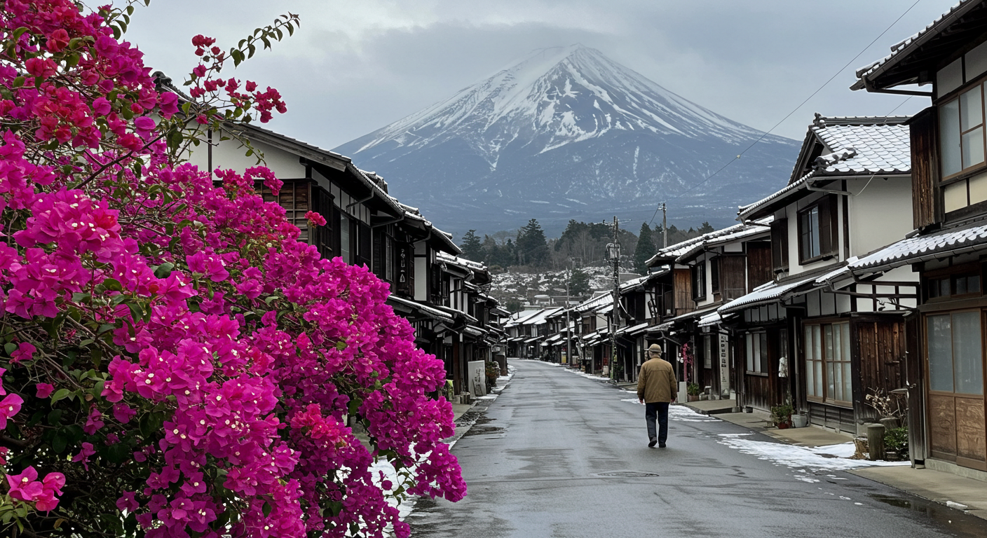 A serene winter scene in Shimabara, Japan. The view features a quiet town street with traditional Japanese architecture dusted with snow. In the foreground, a vibrant bougainvillea flower blooms vividly despite the winter cold, standing out against the muted background. A lone traveler in a long coat walks along the street, pausing to admire the flower. In the distance, Mount Unzen looms under a cloudy sky, its peak capped with snow. The atmosphere is peaceful yet reflective, capturing the blend of natural beauty and historical depth.