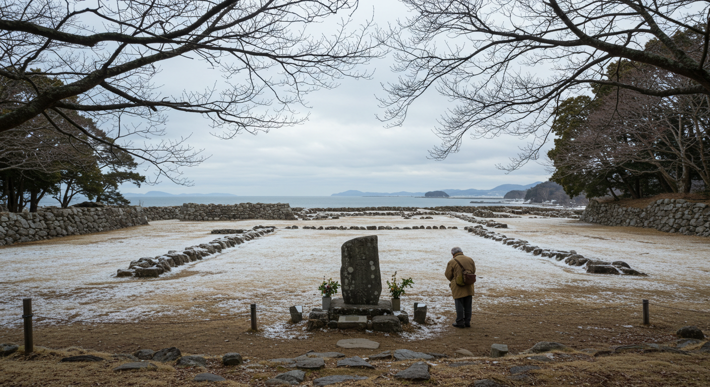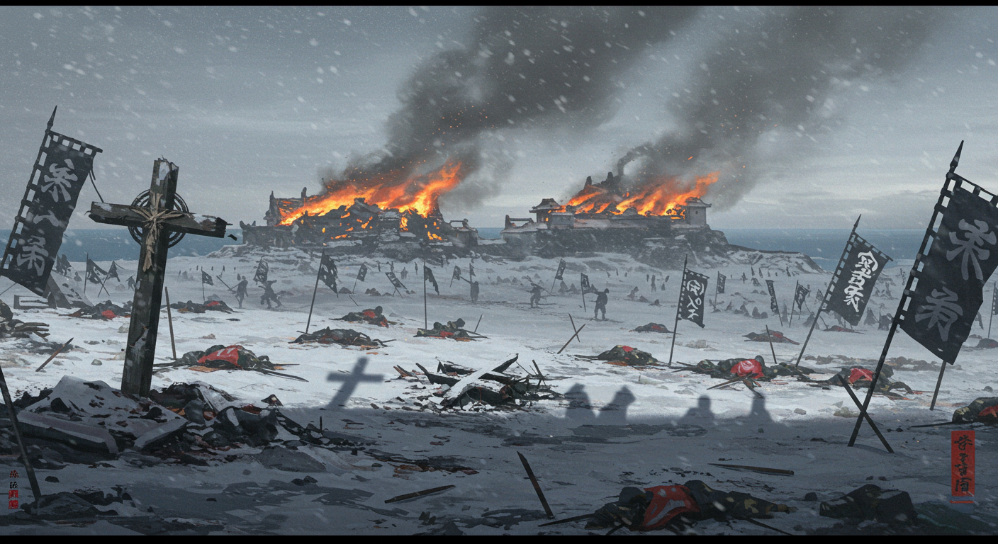 Japan's Edo period. A scene overlooking the Ariake Sea in Kyushu depicts the aftermath of the final battle, depicting the ruins of a castle smoldering under a gray winter sky. Fallen flags and weapons are scattered on the snowy ground, and the shadows of soldiers float over the desolate battlefield. In the foreground, a broken Christian cross, symbolizing the fall of the rebels, lies in ruins. The atmosphere is heavy and sad, with a sense of tragedy and loss permeating the scene.