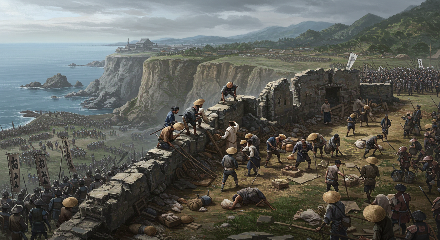 A dramatic historical depiction of the Shimabara Rebellion at Hara Castle in 17th century Japan. The scene shows the rebel forces, including farmers and Christian samurai, taking a defensive stance within the ruins of Hara Castle, located on a natural fortress overlooking the sea. The rebels, wearing tattered clothing and carrying makeshift weapons, appear determined despite signs of hunger and exhaustion. Surrounding the castle are the overwhelming forces of the shogunate's army, with banners and encampments visible in the distance. The sky is overcast, adding a somber tone, and the landscape includes steep cliffs and the sea in the background. The atmosphere is tense and evocative, reflecting the rebels' desperate stand against overwhelming odds.