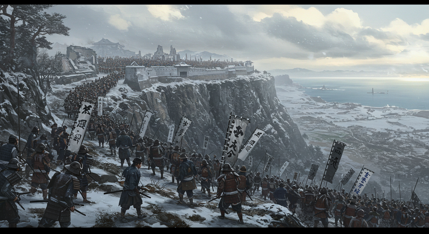 A dramatic historical depiction of the Shimabara Rebellion at Hara Castle in 17th century Japan, from the perspective of the advancing shogunate forces. The scene shows a large army moving up steep terrain toward the castle ruins, their banners waving in the cold wind. Soldiers in traditional samurai armor carry spears and swords, advancing in disciplined formations. In the distance, the rebel forces can be seen on the castle walls, preparing their defenses. The sky is overcast, with a faint hint of sunlight breaking through the clouds, adding to the tense and foreboding atmosphere. The landscape features rugged cliffs, the sea visible in the far background, and traces of snow covering the ground.