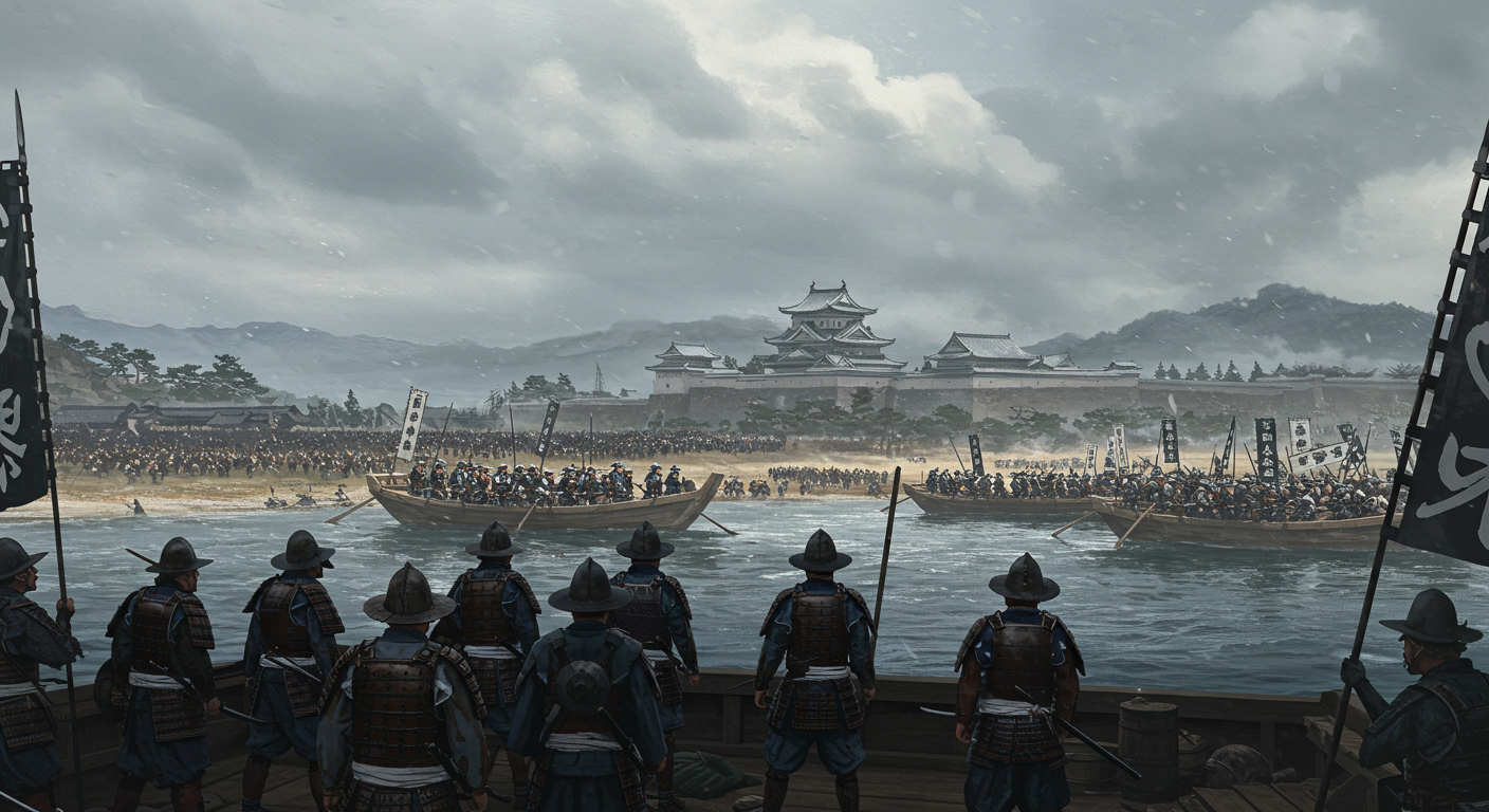 A dramatic historical depiction of the Shimabara Rebellion, which occurred at Hara Castle in Japan in the 17th century, from the perspective of the advancing Shogunate army. In this scene, a large army crosses the Ariake Sea by boat, their flags waving in the cold wind. Hara Castle can be seen in front. Soldiers in traditional samurai armor advance in disciplined formations, carrying spears and swords. In the distance you can see rebels preparing to defend themselves on the city walls. The sky is overcast, and the faint rays of sunlight shining through the gaps in the clouds heighten the tension and eerie atmosphere. Scene seen from soldiers on board