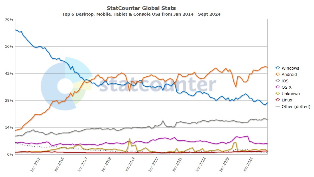 OSのマーケットシェアで2024年9月のWindowsは26.6%とシェアを落とし続けているがこの要因は何か。(Windows 10は2015年7月29日、Windows11は2021年10月5日にリリースされた)