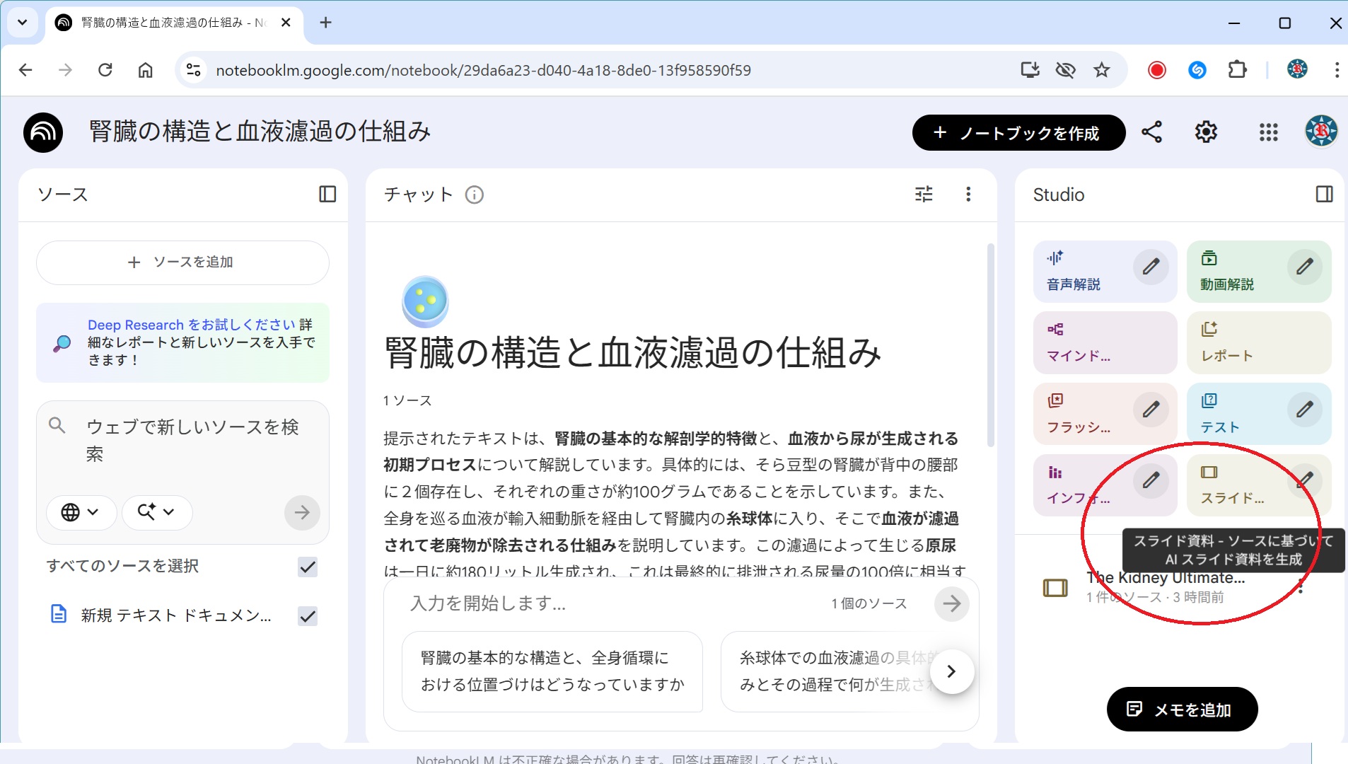 腎臓についての記事から次の文章を切り取り、NotebookLMの入力とした。これからスライドを生成した例
