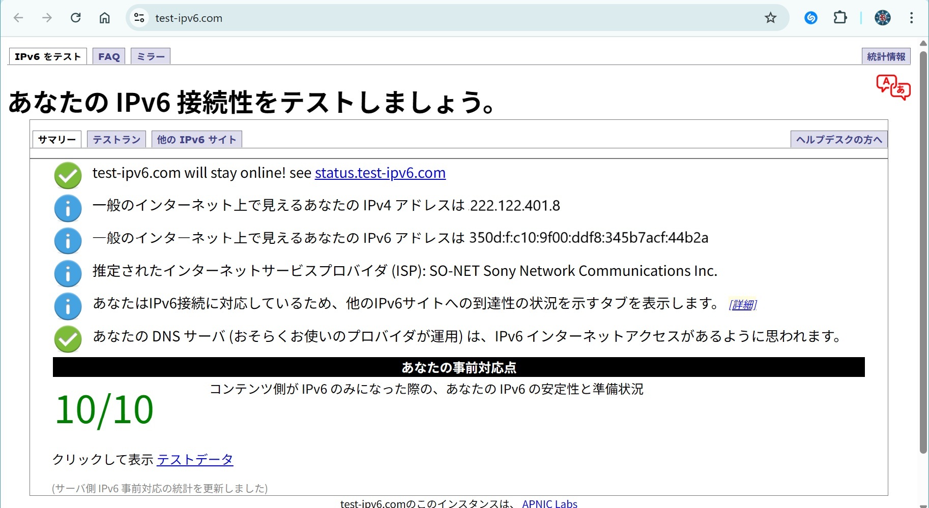IPv6テスト: 10点満点はIPv6接続性、安定性、およびDNS通信が正常に機能している最高評価
