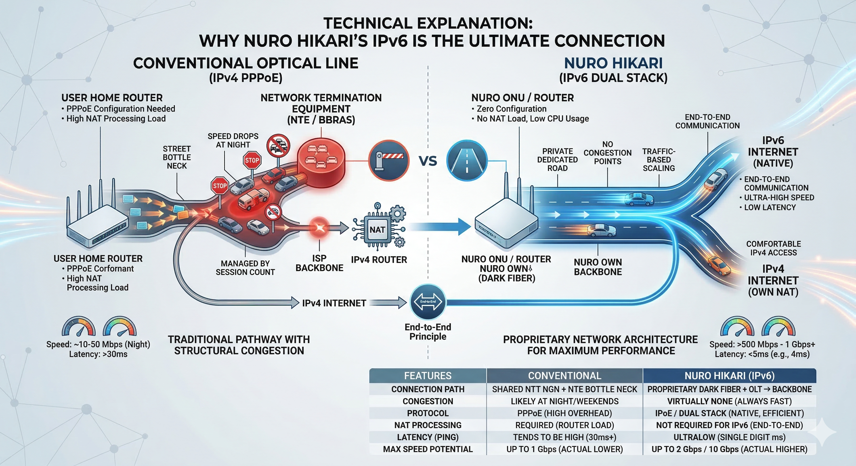 自社専用のネットワークであるため、そもそもフレッツ光で問題となっている「NTTの網終端装置(NTE)」という渋滞ポイントが存在しません。IPv4であっても、直接広帯域なSo-netのバックボーンへルーティングされます。