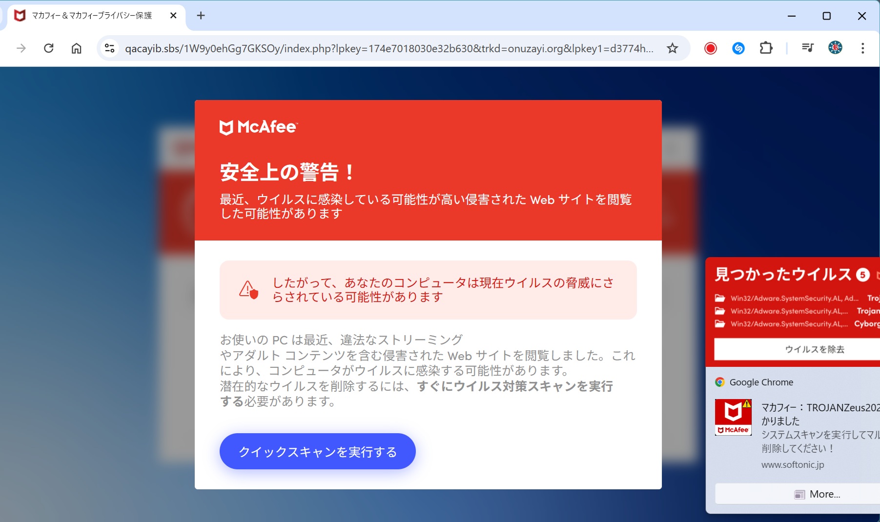 通知のGoogle Chromeの右にあるxを押して消しても次々と表示され、続いてブラウザにも大きな「安全上の警告!」と出る。ブラウザを閉じて再度起動しても同様の通知が出る。ちなみにセキュリテイソフトMcAfeeは使っていない。