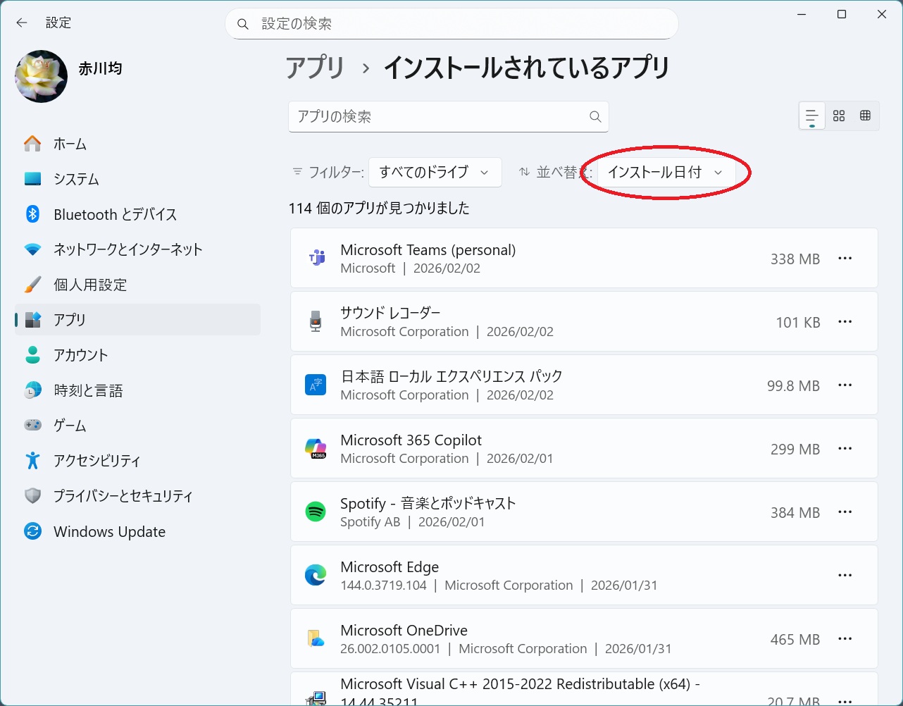 を右クリック > 「インストールされているアプリ」> リストから並び替えを「インストール日付」