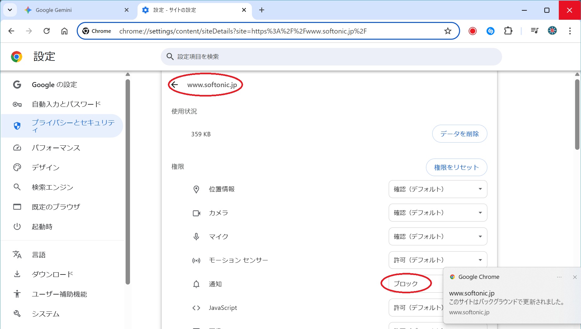 設定の左側のメニューから「プライバシーとセキュリティ」 > 「サイトの設定」を選択。