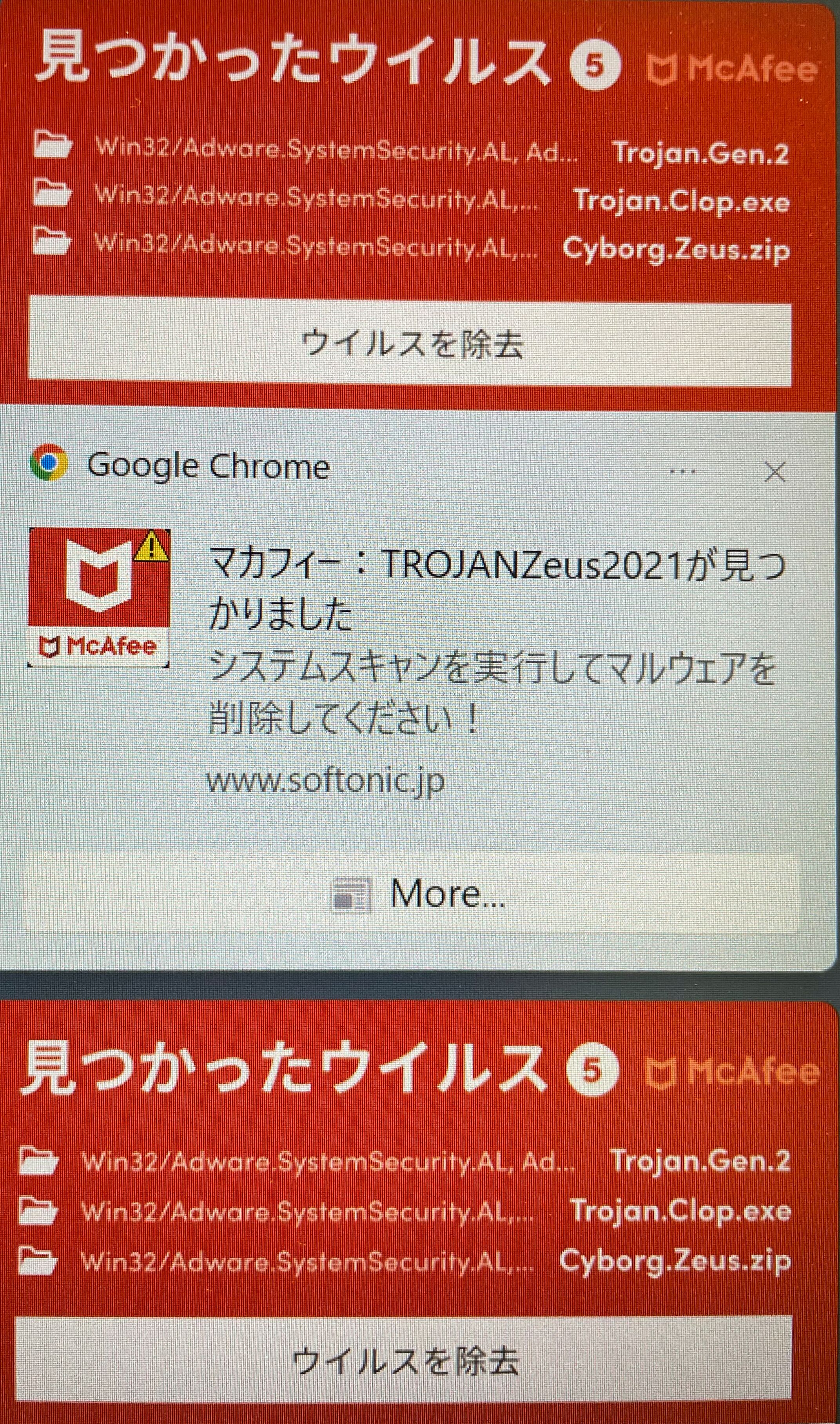 すぐにデスクトップ右側に「見つかったウイルス⑤McAfee」という赤い背景の通知が表示された。「ウイルスを除去」というボタンなどを押すと危険なことは知っていた。TROJANZeus2021というのはトロイの木馬というウイルスの名前。同様の通知が立て続けに上下にも重なって出てくる。焦る。😅