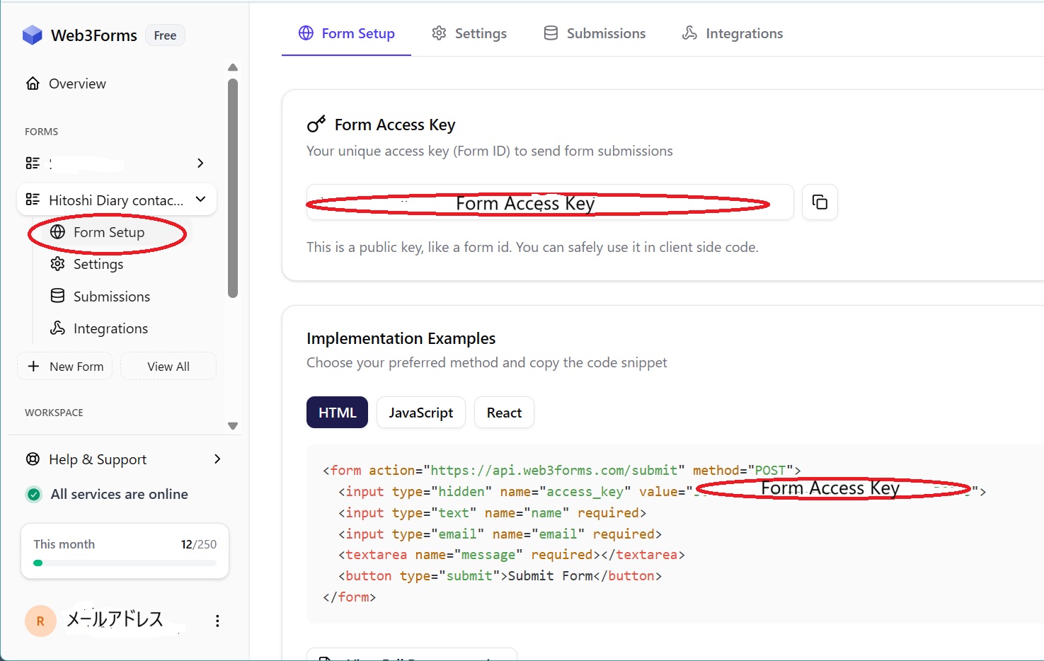 サイトに登録し、サインイン。コンタクトフォームを作成。Form Access Key がサンプルのHTMLにセットされるのでそのままコピー。