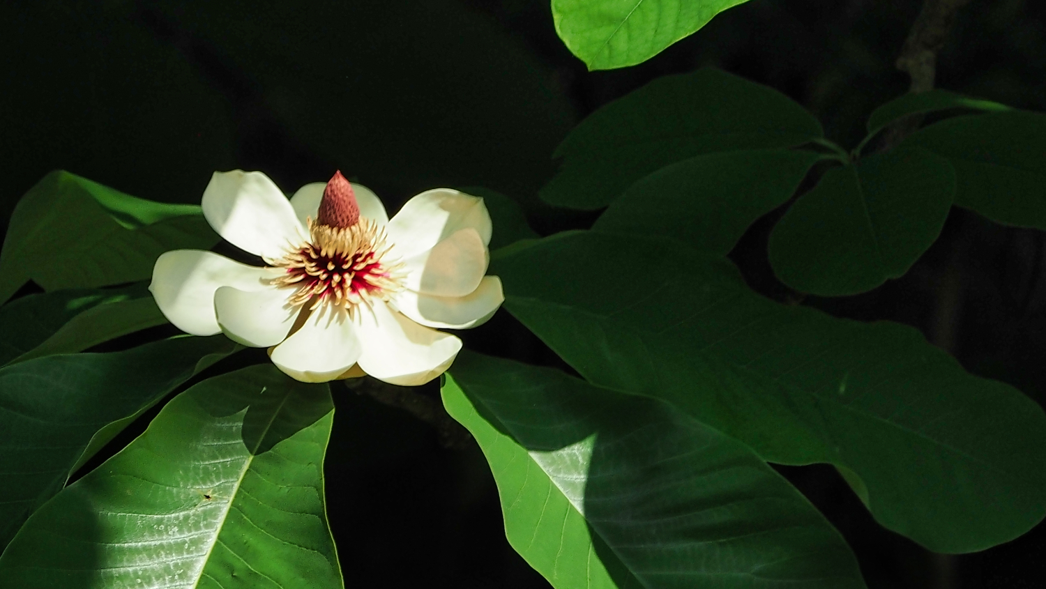オオヤマレンゲは純白の花びらに赤い雄蕊が見えて蓮華と言われるほどに奇麗である。もともとは奈良県の大峰山に自生していたものという。モクレンの仲間らしい。