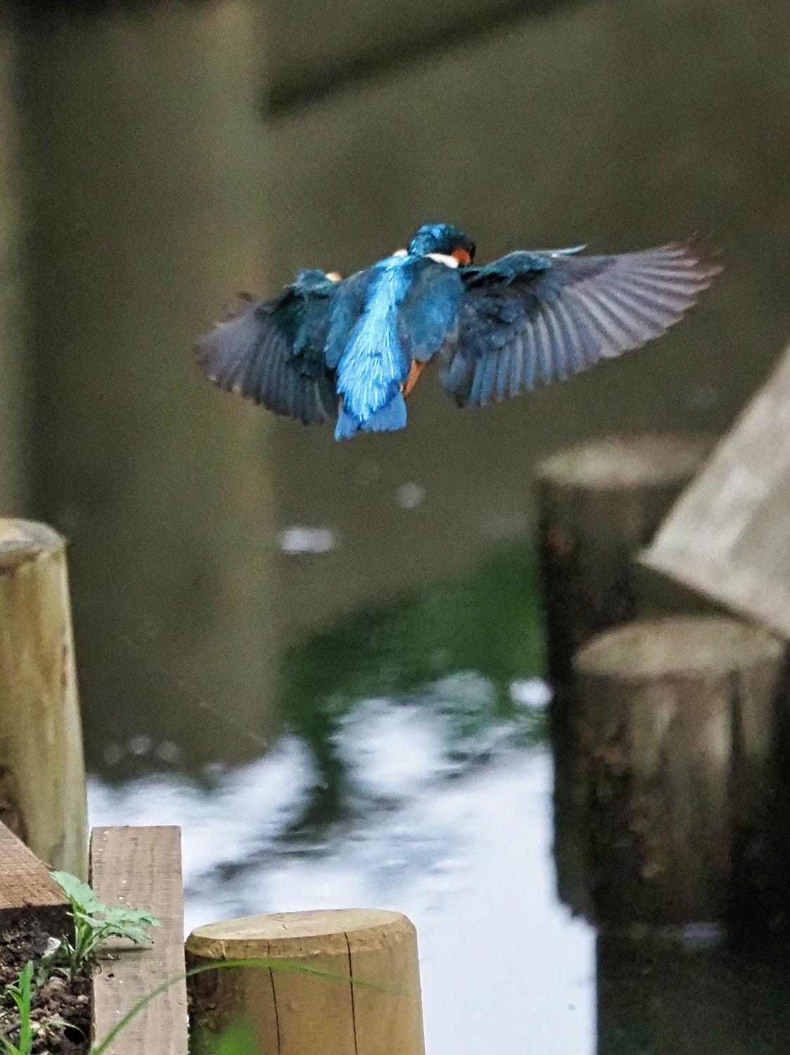 午後の日差しに池の水面がキラキラと反射しており、カワセミの背景に取り込めるように回り込み姿勢を低くして撮ってみた。