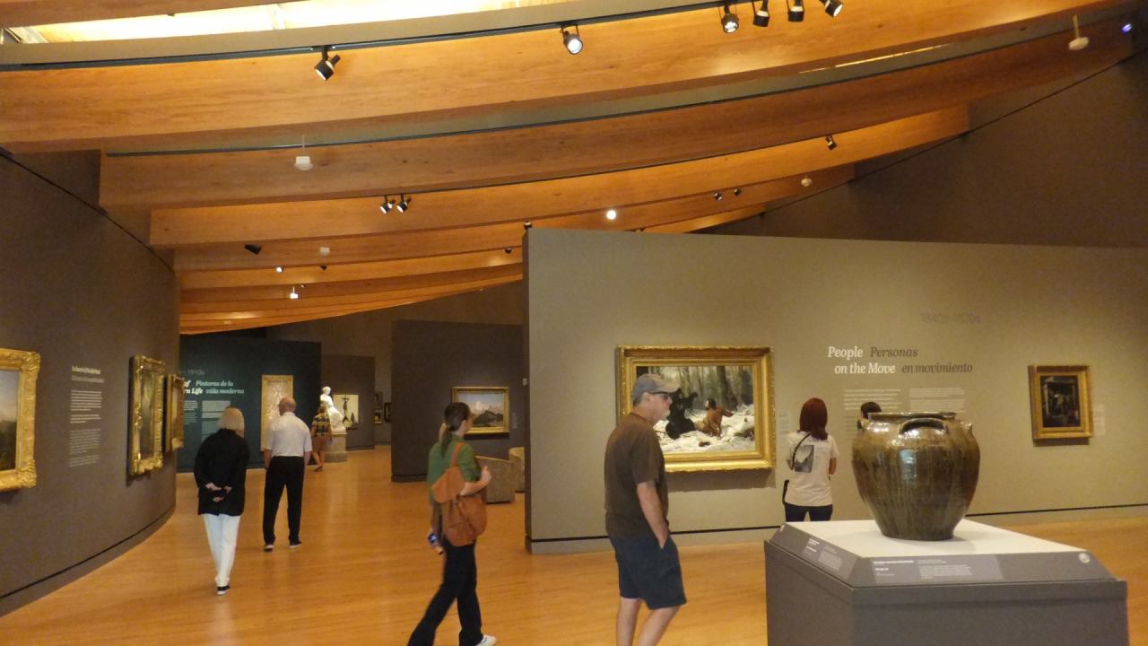 展示室内部は天井と床に木材が使われ、心地よい空間を創り出しており、 8つの建物を結ぶ通路の両側は全面ガラス製で周囲の自然と建築美を楽しみながら 館名が示すように5世紀にわたるアメリカ芸術を堪能できました。