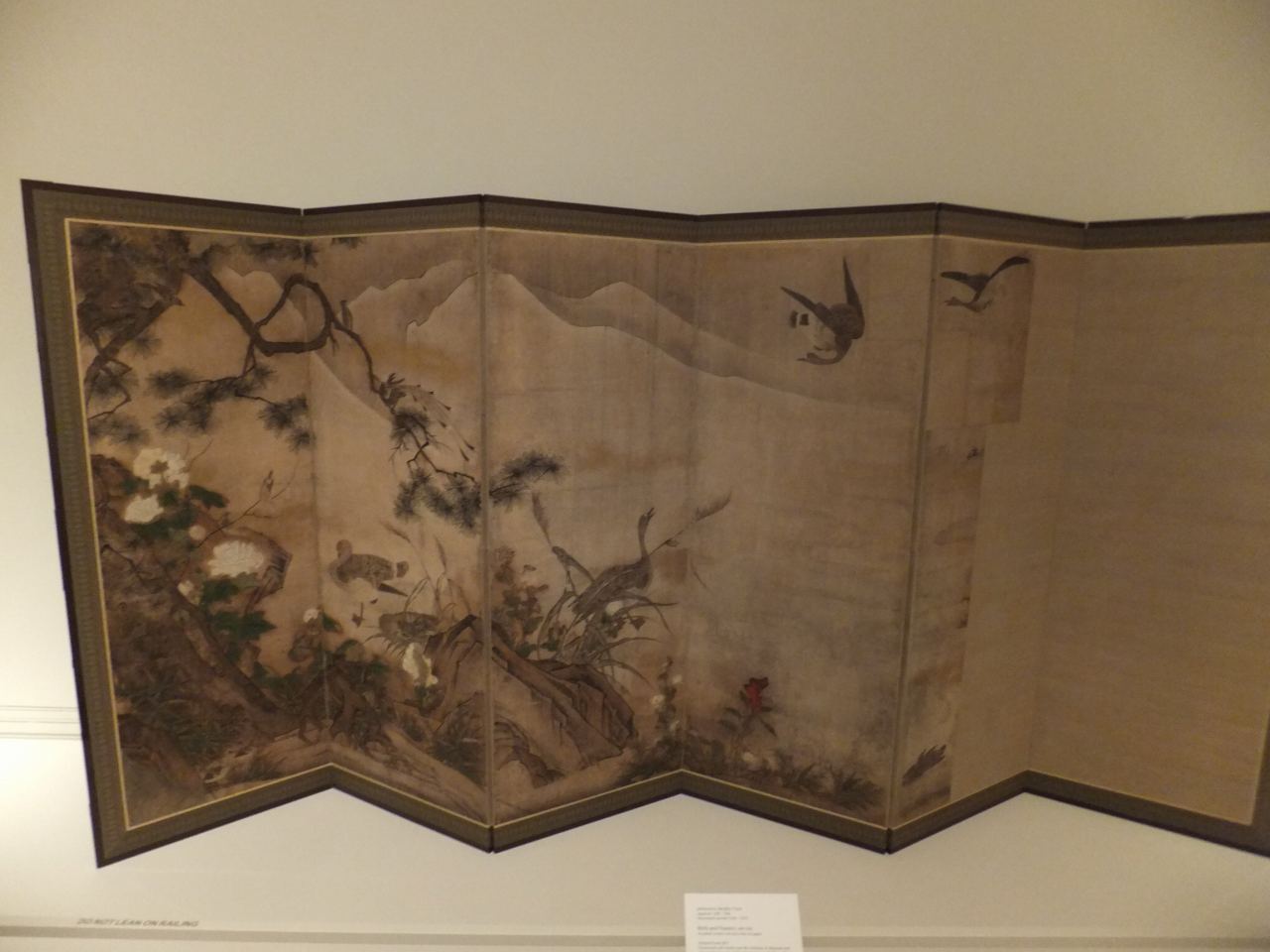 彼女が学芸員で、先ずアジア美術の専門家を呼んでくれ、開催予定の日本展に備え 本来閉まっているアジア部門を守衛さんに開けてもらい特別に見せてくれたのです。 何とここには雪舟の屏風があるのでした。まだ色彩も鮮やかです。