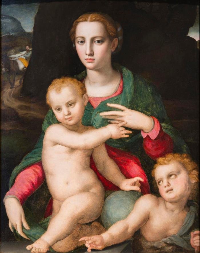 艶やかな聖母の肌と顔付きはブロンズィーノ固有のものですが、 キリストとヨハネは工房の手が入っていそうです。 左上の男性とロバは「エジプトへの逃避」を暗示しているのでしょう。