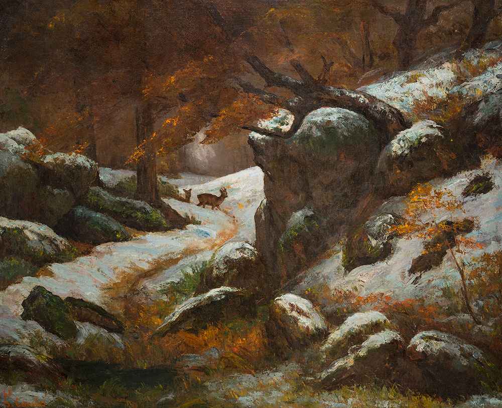 クールベの「雪中ののろ鹿」は彼の好んだ主題で、幾つものヴァリエーションが ありますが、中でも色彩の妙が際立つ作品となっています。