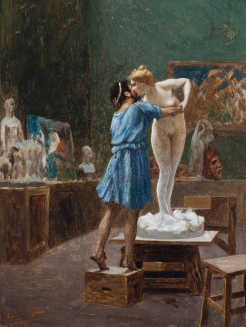 ギリシャ神話では、彫刻家ピグマリオンが自ら作った彫像ガラテアの美しさに 魅了され、その像に恋心を抱きます。彼は愛の女神アフロディーテに祈り、 その祈りが聞き入れられたことで、ガラテアの像に命が吹き込まれるという物語。