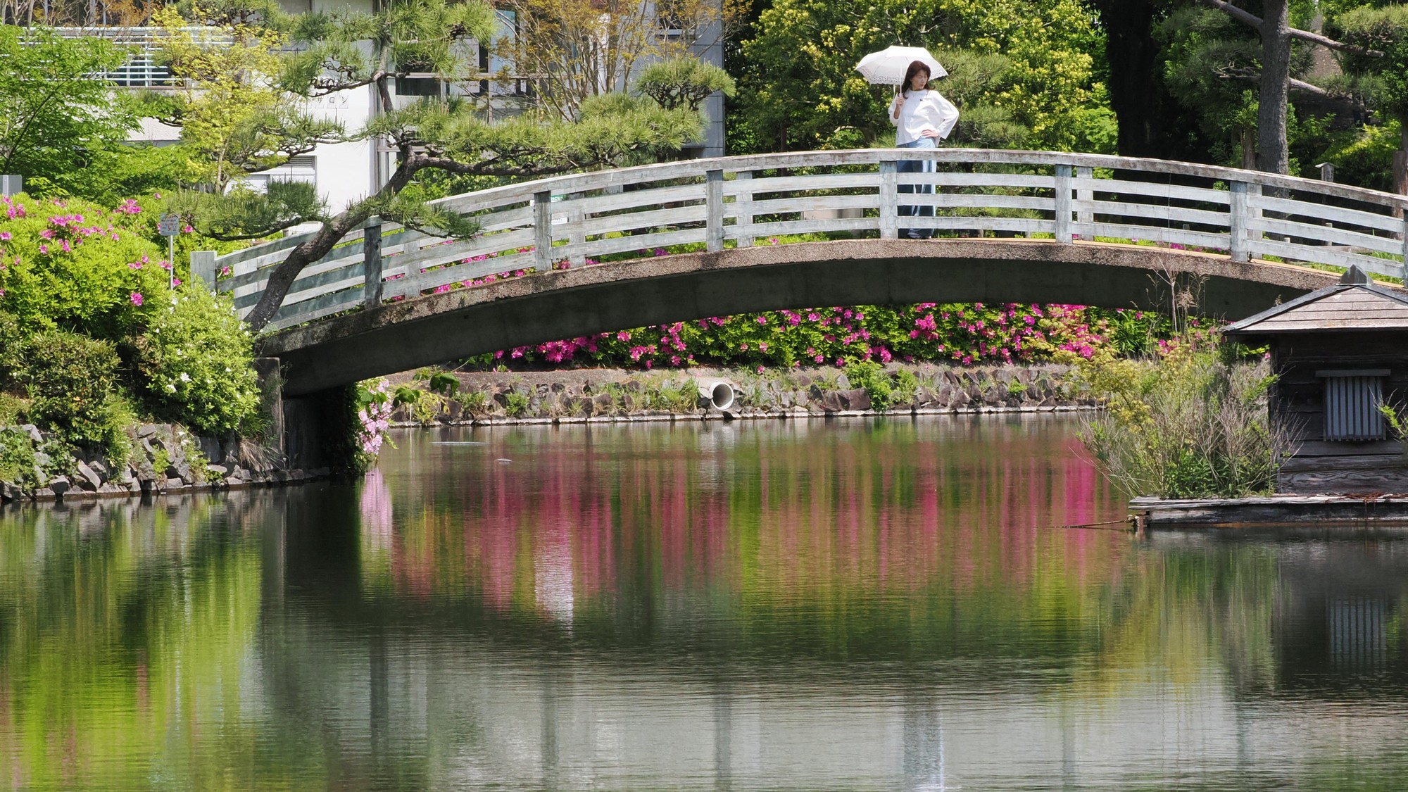 太鼓橋のそばの藤棚も小ぶりながら人気のスポットになっていた。雑木林にはキンランが見える。ツツジの鮮やかな赤もひときわ目立つ。