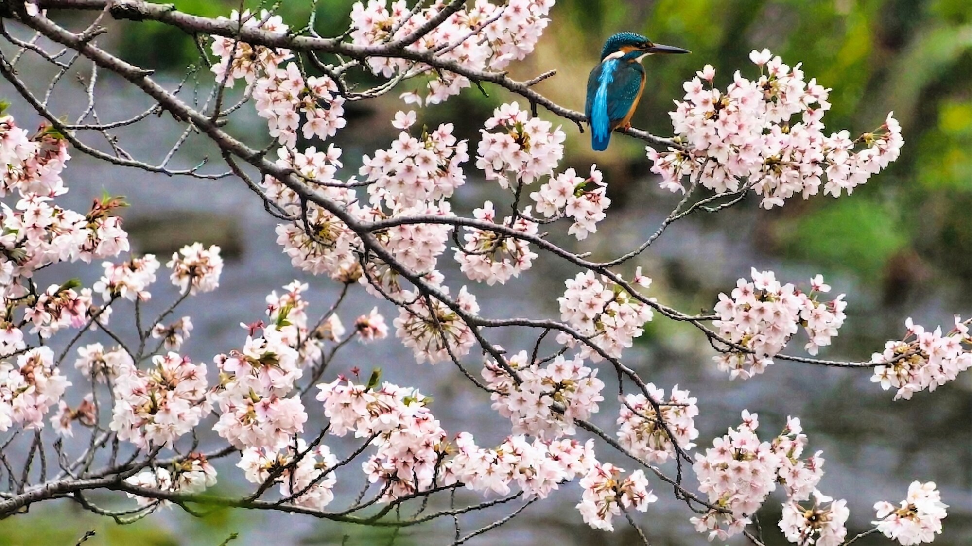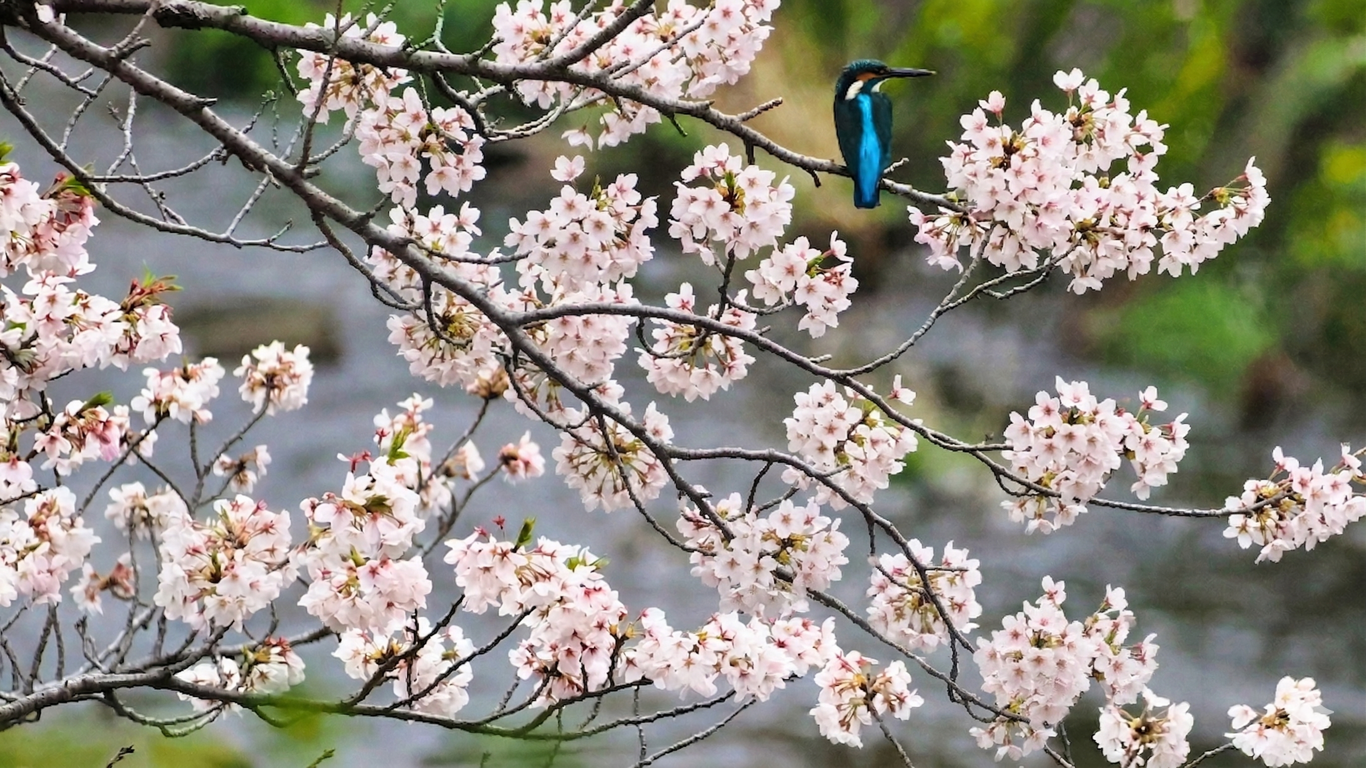 写真の狙いどころは川面を背景にして垂れ下がったソメイヨシノと花筏。シャッタースピードと手振れ補正を効かし場合によっては手すりでカメラを固定する。運がよければカワセミが桜の枝に留まってくれる。