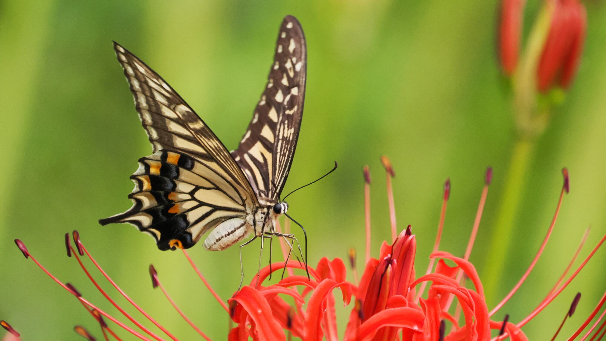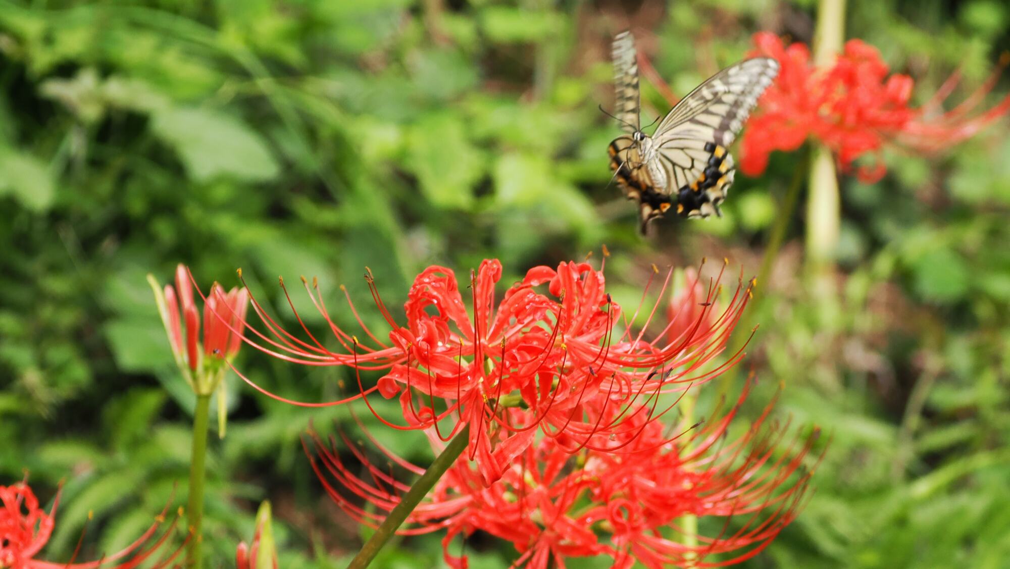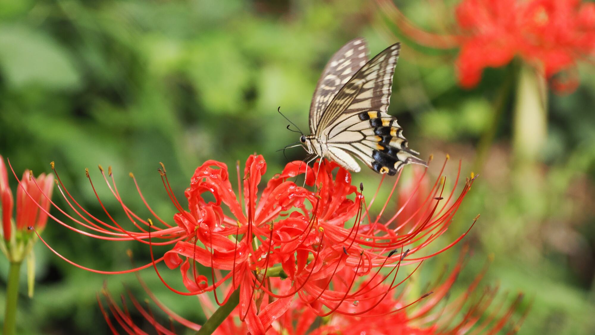 期待通り、アゲハ蝶がやってきた。彼岸花を次々と飛び回るので連射する。中々思い通りの写真はとれないが、下手な鉄砲の中からまともなものを選ぶ。もう少し待つとカラスアゲハがやってくる確率が高くなるが、暑さでその気にはならなかった。