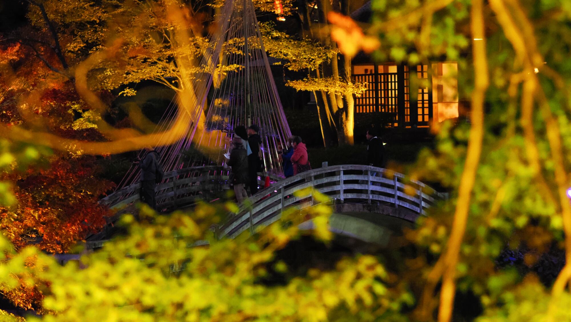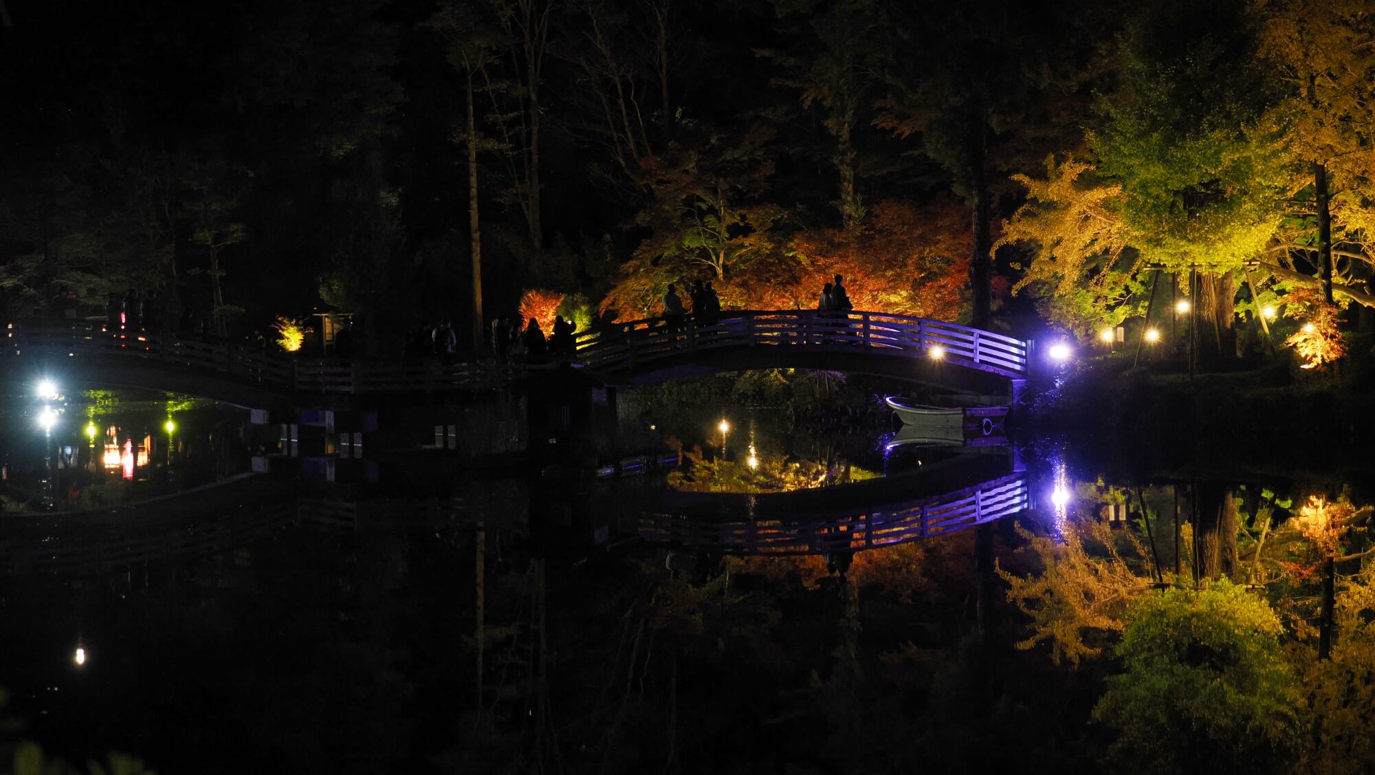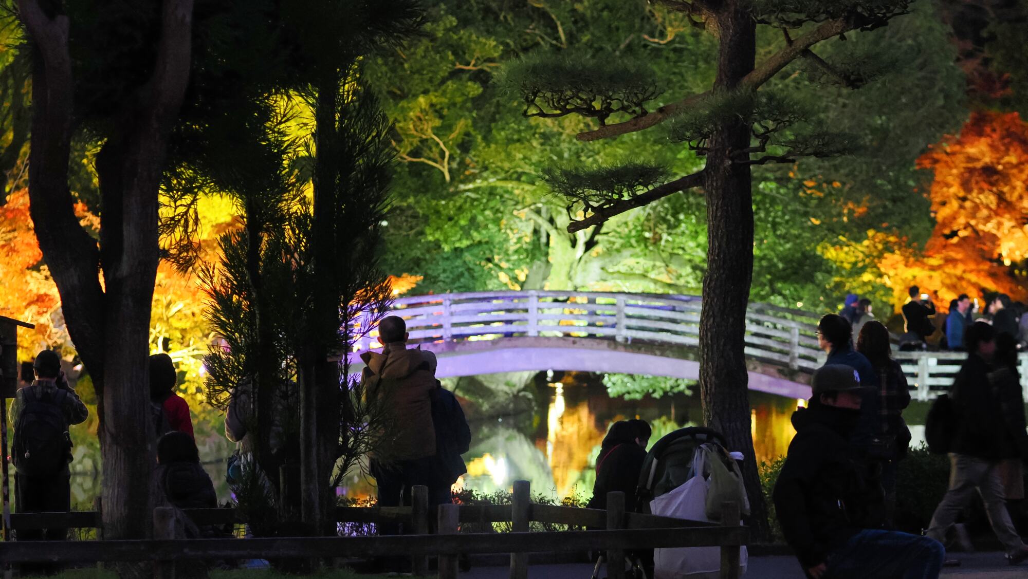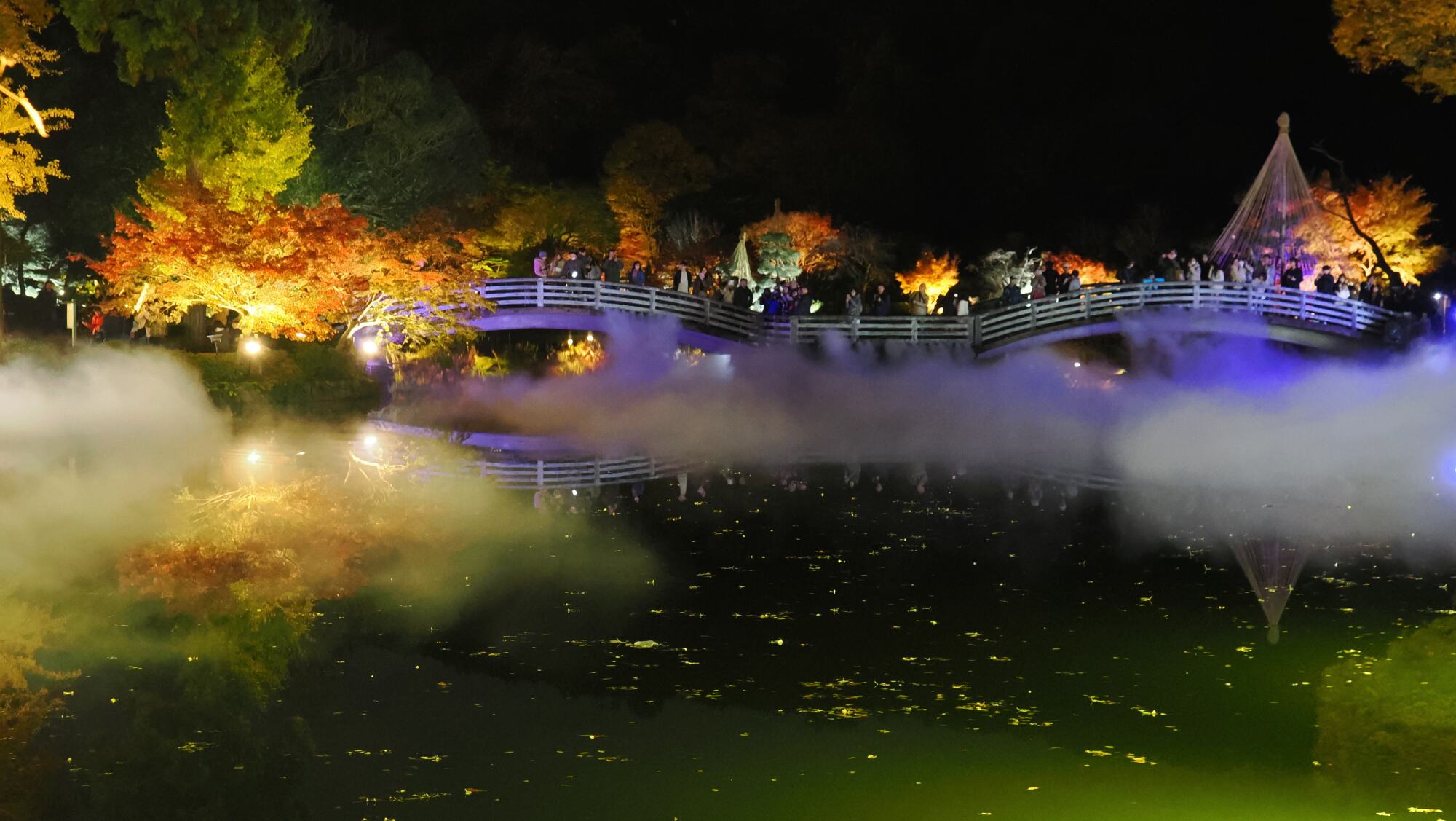 紅葉する木には黄色いライト、松の緑には青系のライト、太鼓橋は紫系のライトで照らされ公園側も様々な工夫をしている。