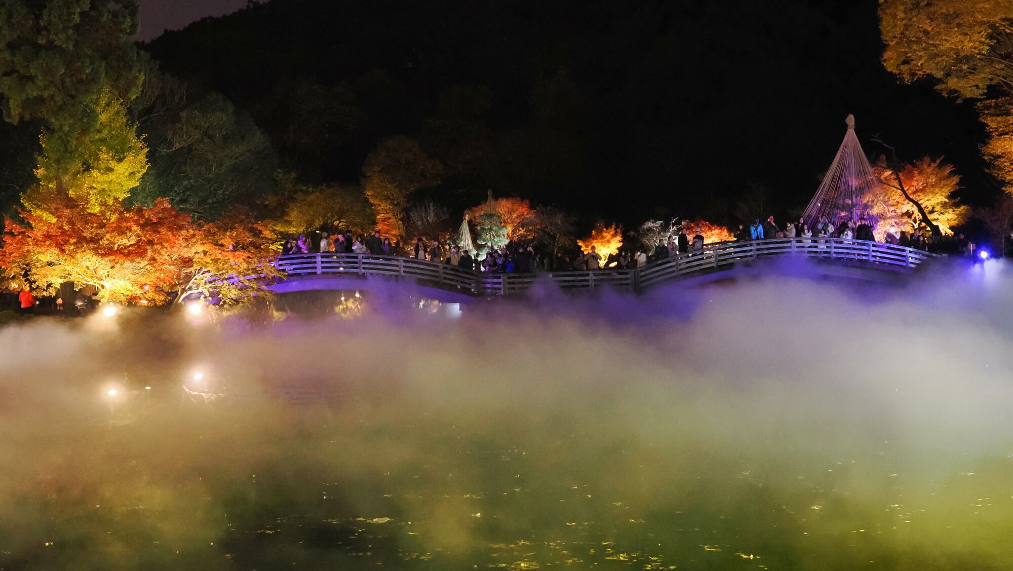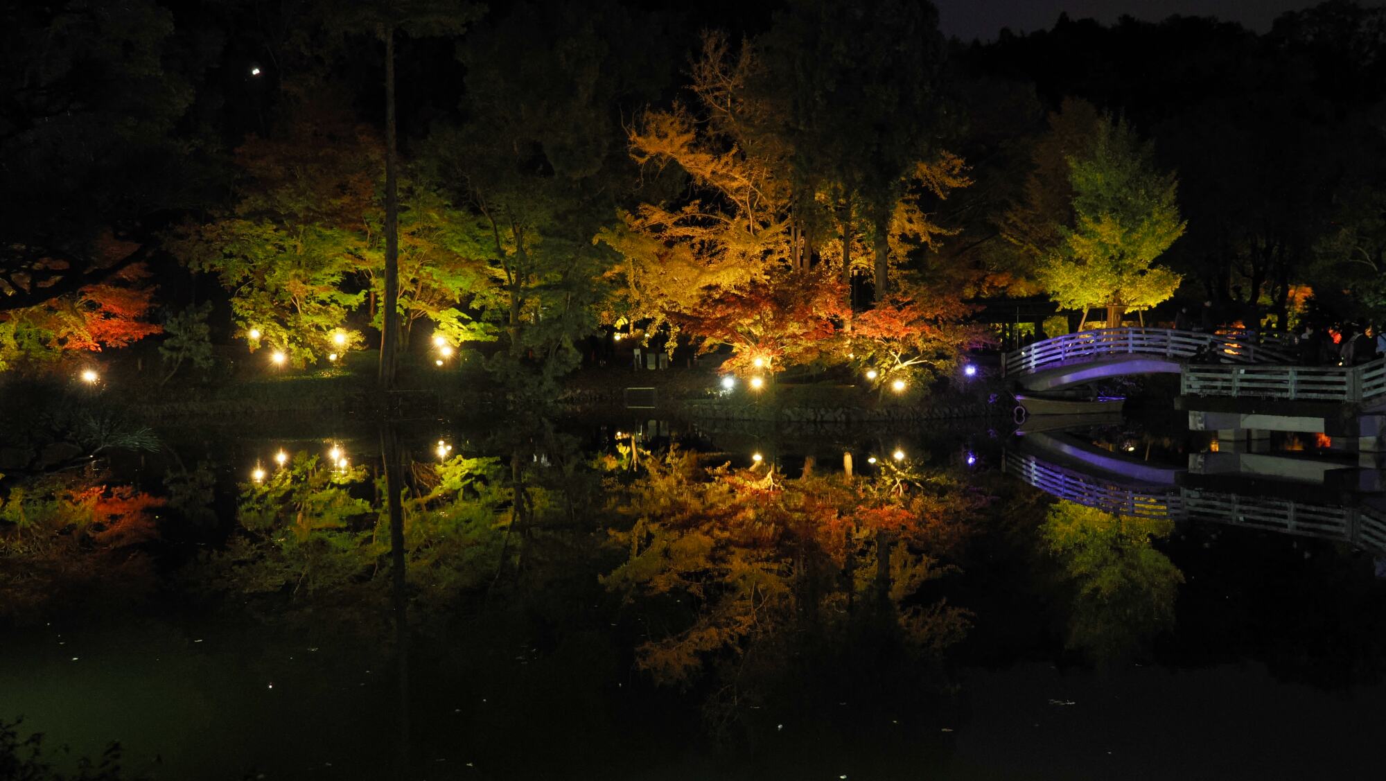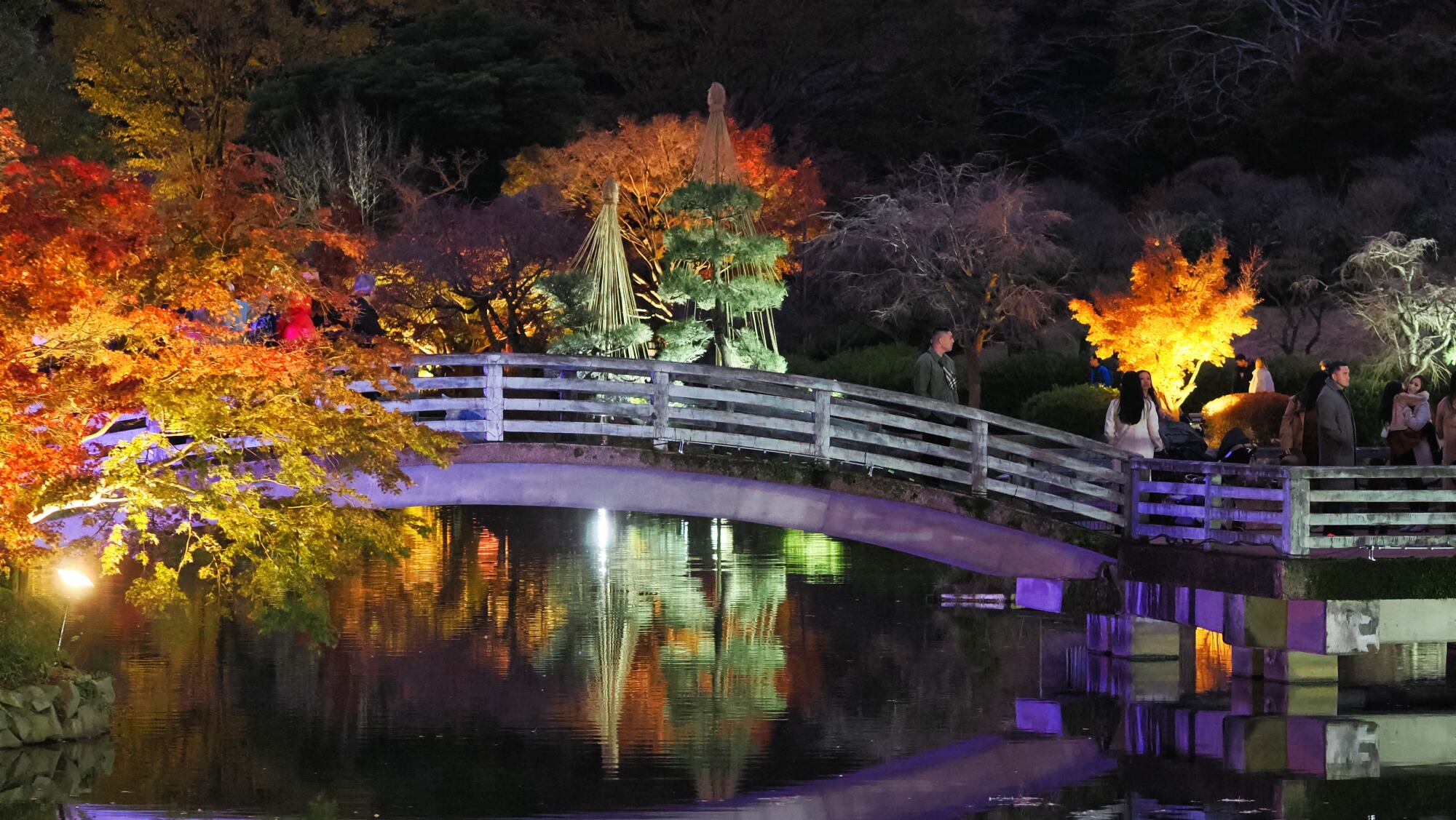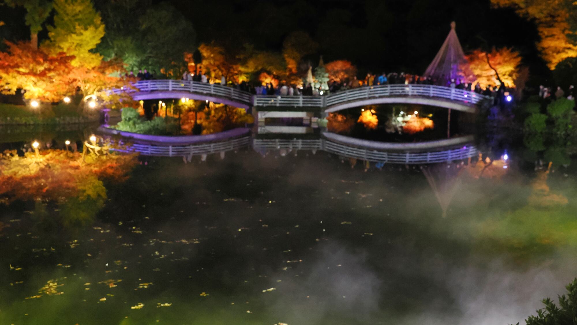 紅葉する木には黄色いライト、松の緑には青系のライト、太鼓橋は紫系のライトで照らされ公園側も様々な工夫をしている。