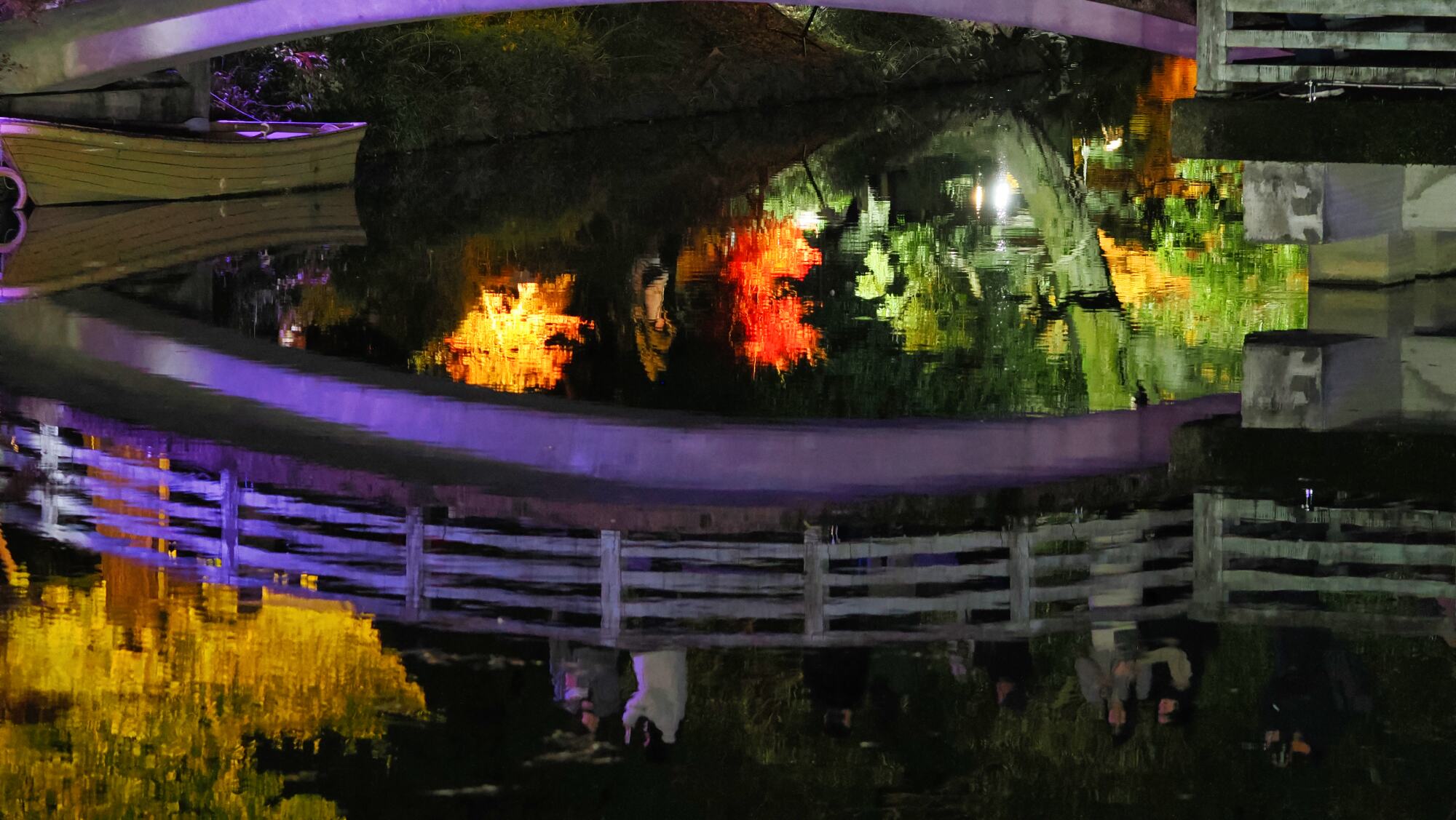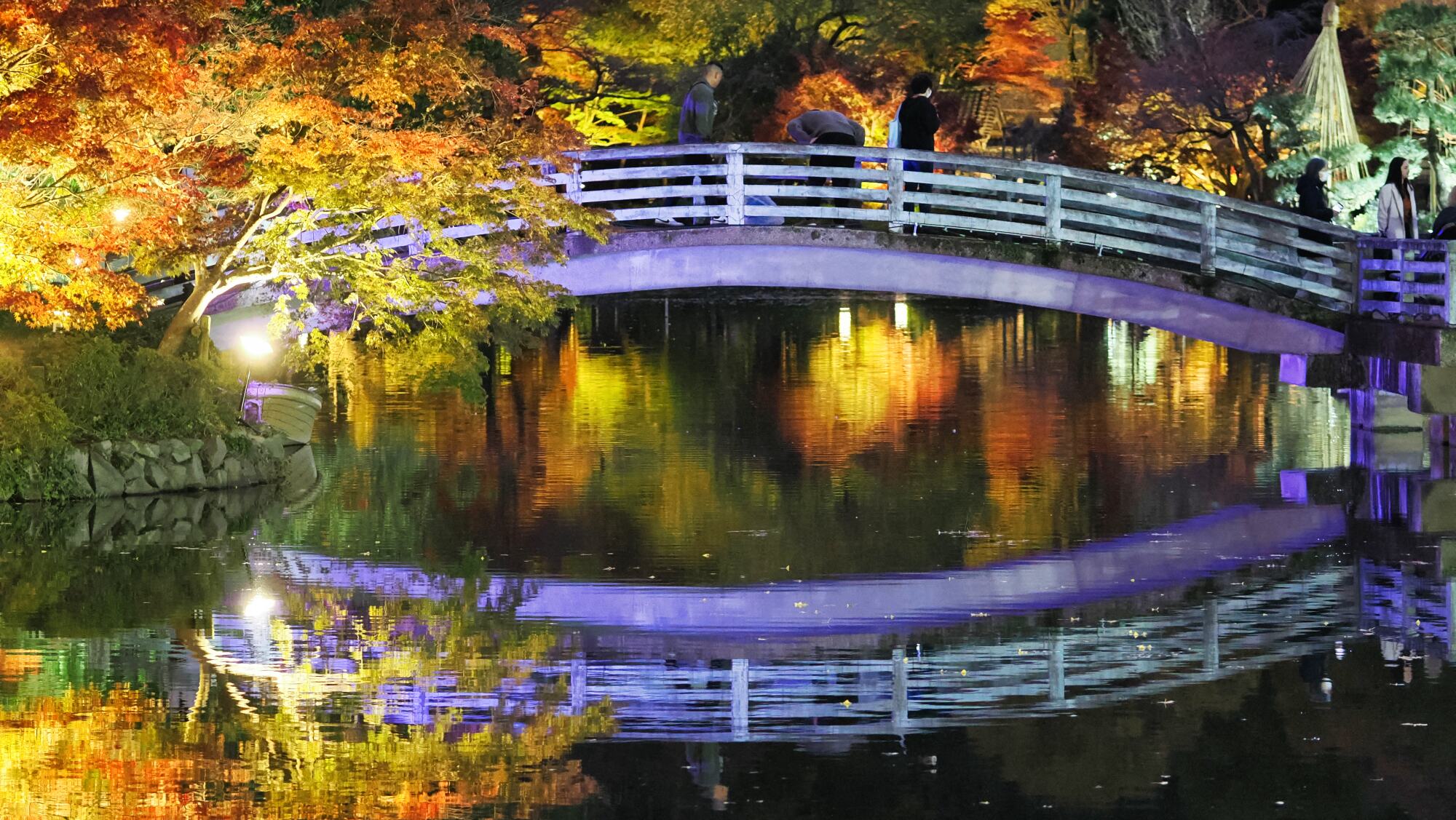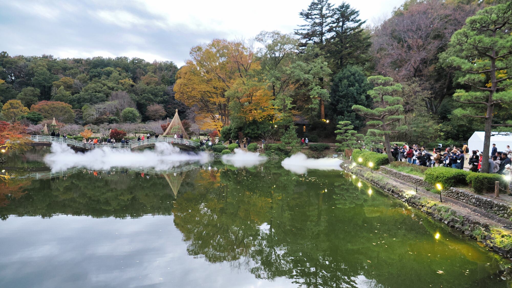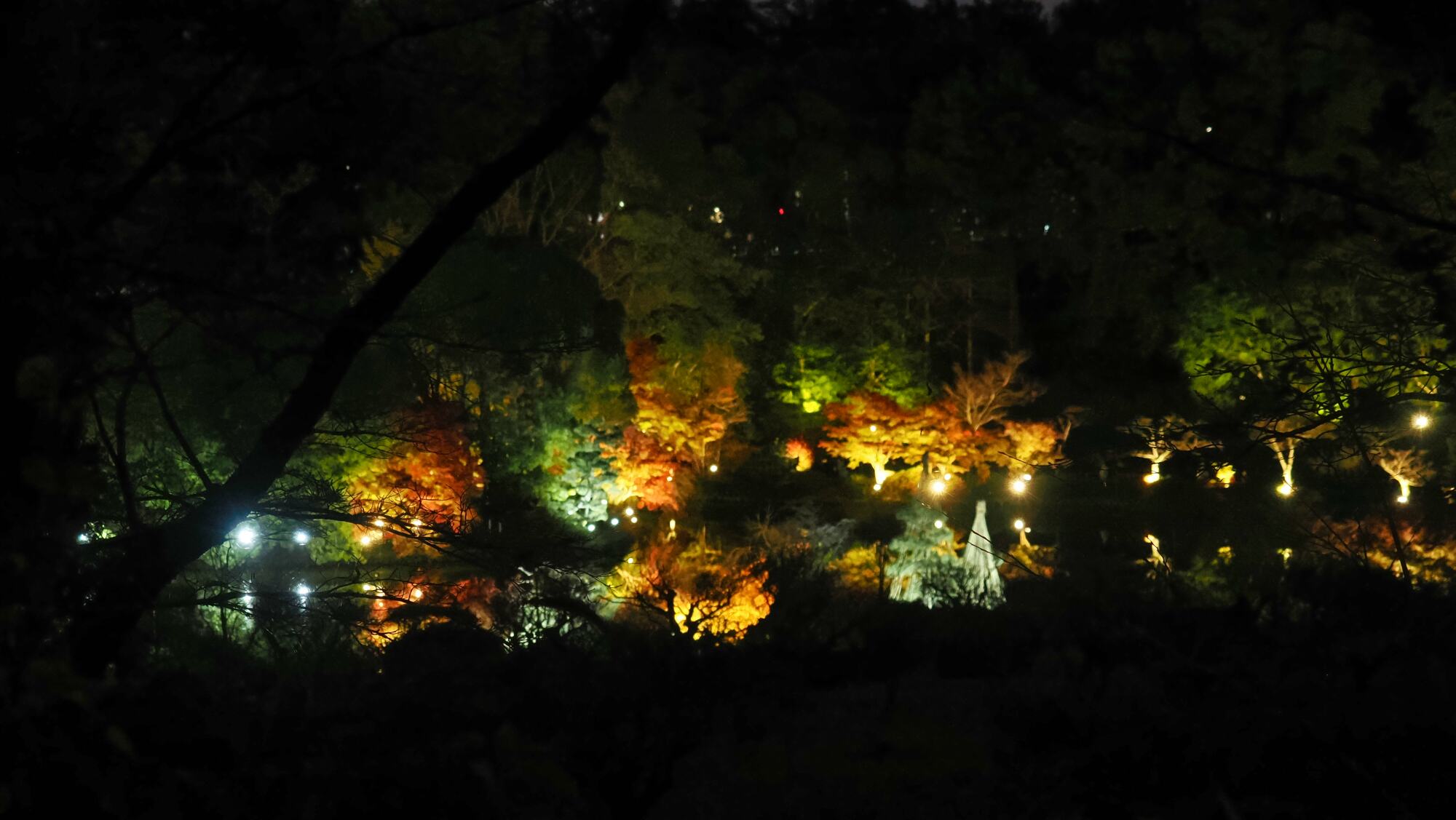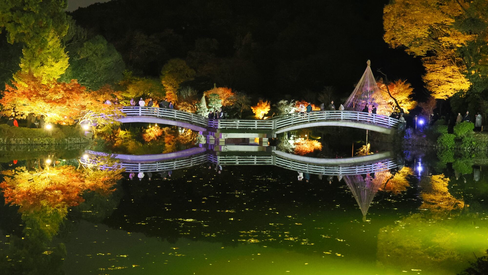 紅葉する木には黄色いライト、松の緑には青系のライト、太鼓橋は紫系のライトで照らされ公園側も様々な工夫をしている。