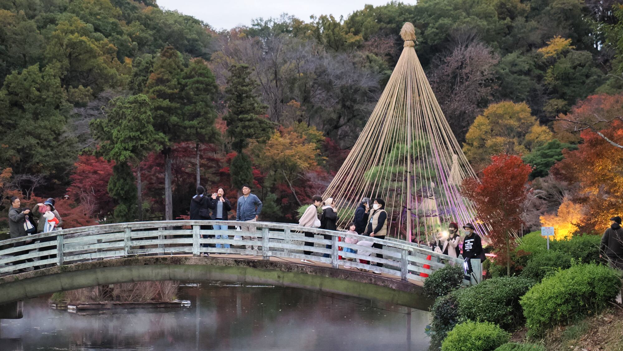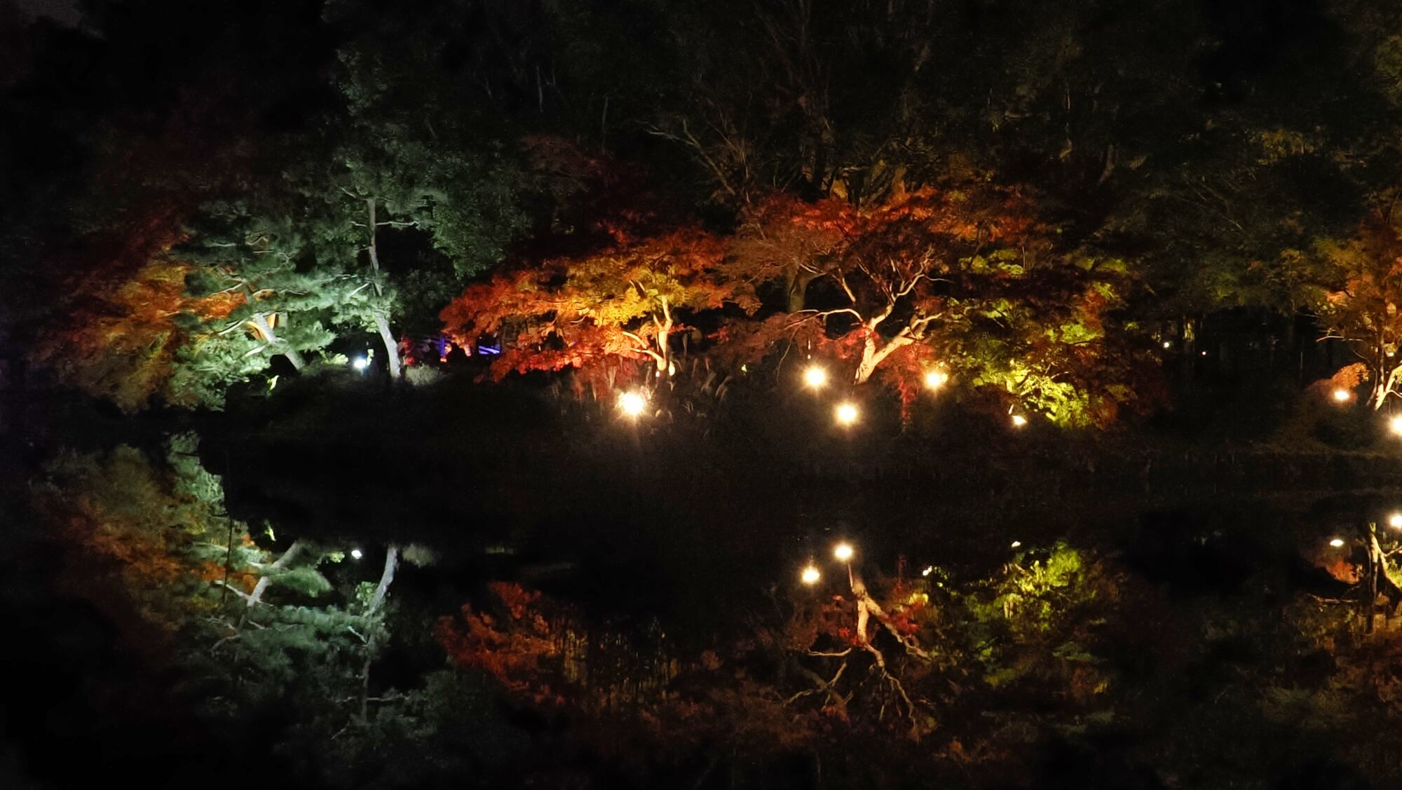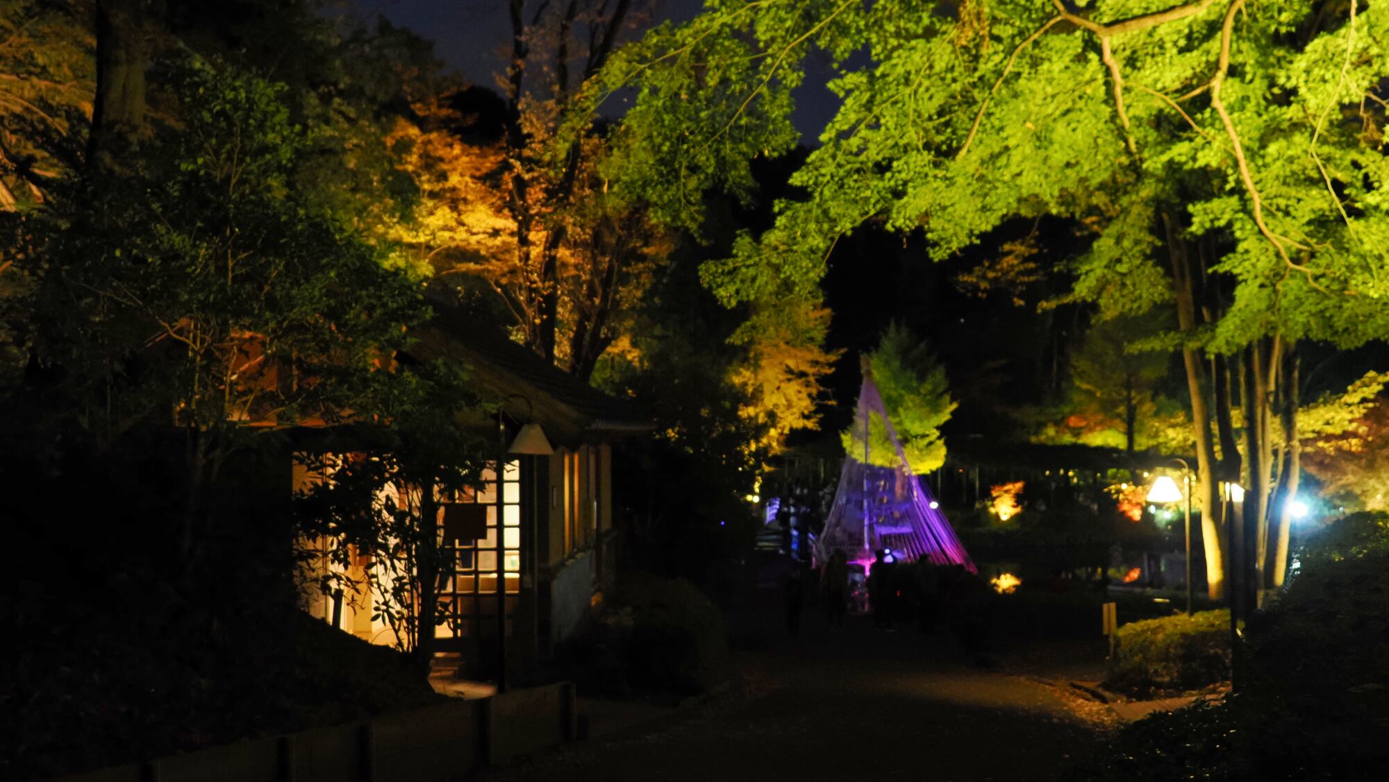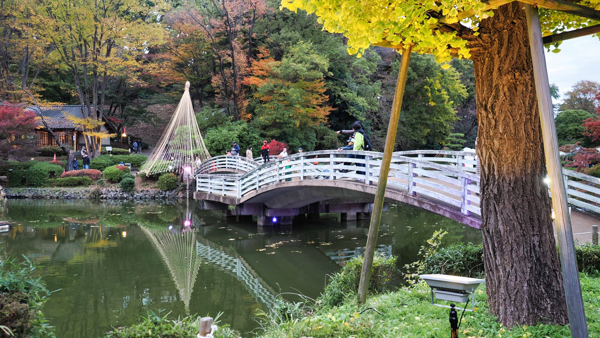紅葉する木には黄色いライト、松の緑には青系のライト、太鼓橋は紫系のライトで照らされ公園側も様々な工夫をしている。