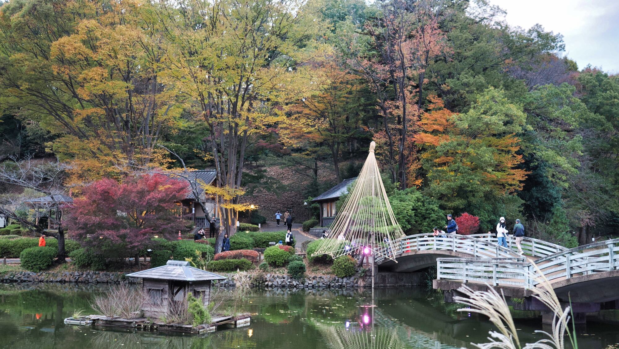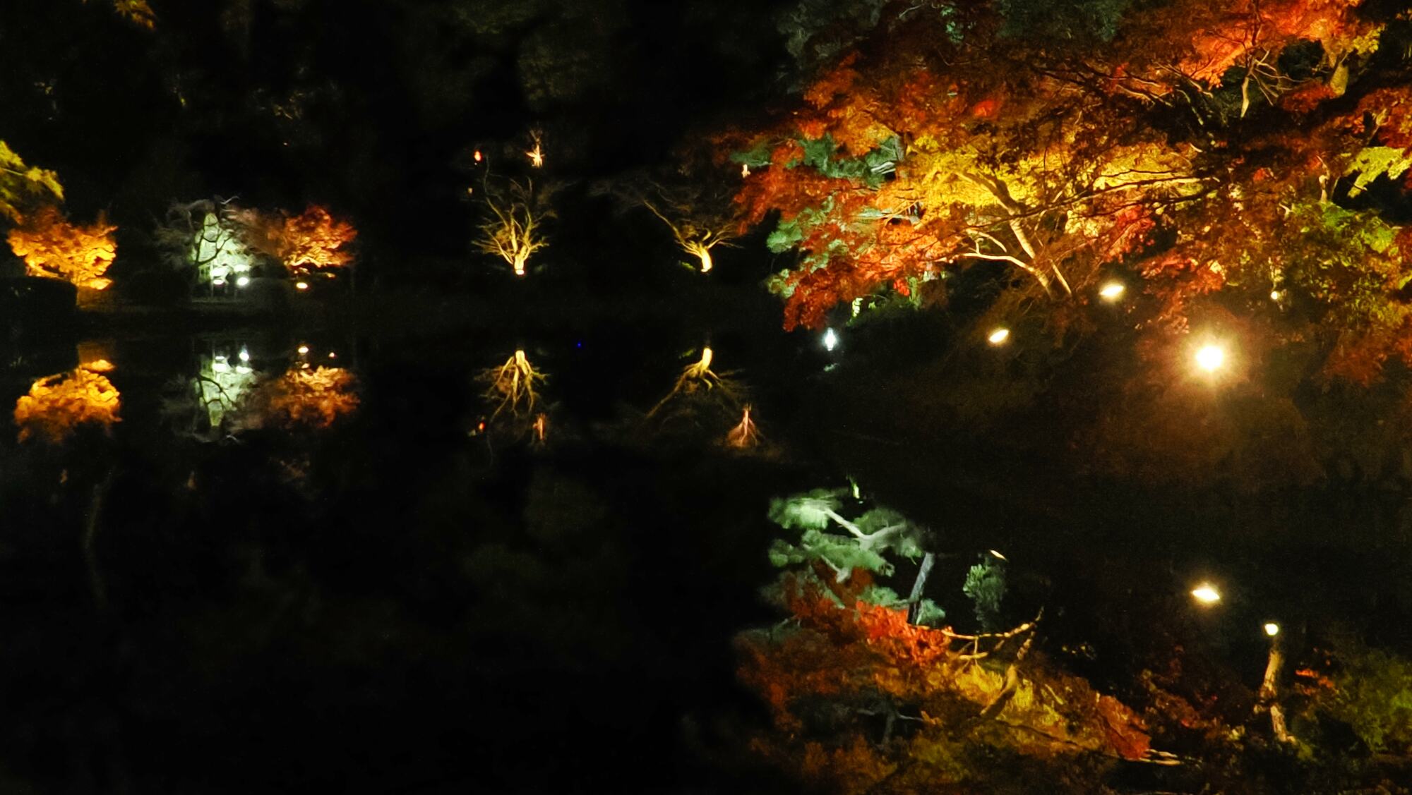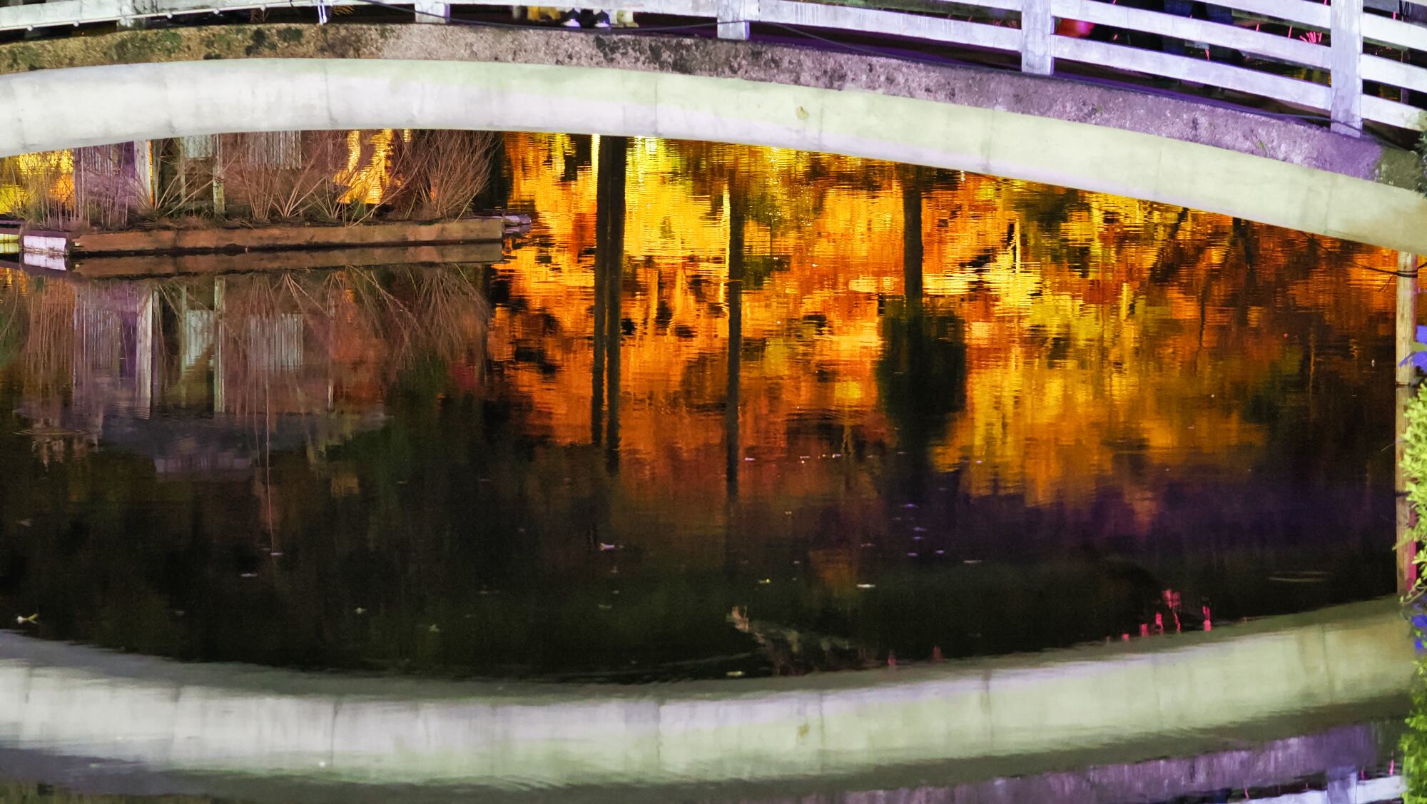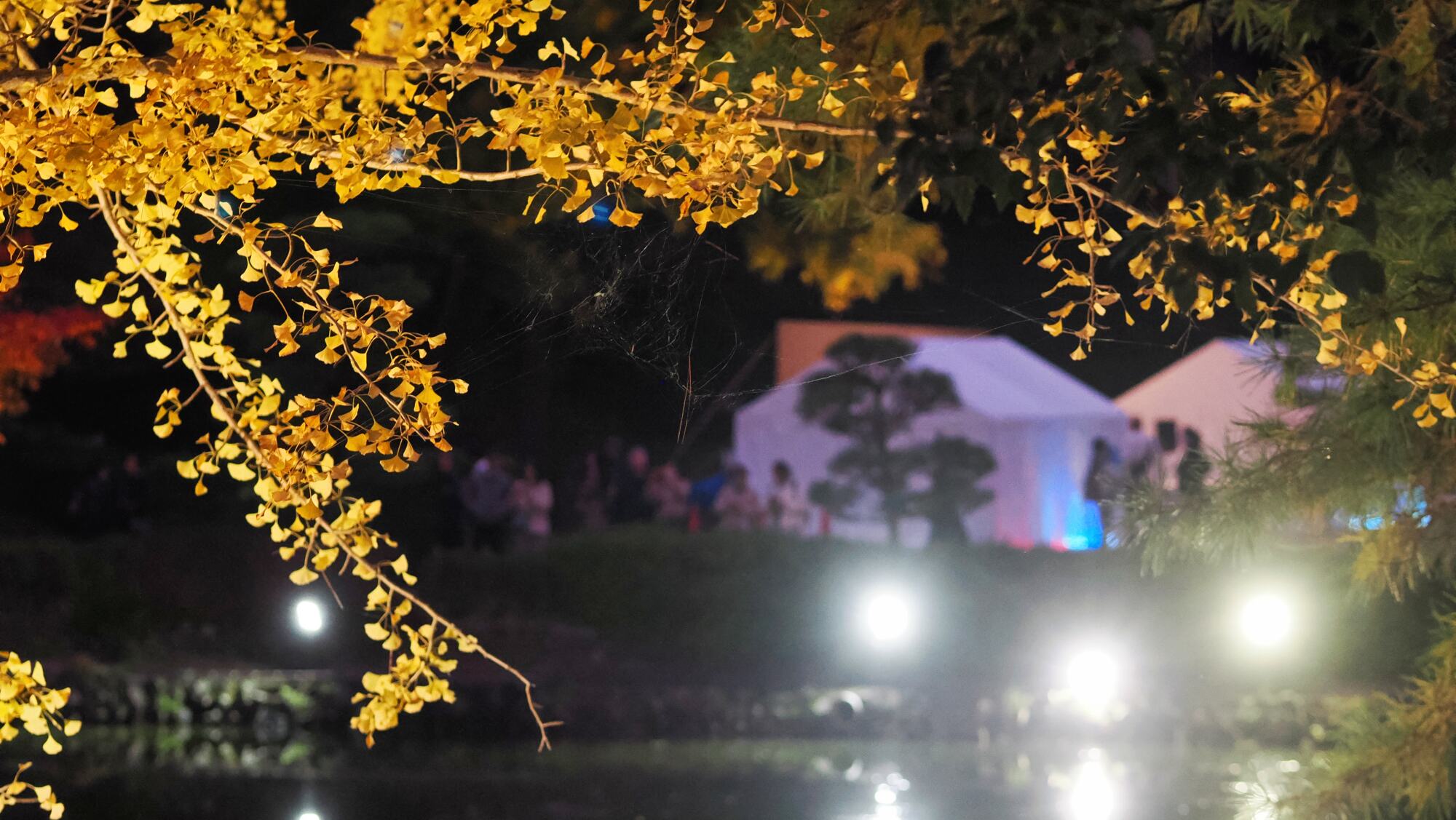 紅葉する木には黄色いライト、松の緑には青系のライト、太鼓橋は紫系のライトで照らされ公園側も様々な工夫をしている。
