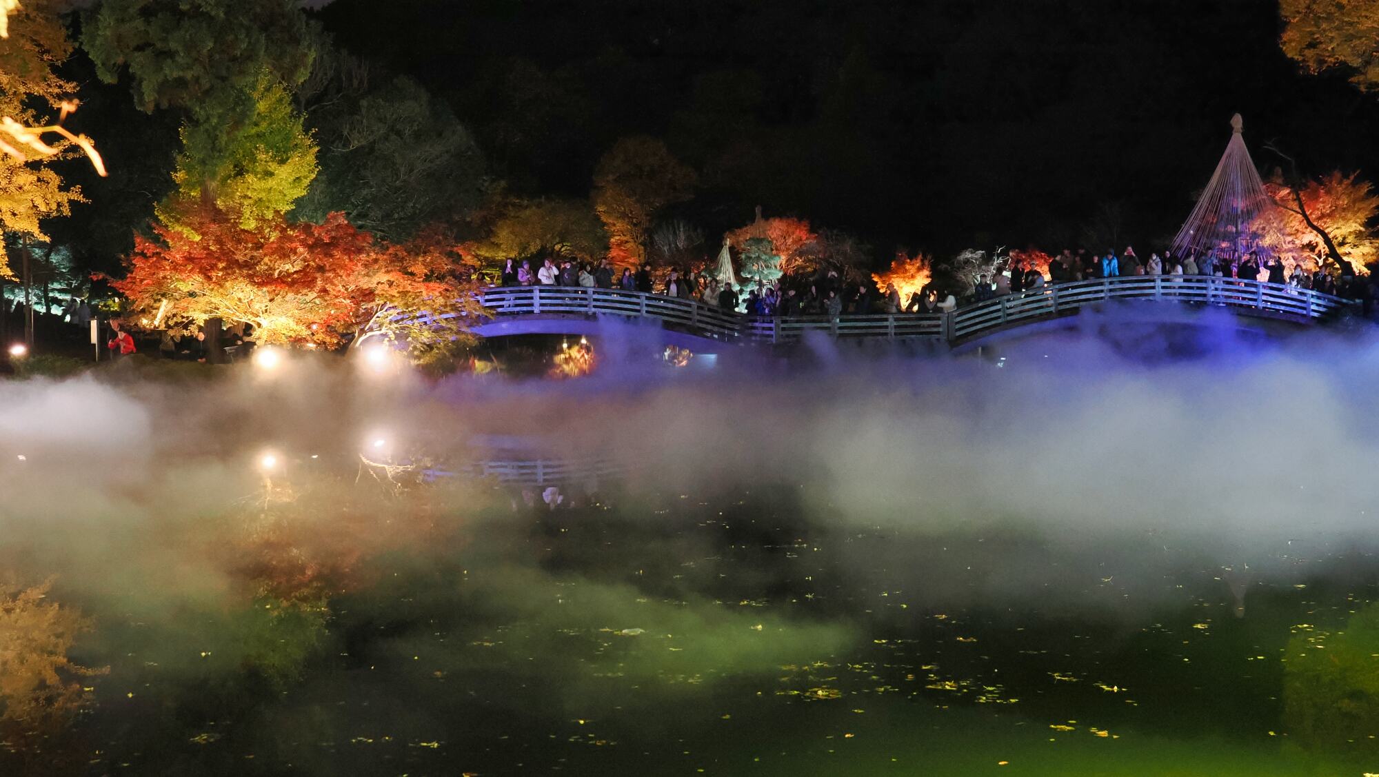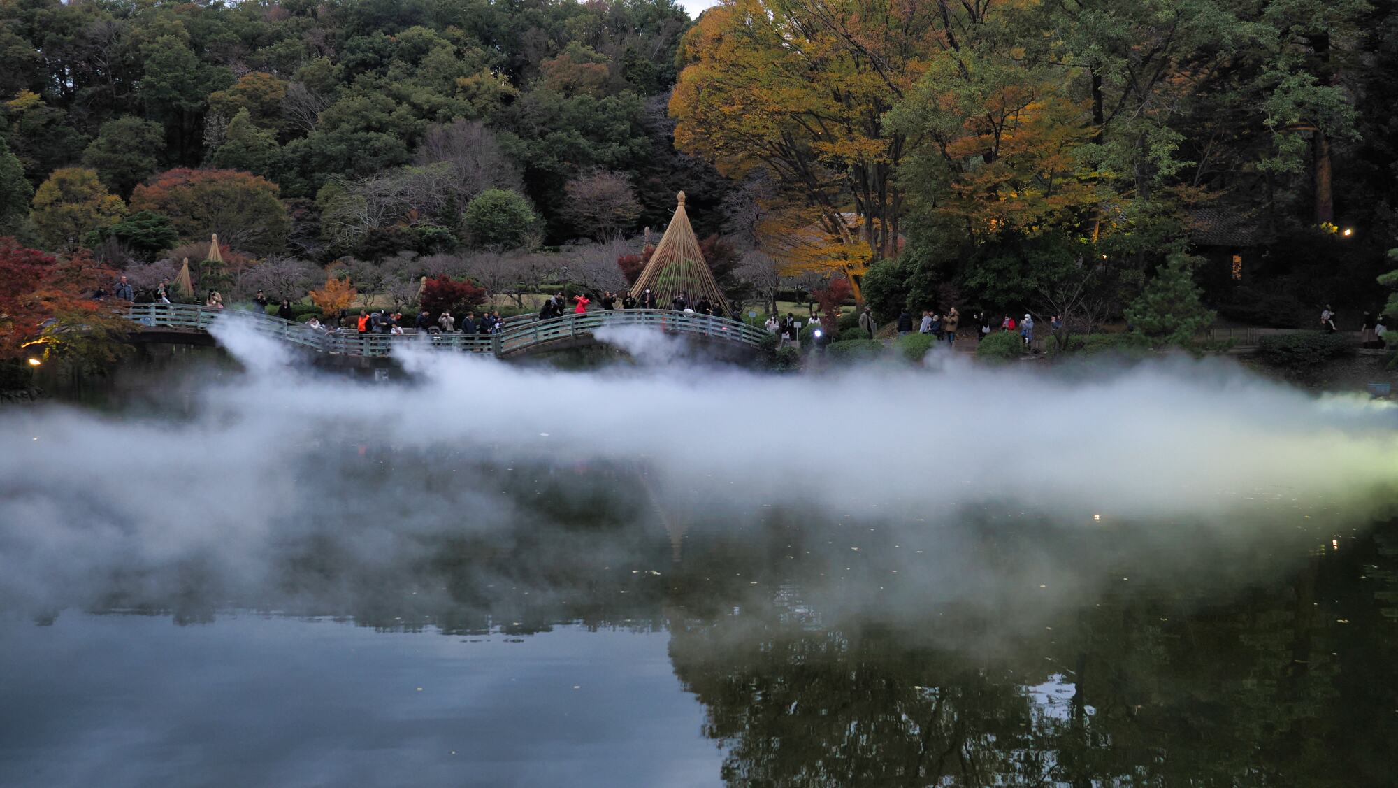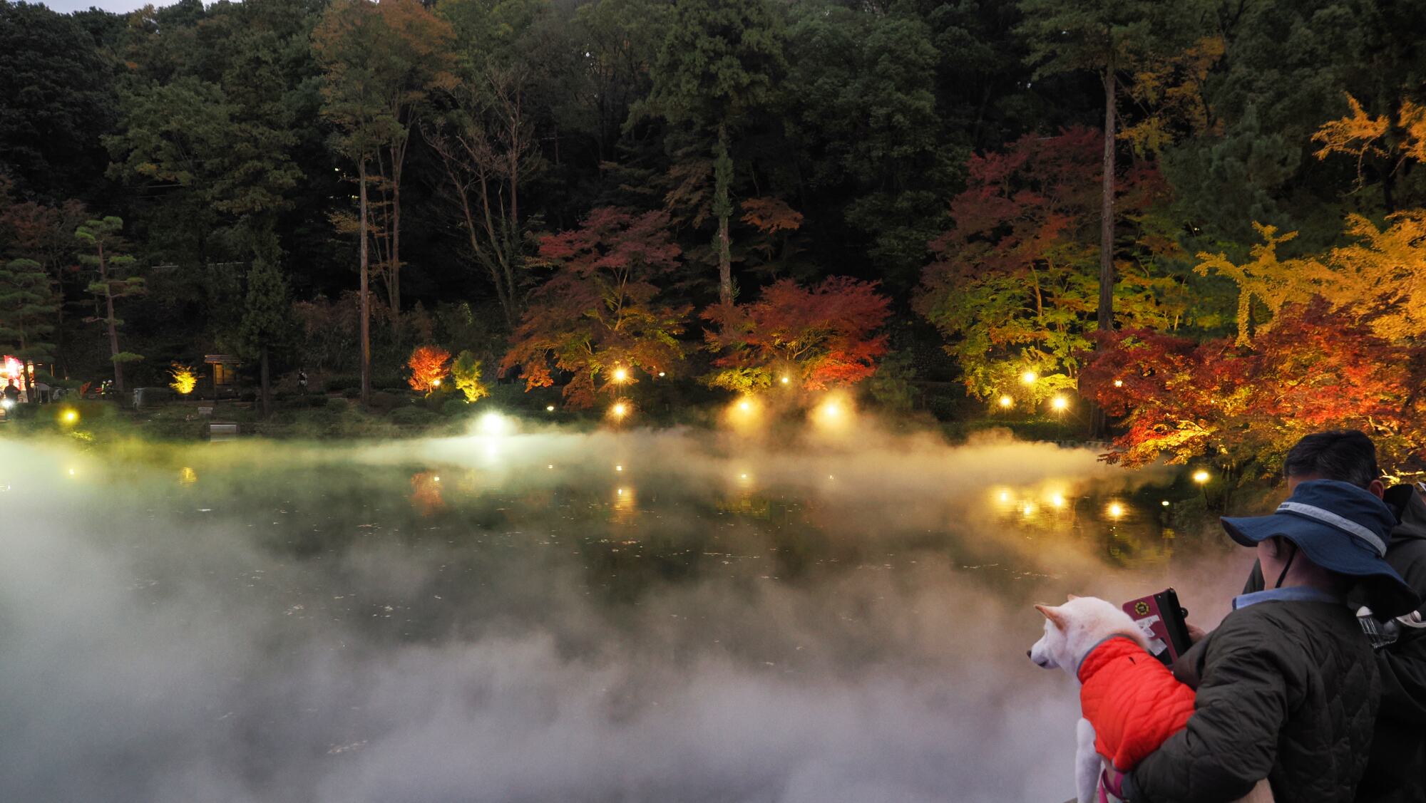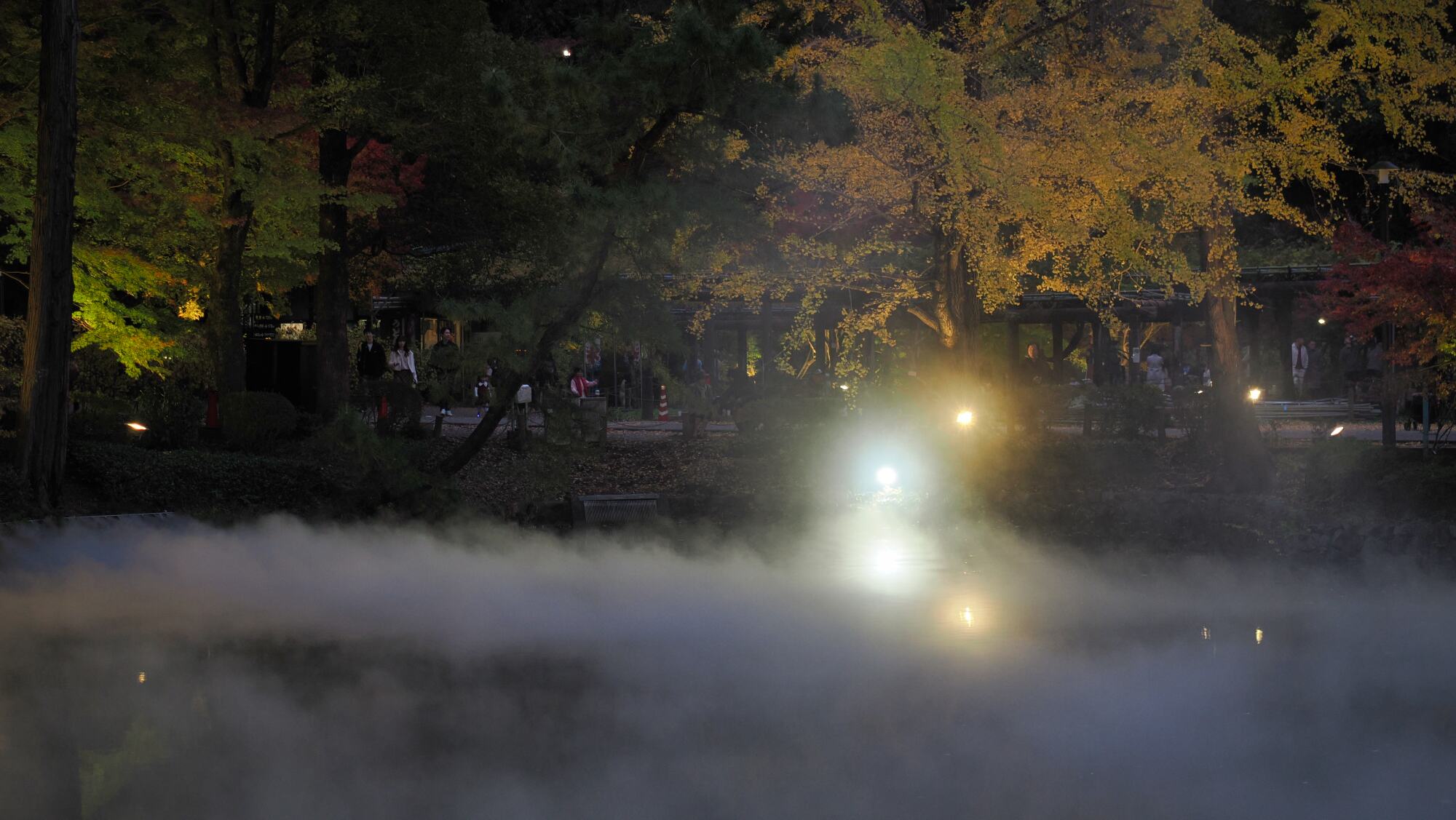 「薬師雲海」が現れるのは、紅葉まつりの期間中8時30分~16時30分の1時間に1度。太鼓橋周辺で、毎時30分に約10分ほどの演出が見られる。ライトアップ期間中は、昼間に加えて17時30分、18時30分、19時30分にも雲海が出現する。今回は日没前の16時30と日が落ちた17時30分の2度撮影をした。