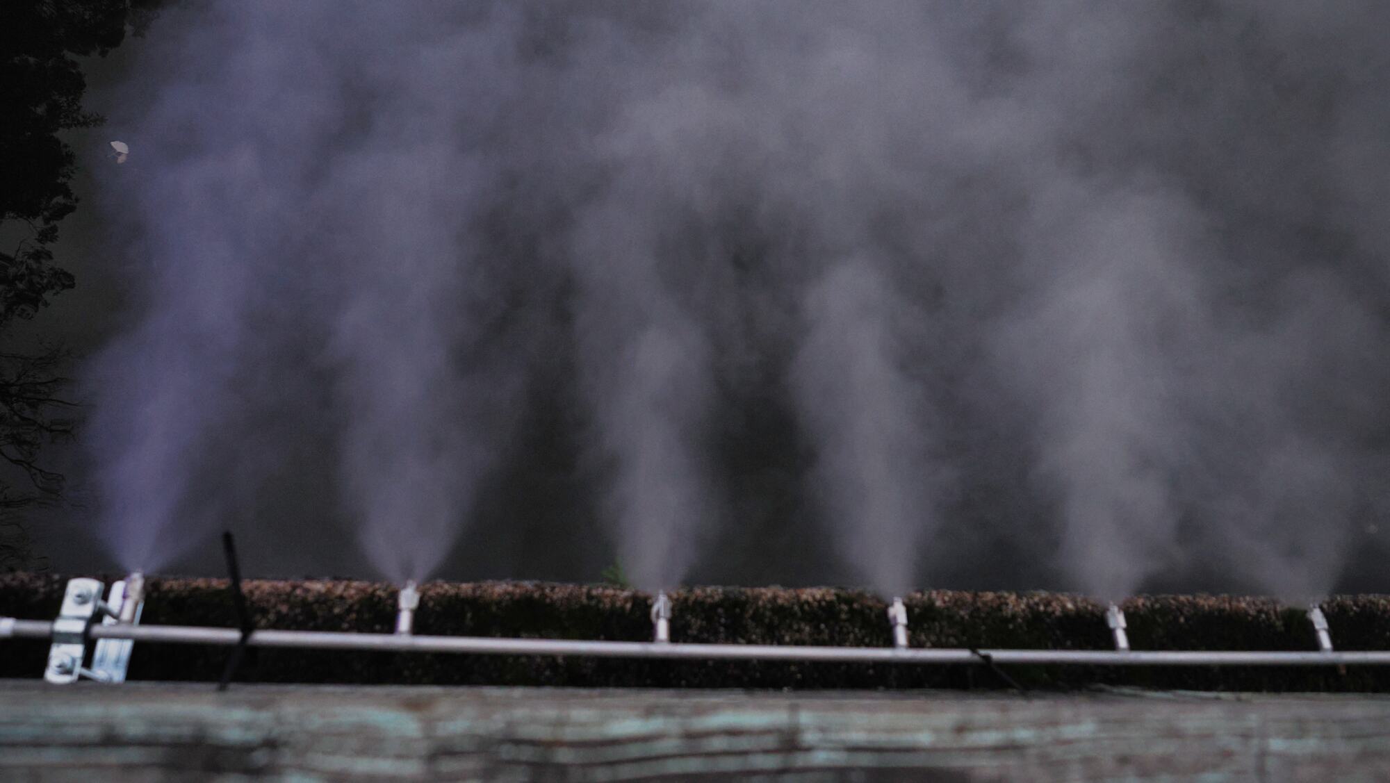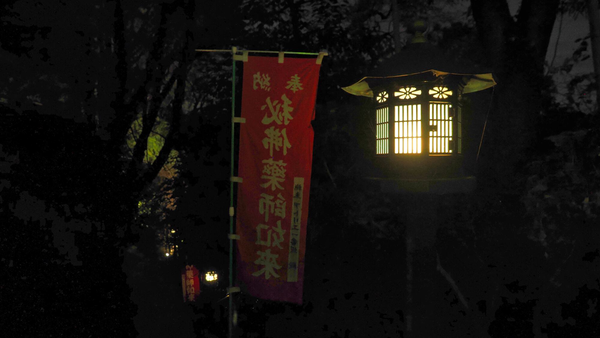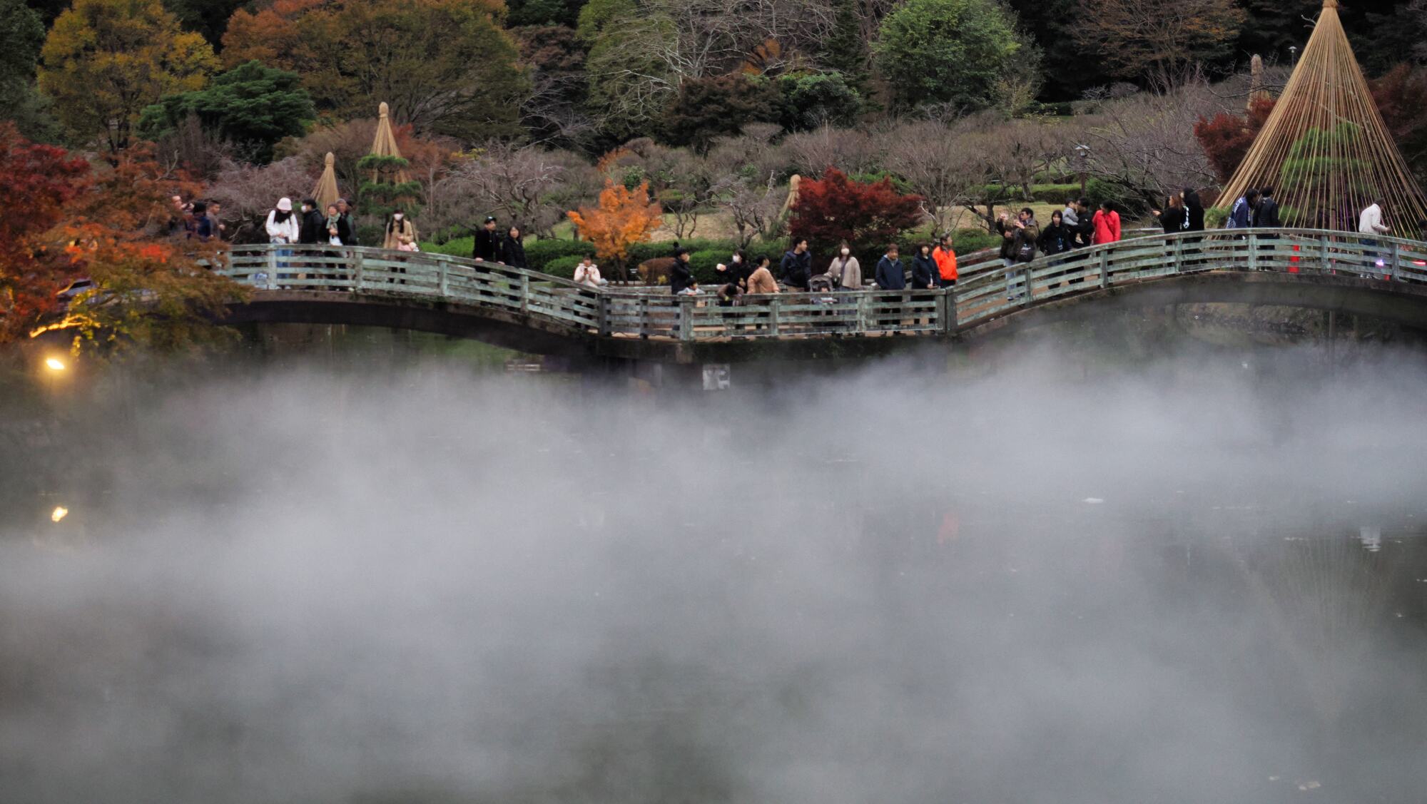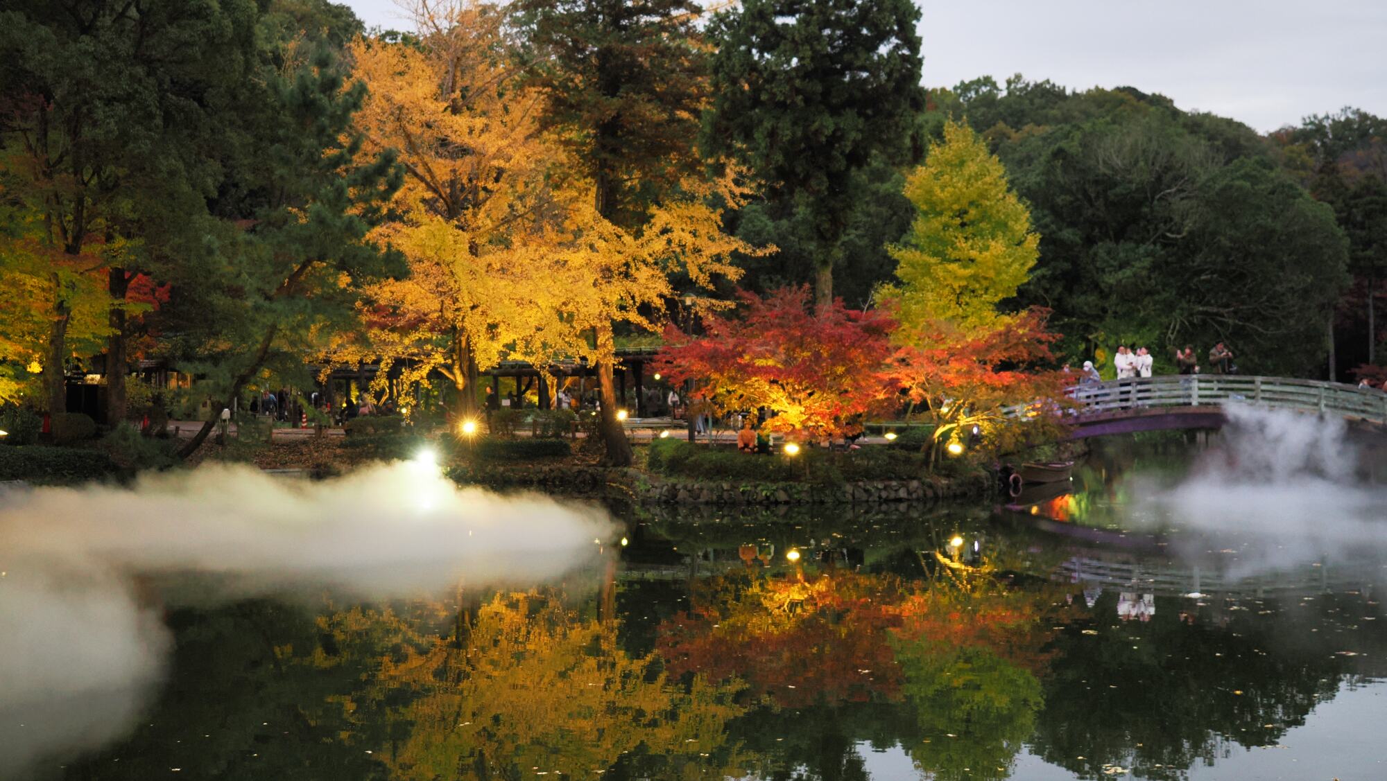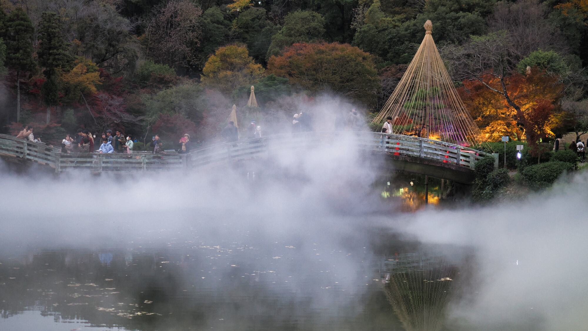 「薬師雲海」が現れるのは、紅葉まつりの期間中8時30分~16時30分の1時間に1度。太鼓橋周辺で、毎時30分に約10分ほどの演出が見られる。ライトアップ期間中は、昼間に加えて17時30分、18時30分、19時30分にも雲海が出現する。今回は日没前の16時30と日が落ちた17時30分の2度撮影をした。