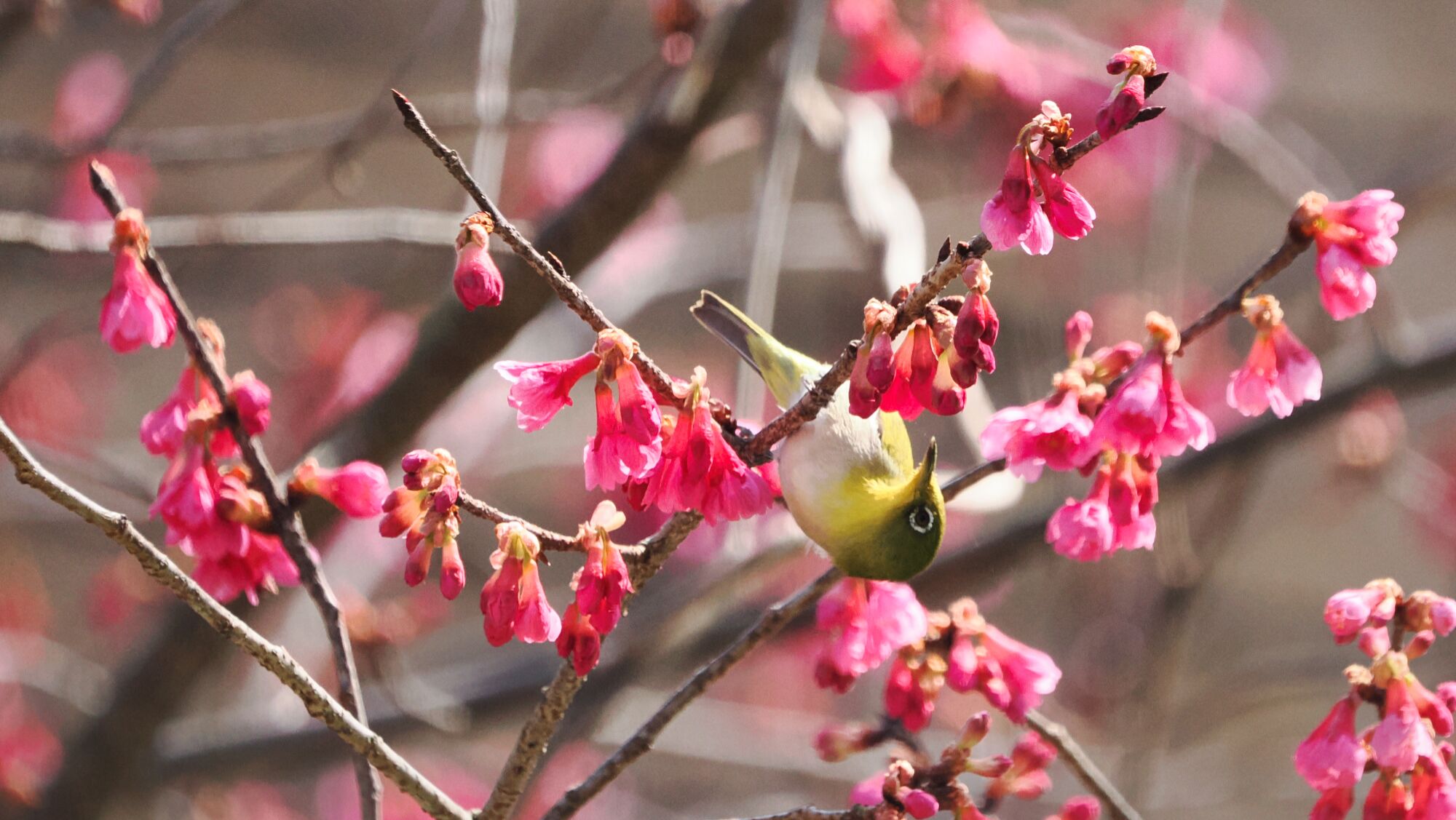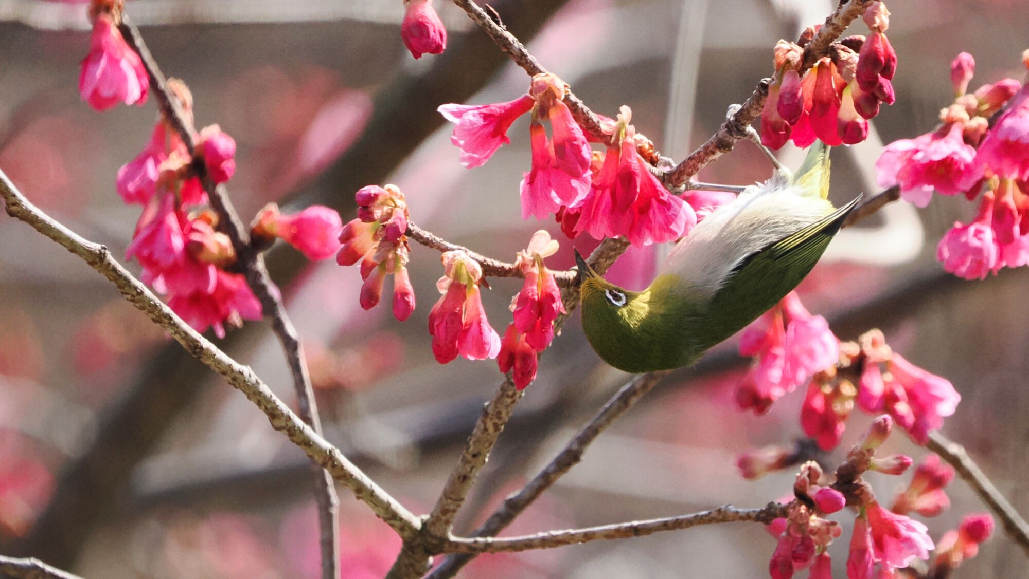 蓮田の4ケ所の熱海寒桜は5分咲、近くの河津桜には例年通りメジロが来ていた。