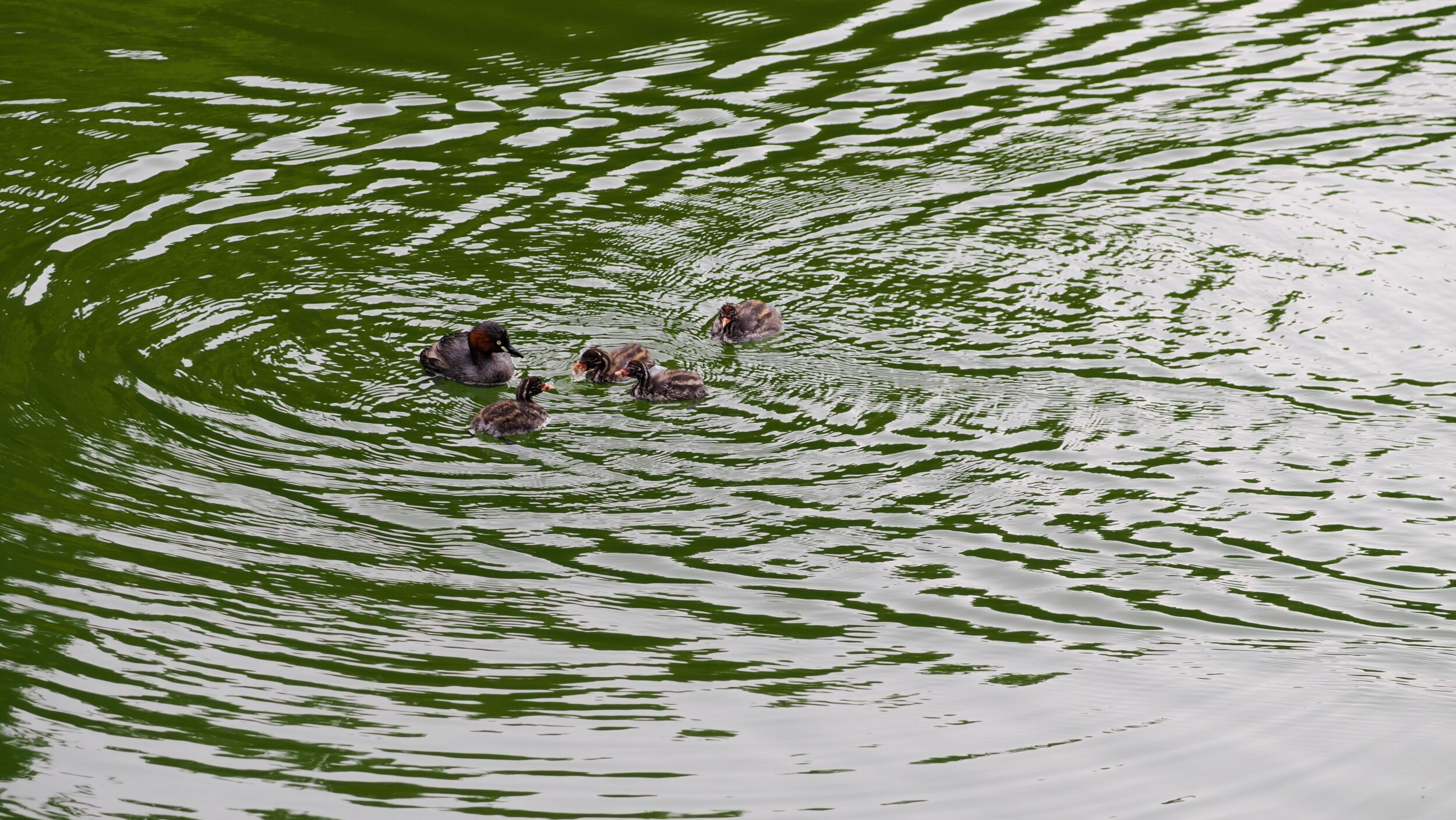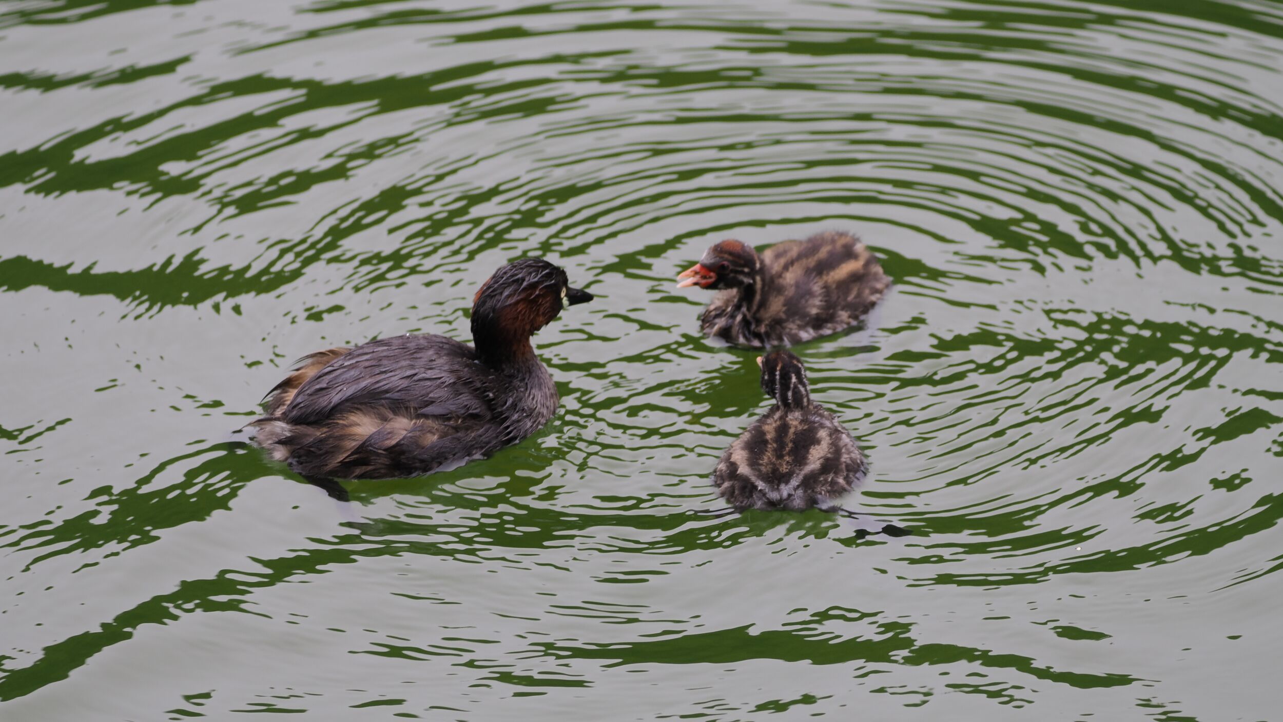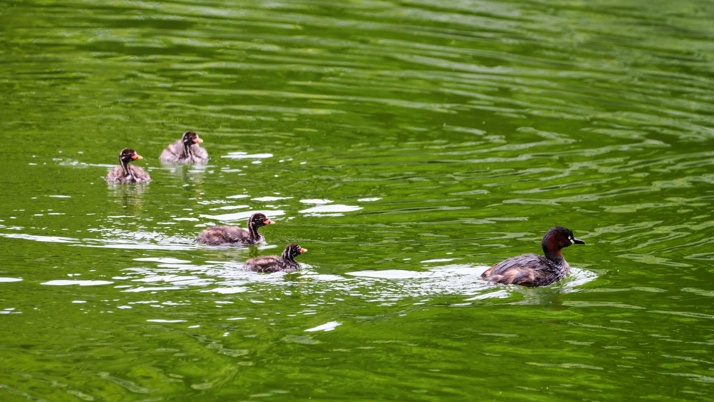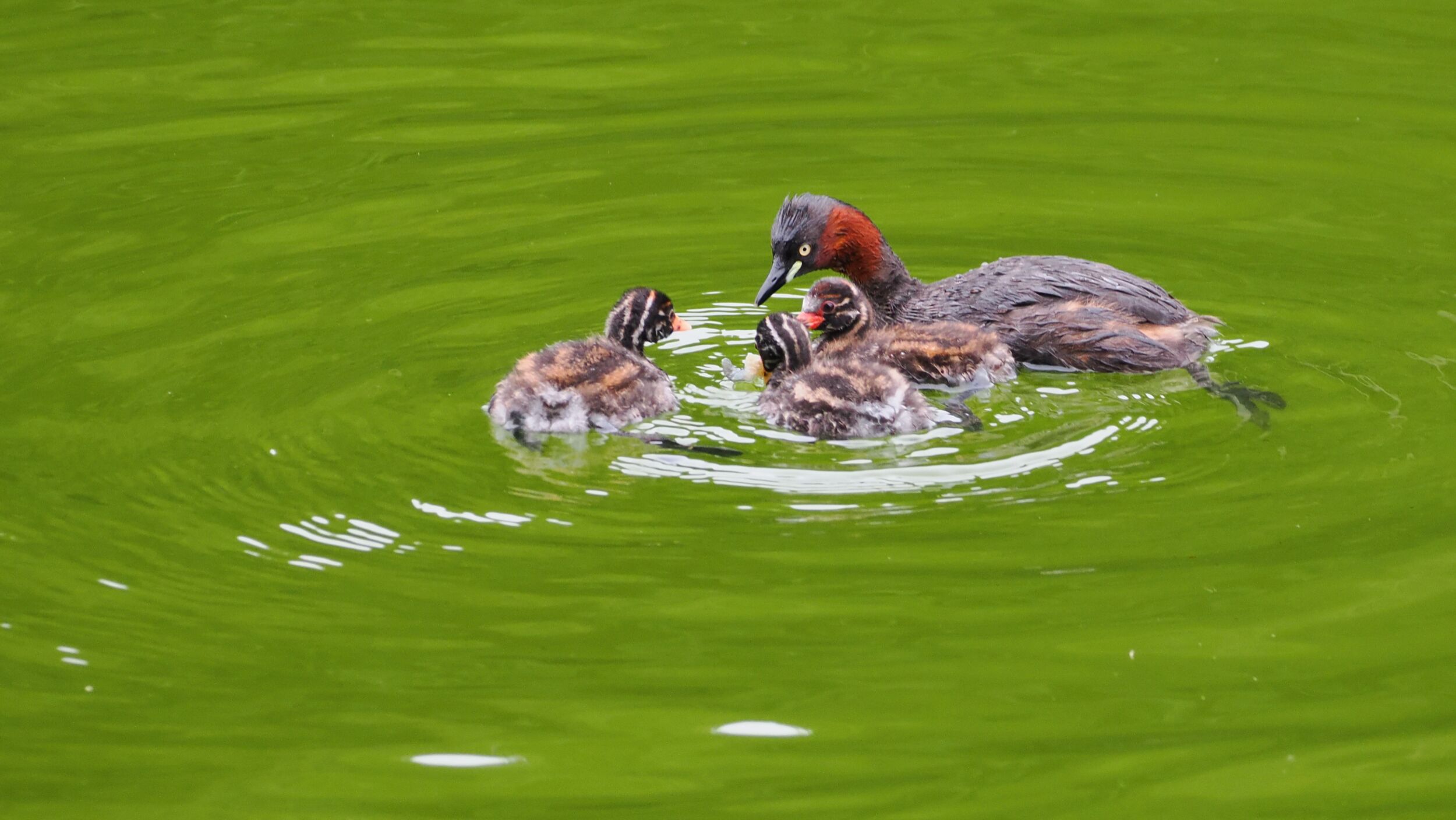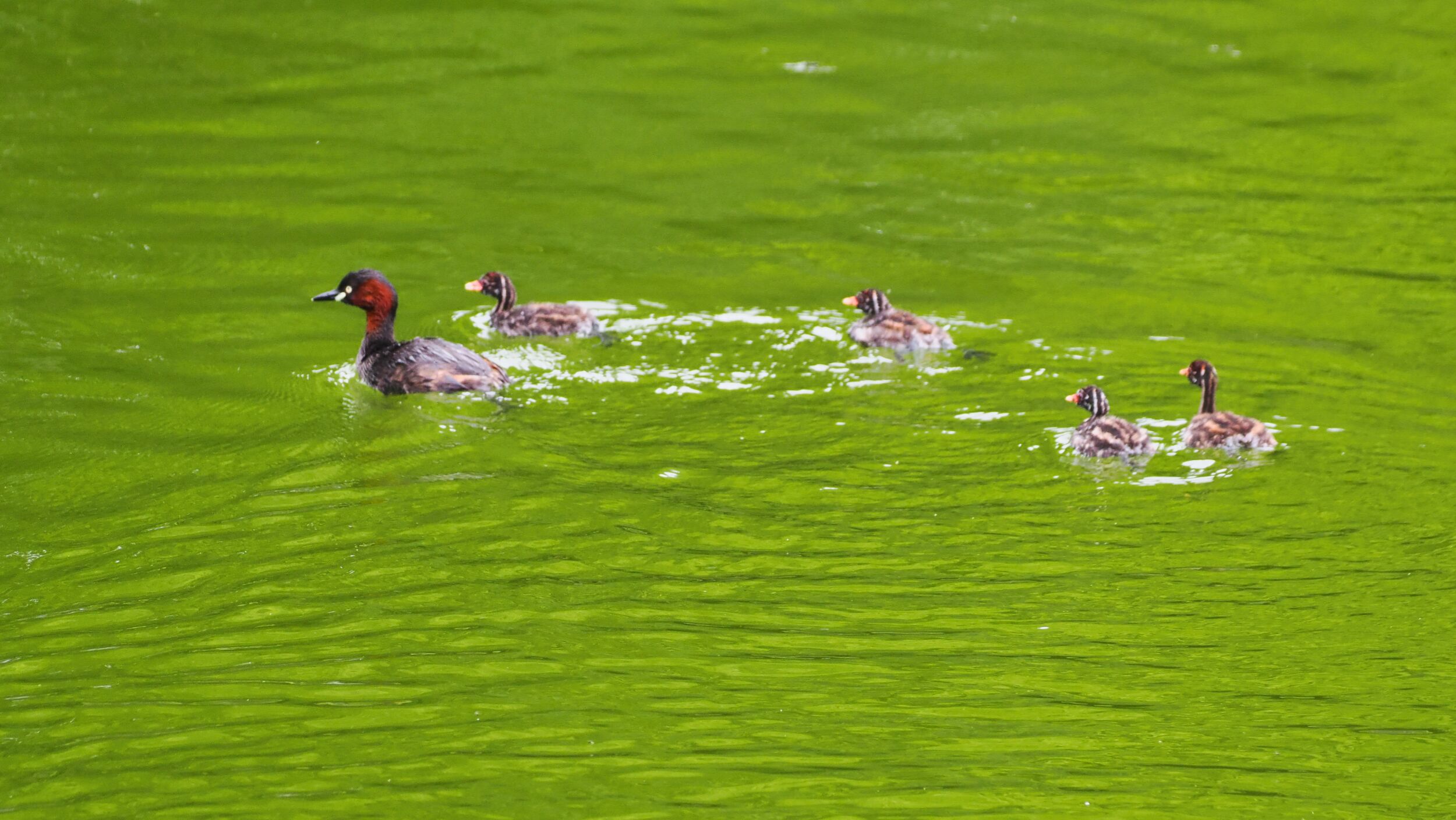 薬師池はプランクトンのために水が周囲の緑りを映したような緑色に染まって、4羽のカイツブリの雛がピヨピヨと親鳥に餌をねだっていた。親も大変と思いながら自分の子育ての頃を思い出した。