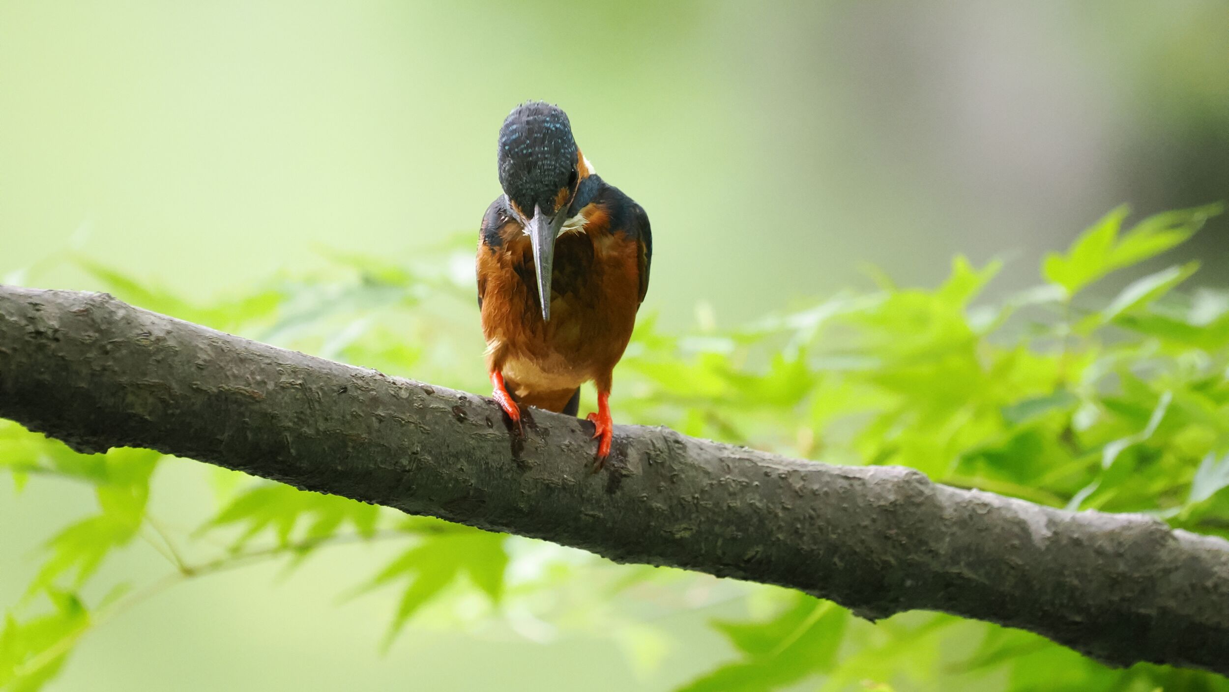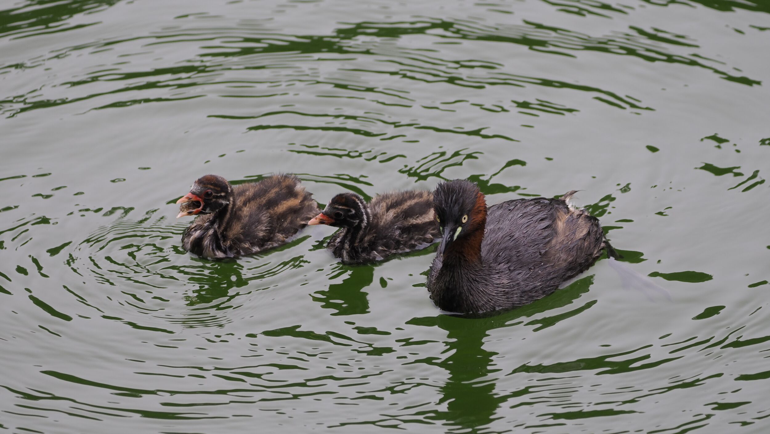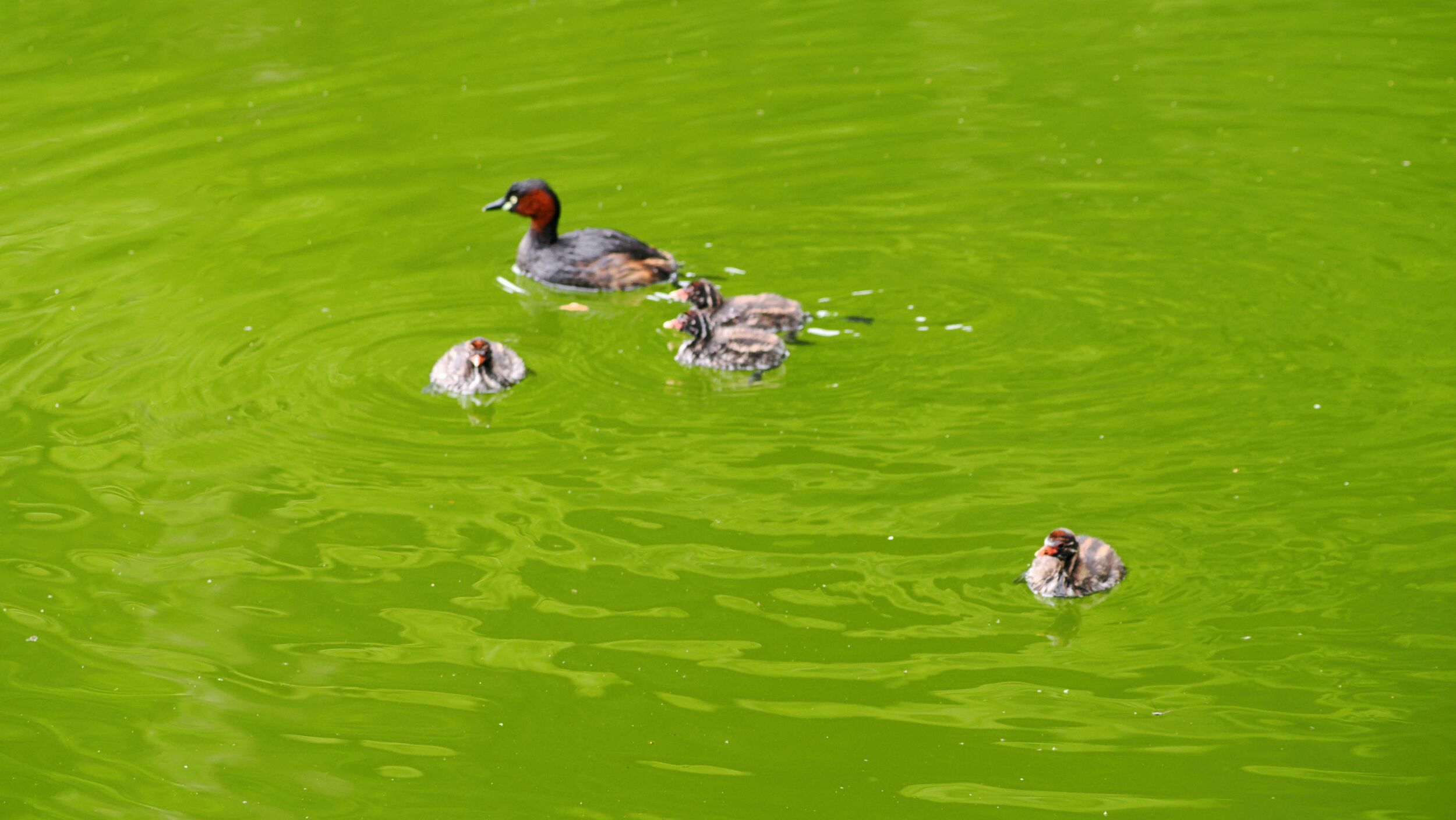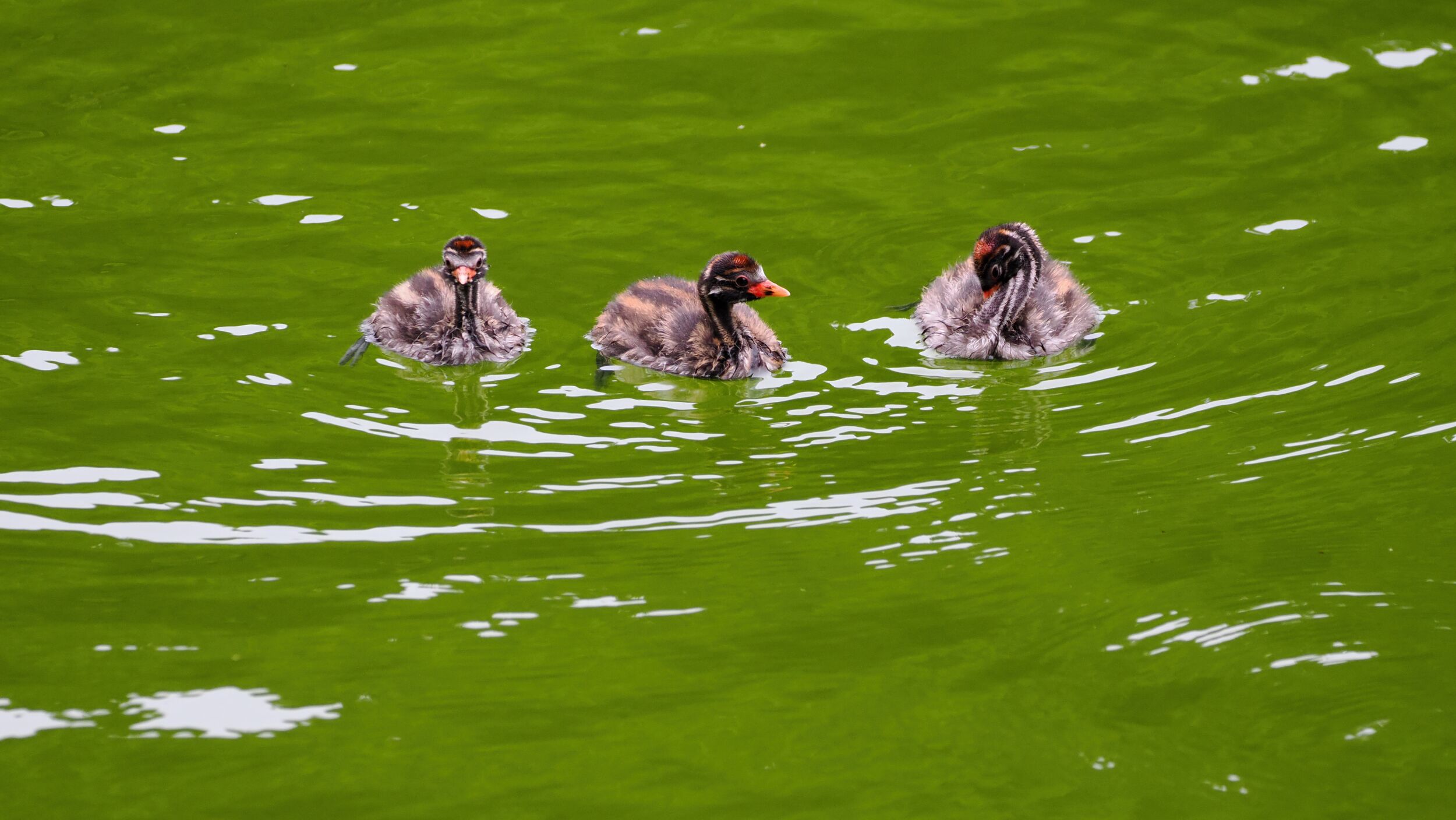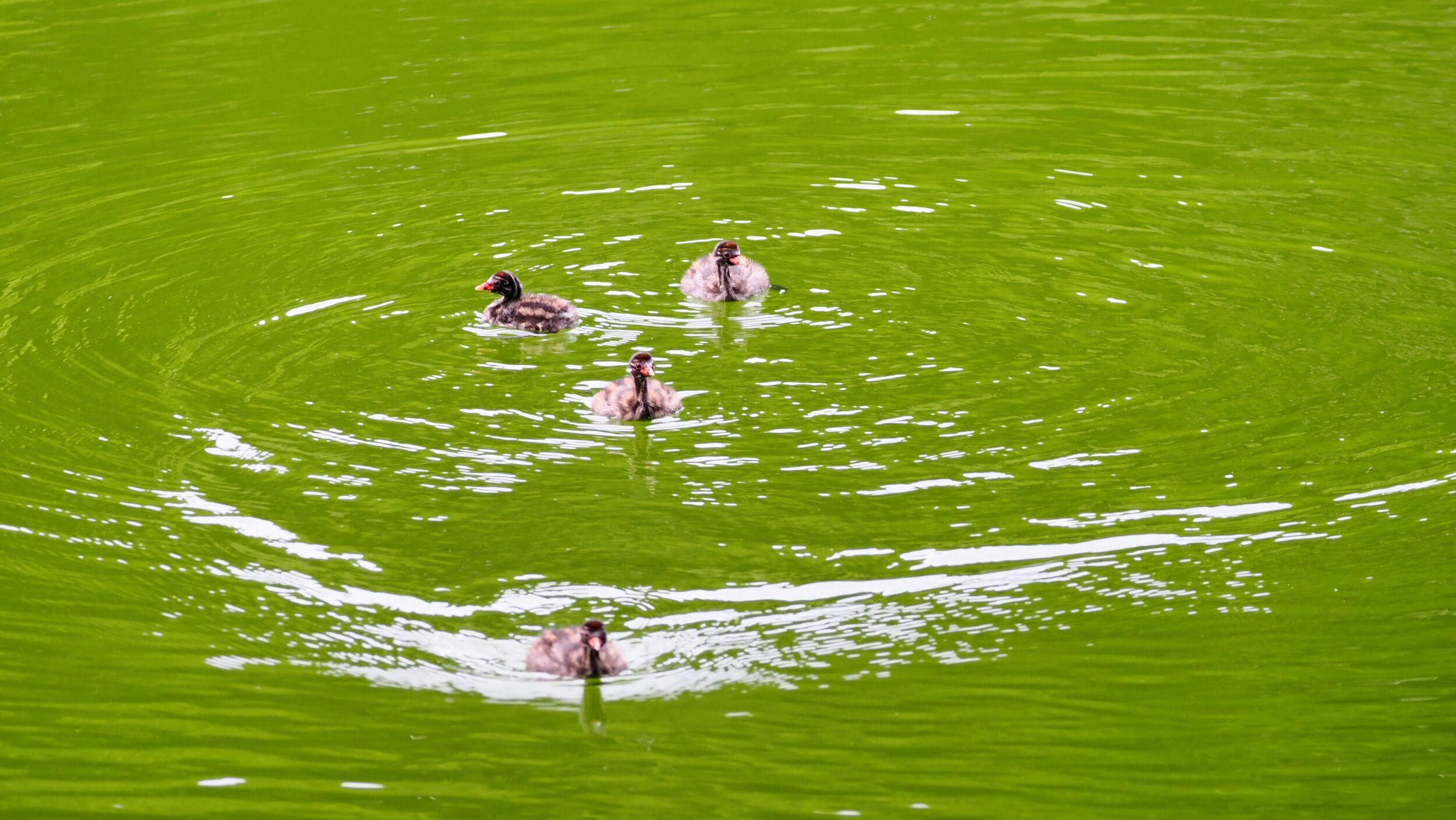 薬師池はプランクトンのために水が周囲の緑りを映したような緑色に染まって、4羽のカイツブリの雛がピヨピヨと親鳥に餌をねだっていた。親も大変と思いながら自分の子育ての頃を思い出した。
