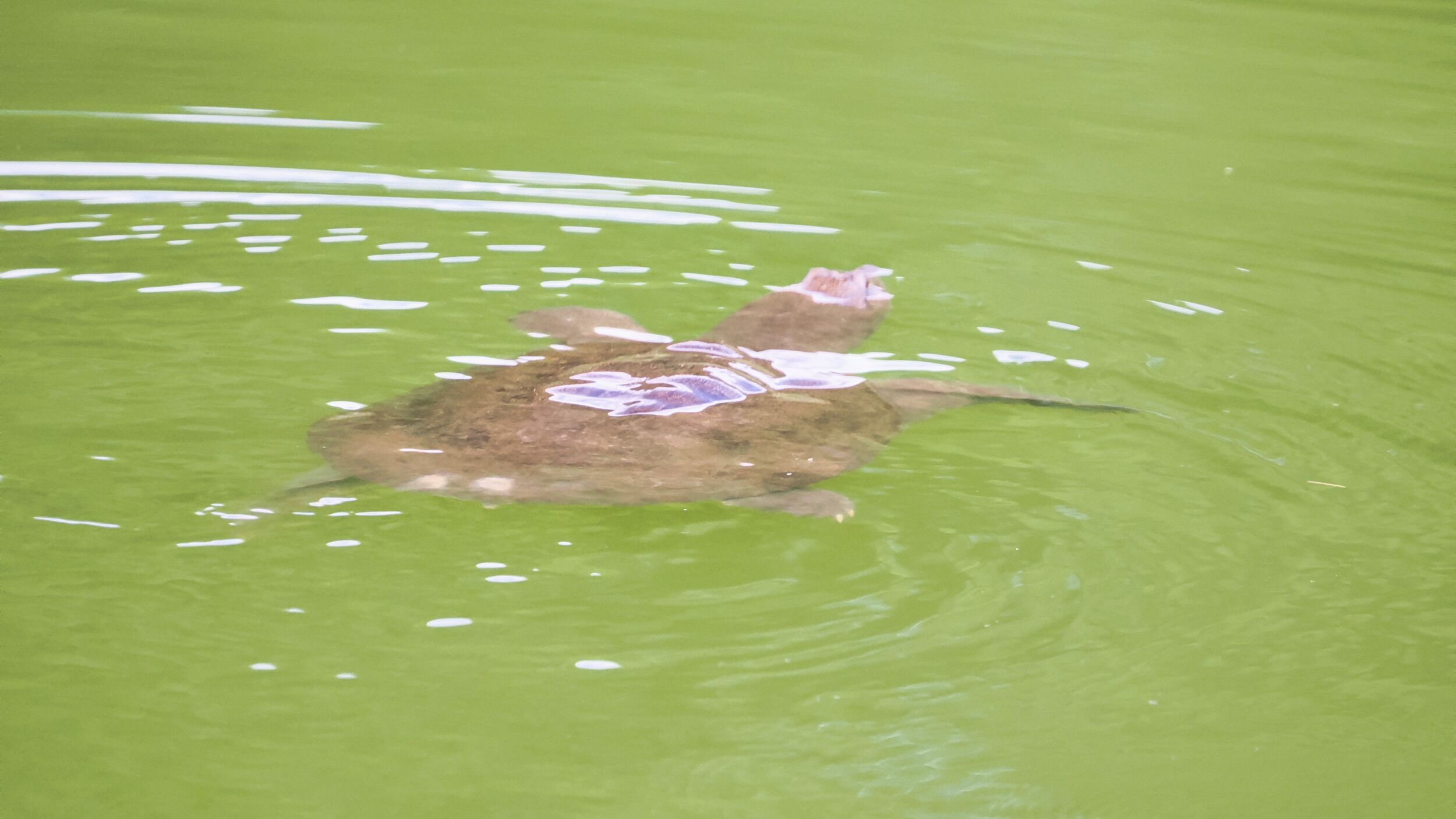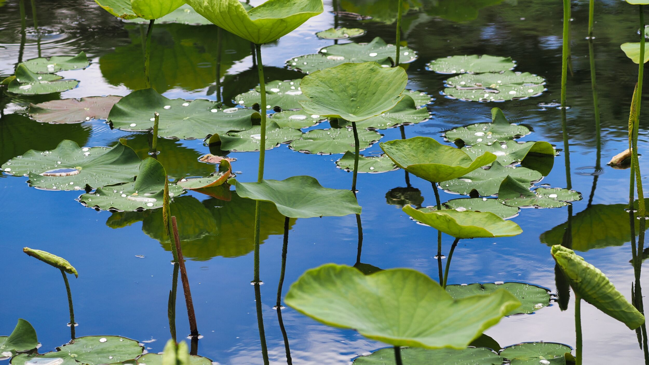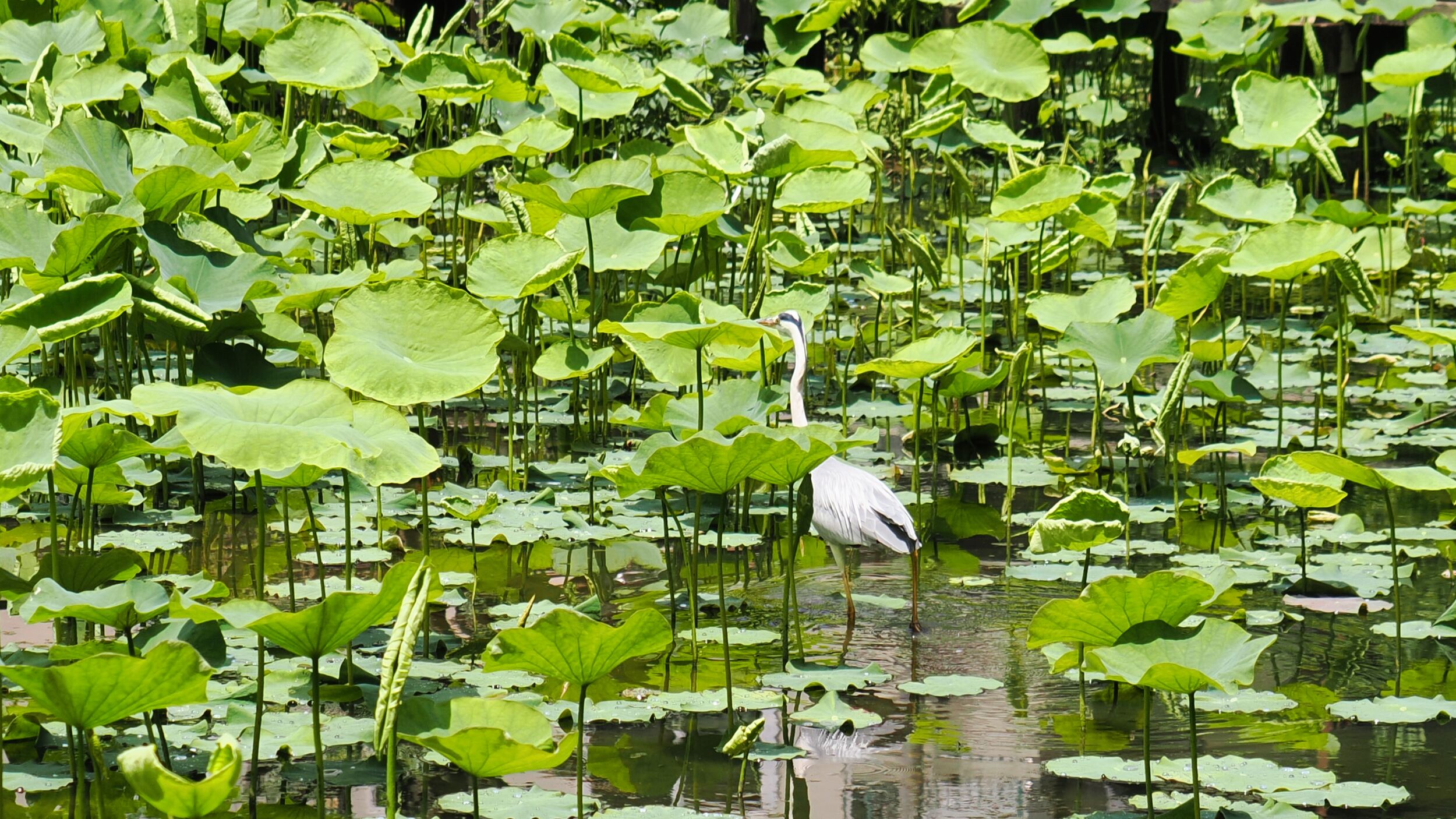 蓮田の大賀ハスの葉が大きく揺れて、水面が盛り上がってきたのでスッポンかなと思ったらカエルだった。ウシガエルかもしれない。