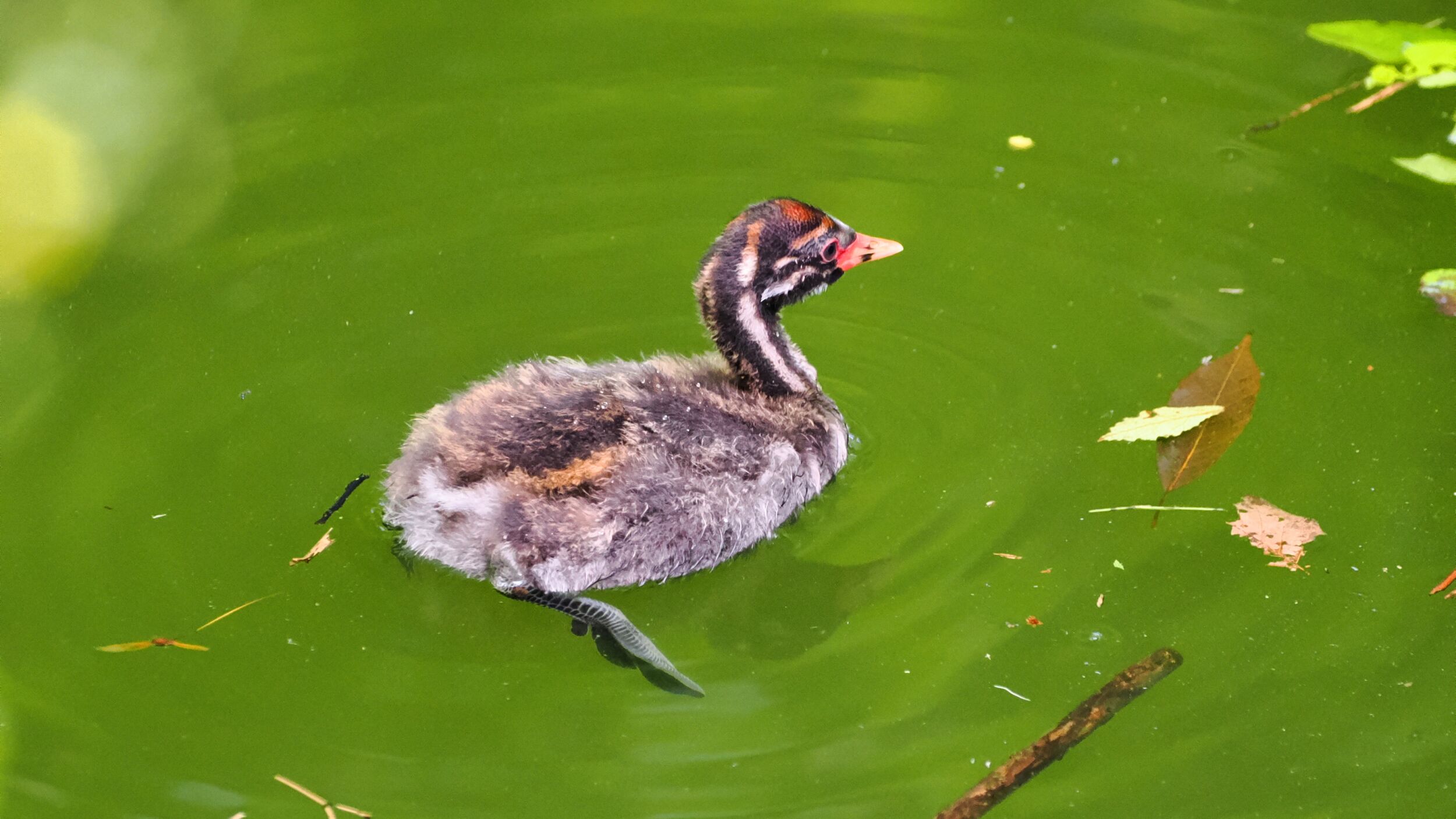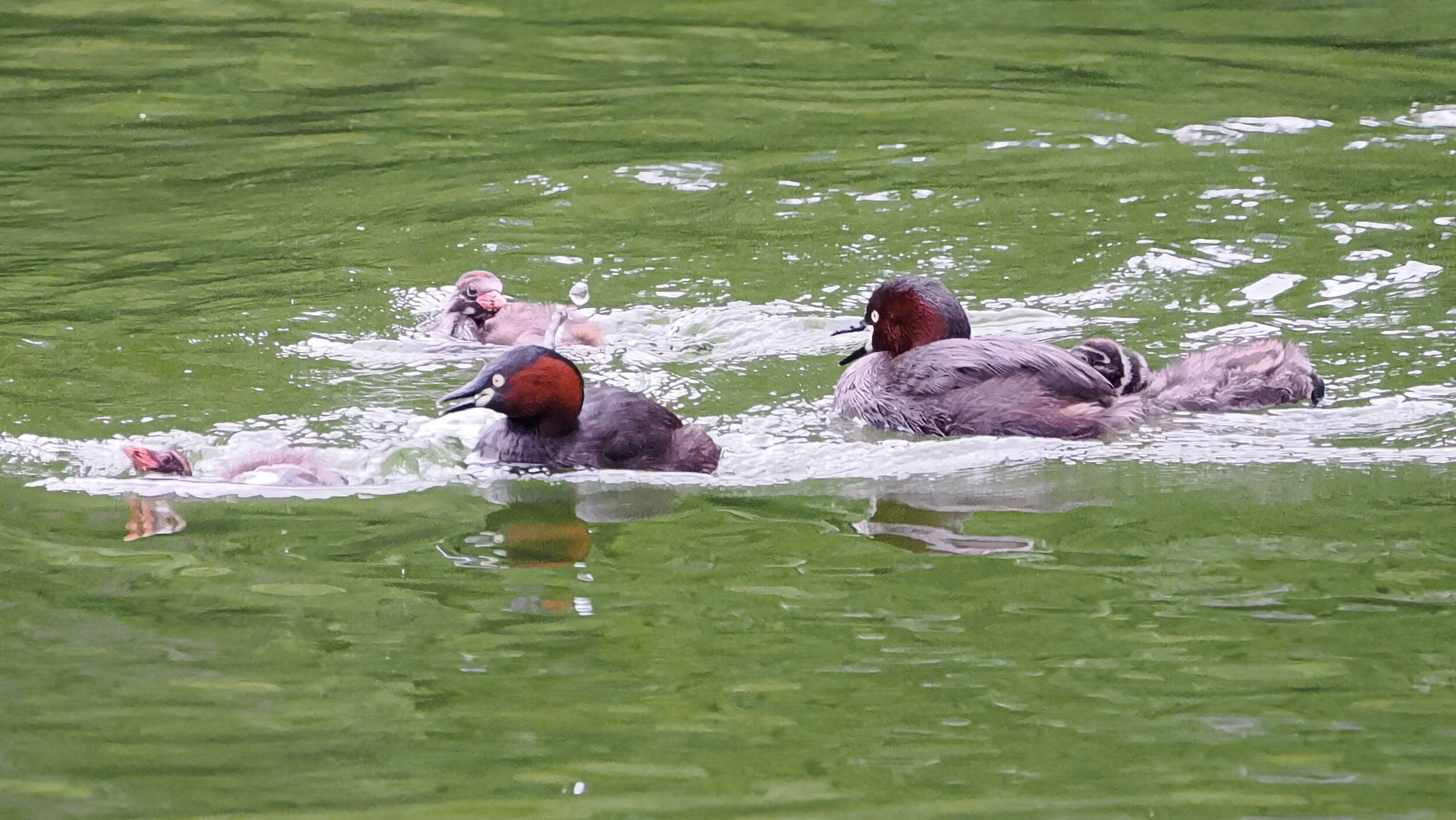 カイツブリの雛は一まわり大きくなって4羽とも元気のようす。2羽ずつ分かれて親鳥を追いかける