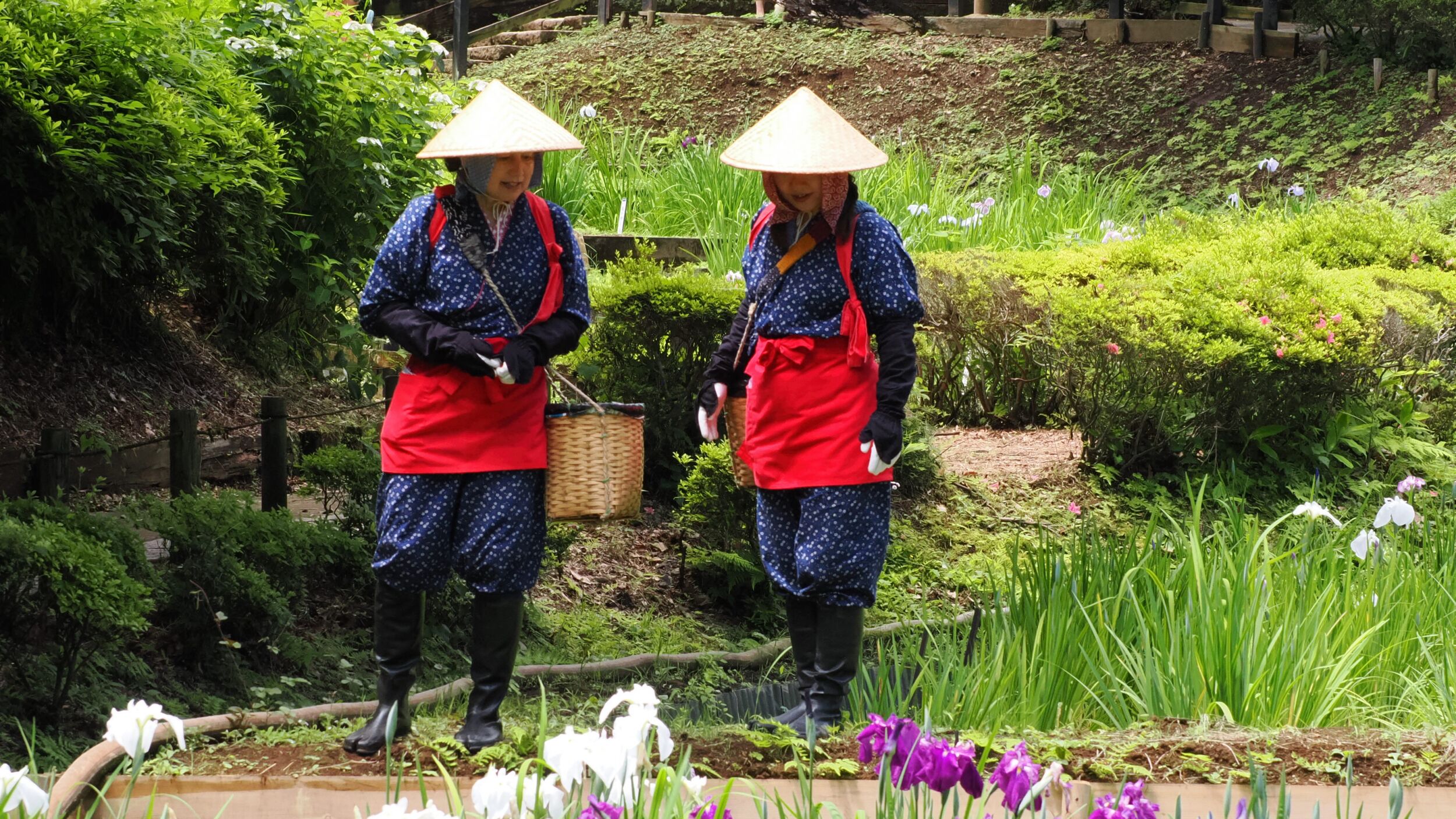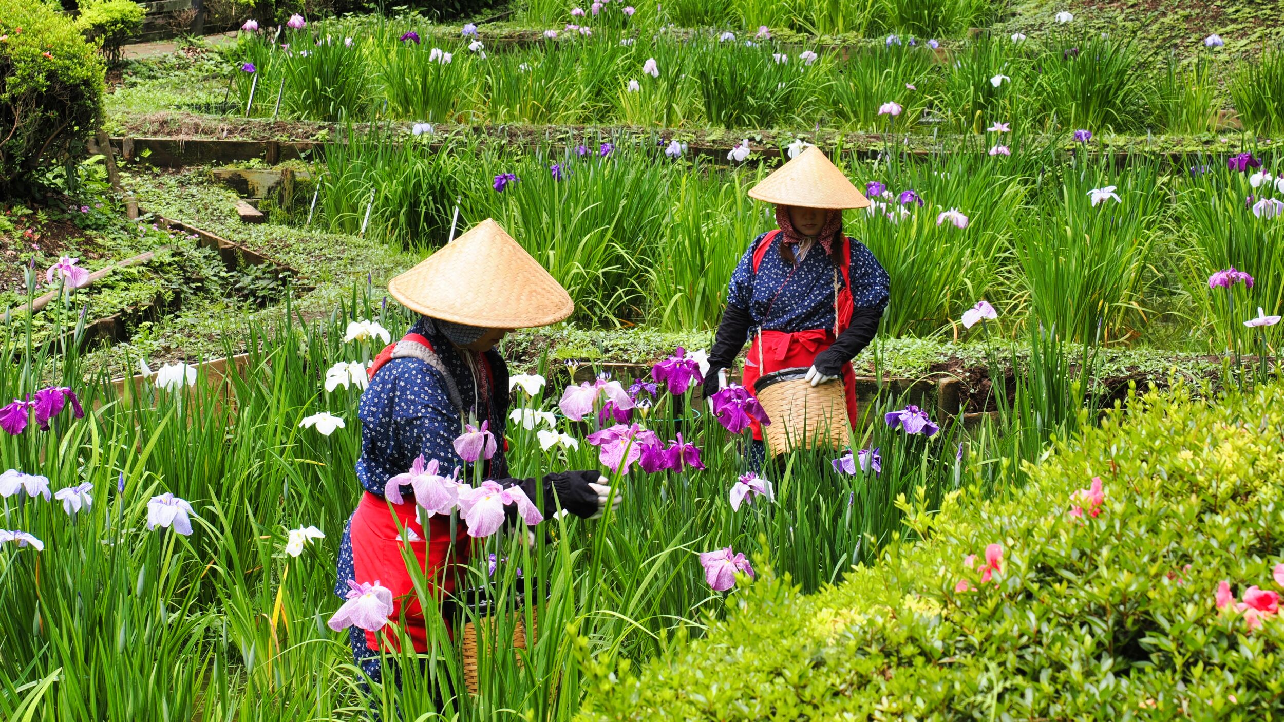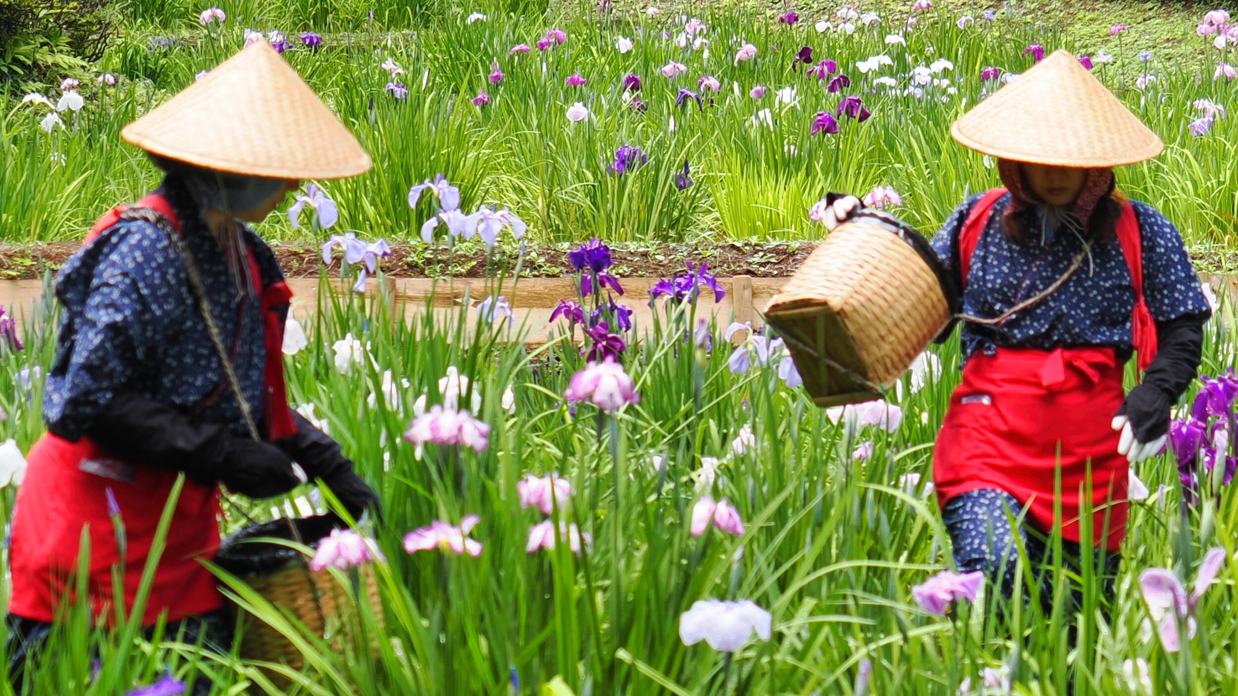 早乙女衣装の女性は暑さと虫などで大変な作業と思うが、写真を撮る側からすれば、花しょうぶの一番花の花がらを摘んでくれるのはありがたい。