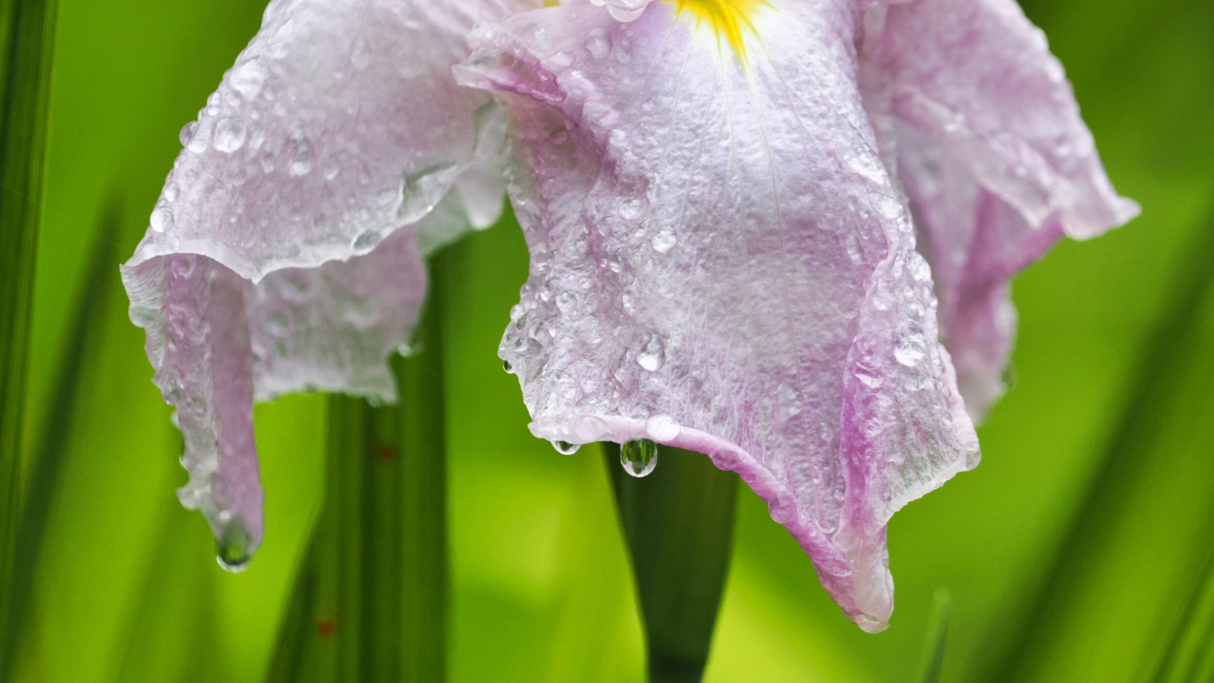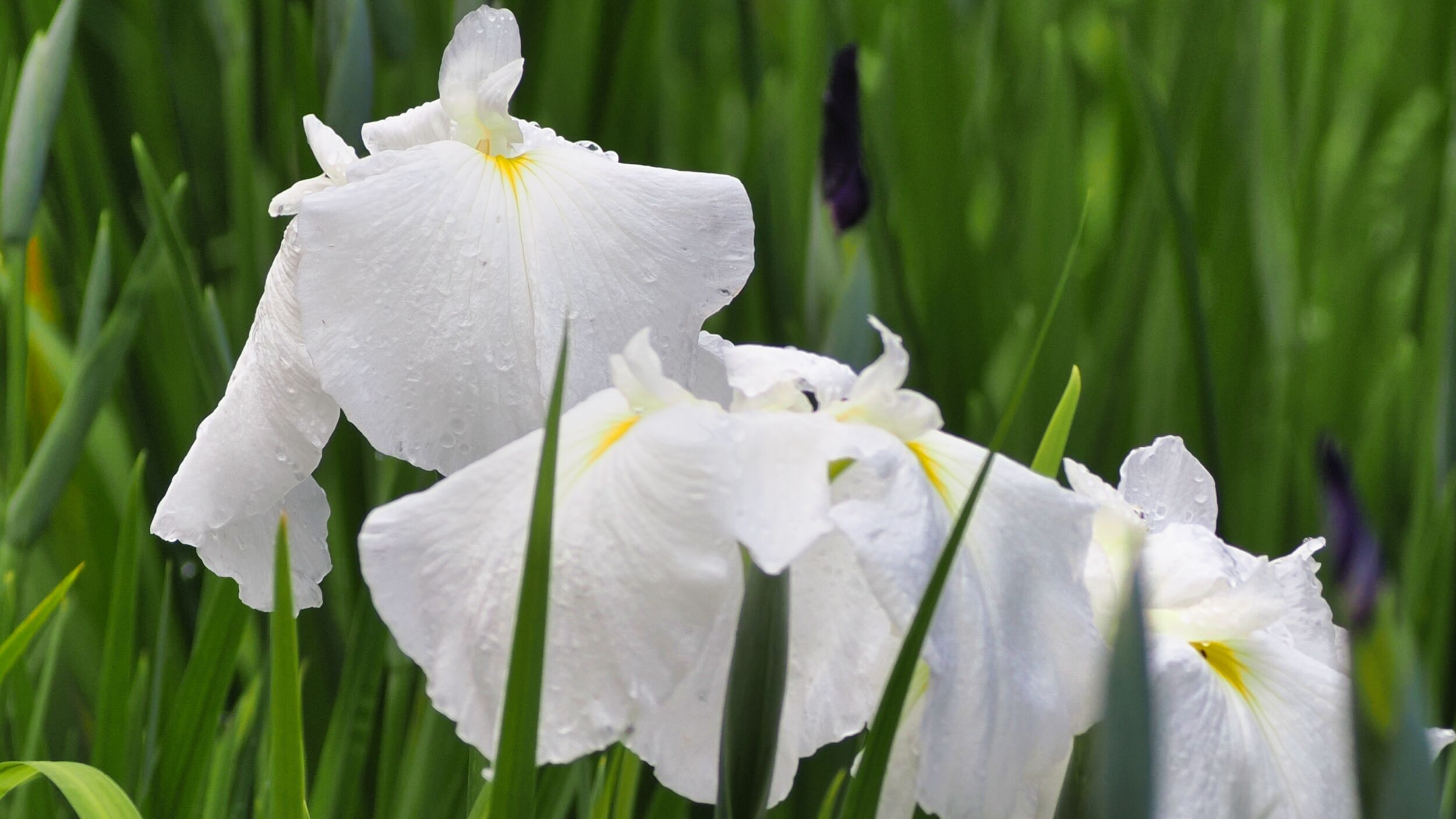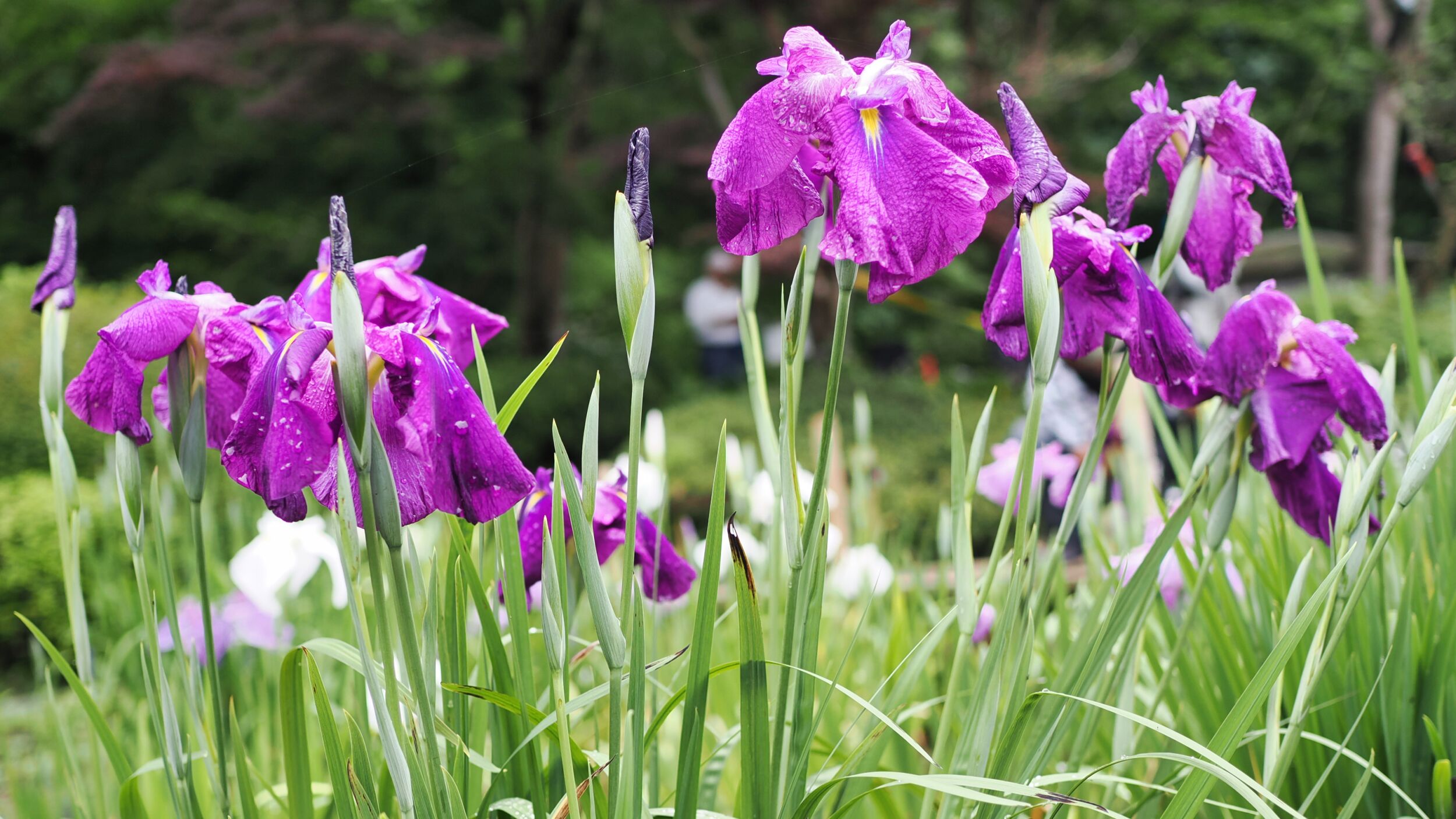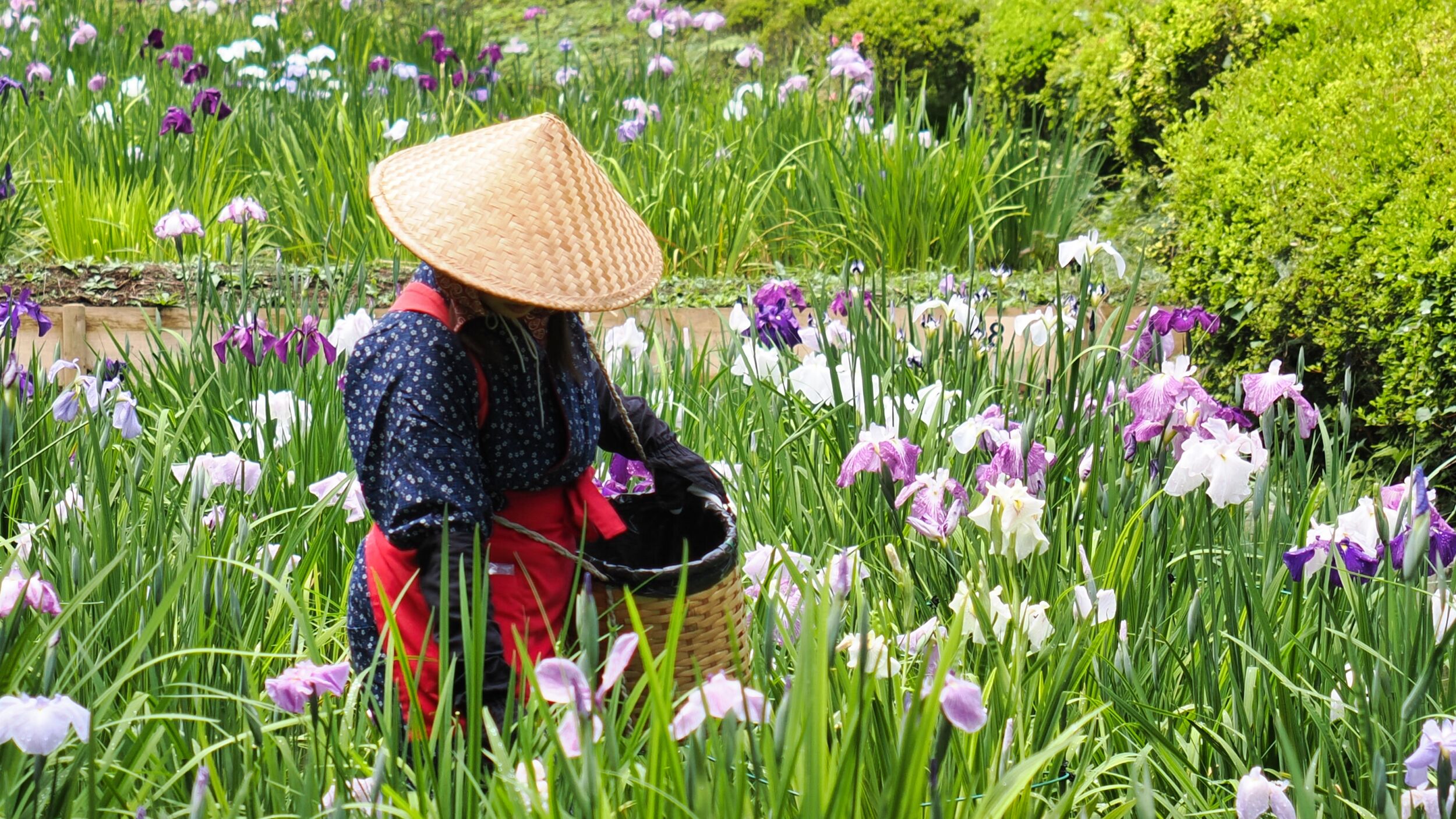 早乙女衣装の女性は暑さと虫などで大変な作業と思うが、写真を撮る側からすれば、花しょうぶの一番花の花がらを摘んでくれるのはありがたい。