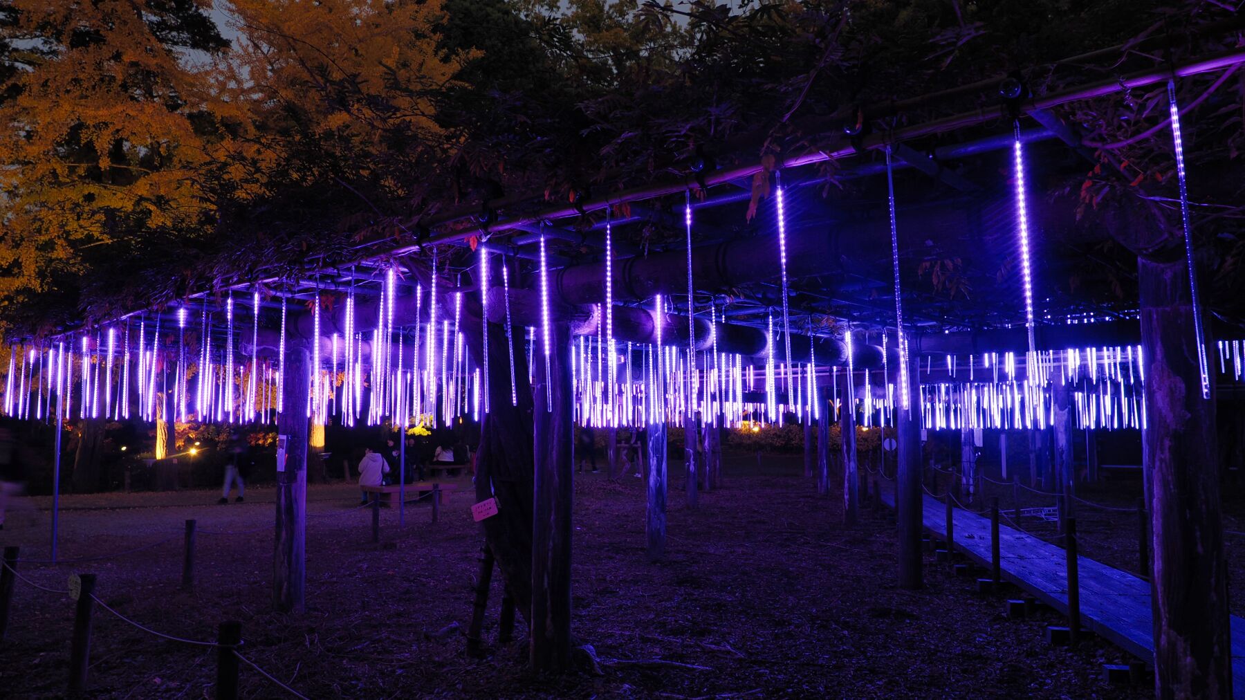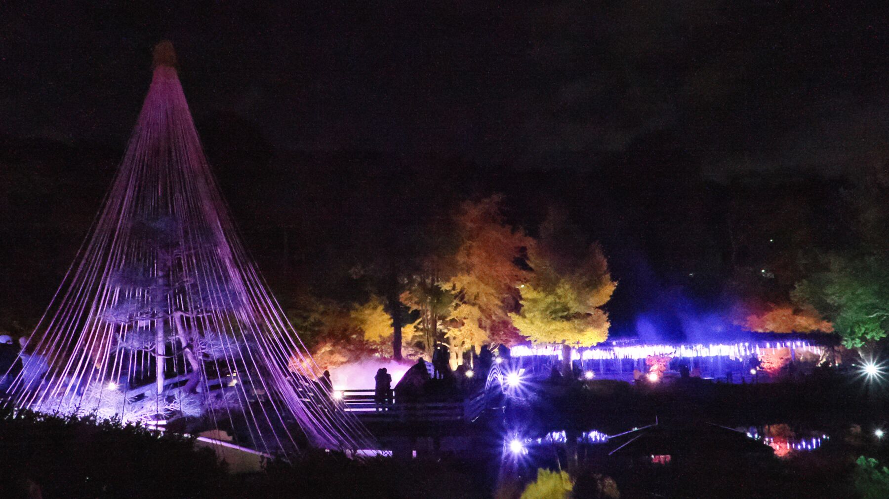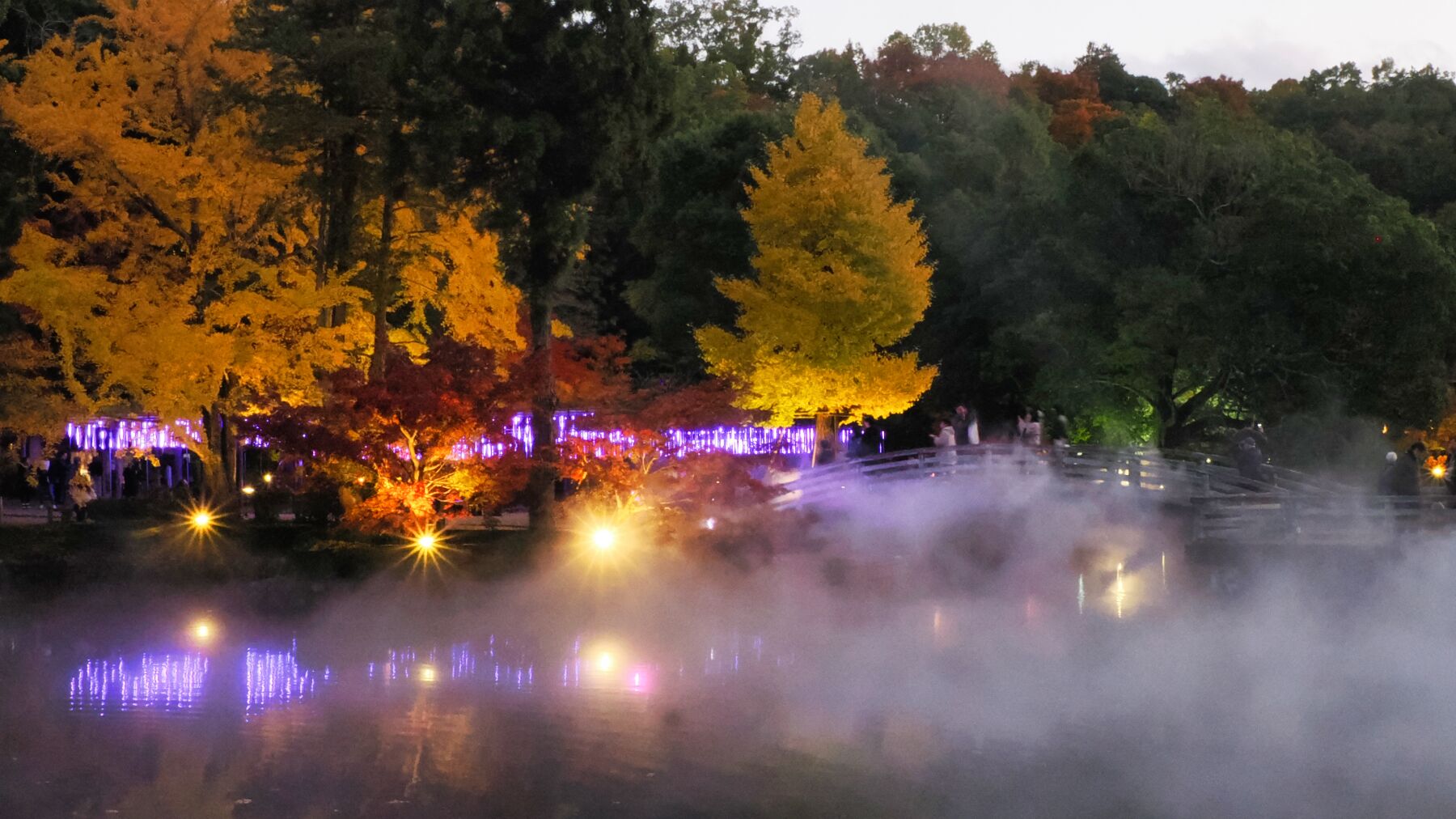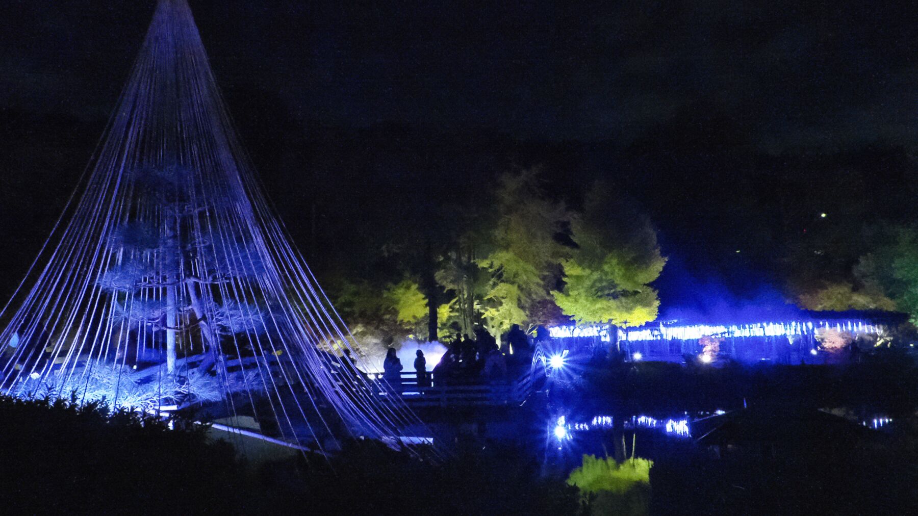 11月15日から薬師池公園のライトアップが始まった。去年から池の縁から霧を発生させて雲海をイメージさせる。今年は藤棚に棒のようなイルミネーションが付けられた。