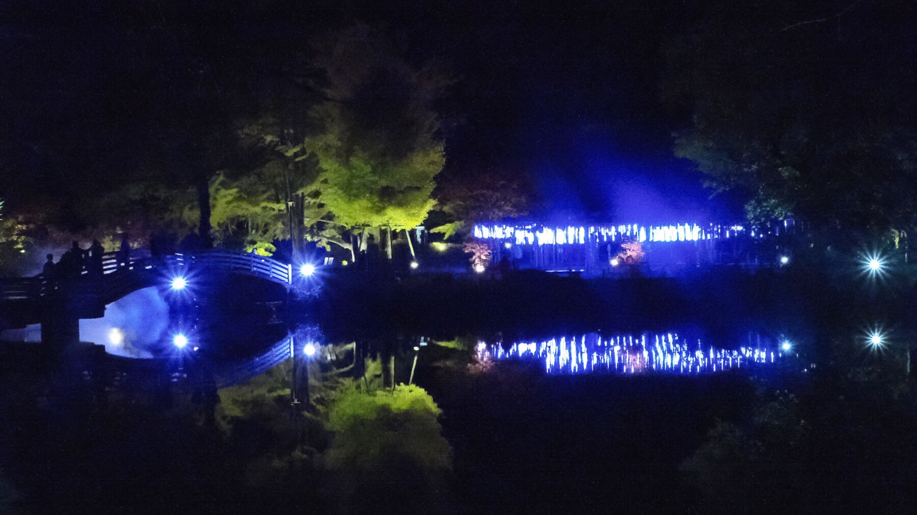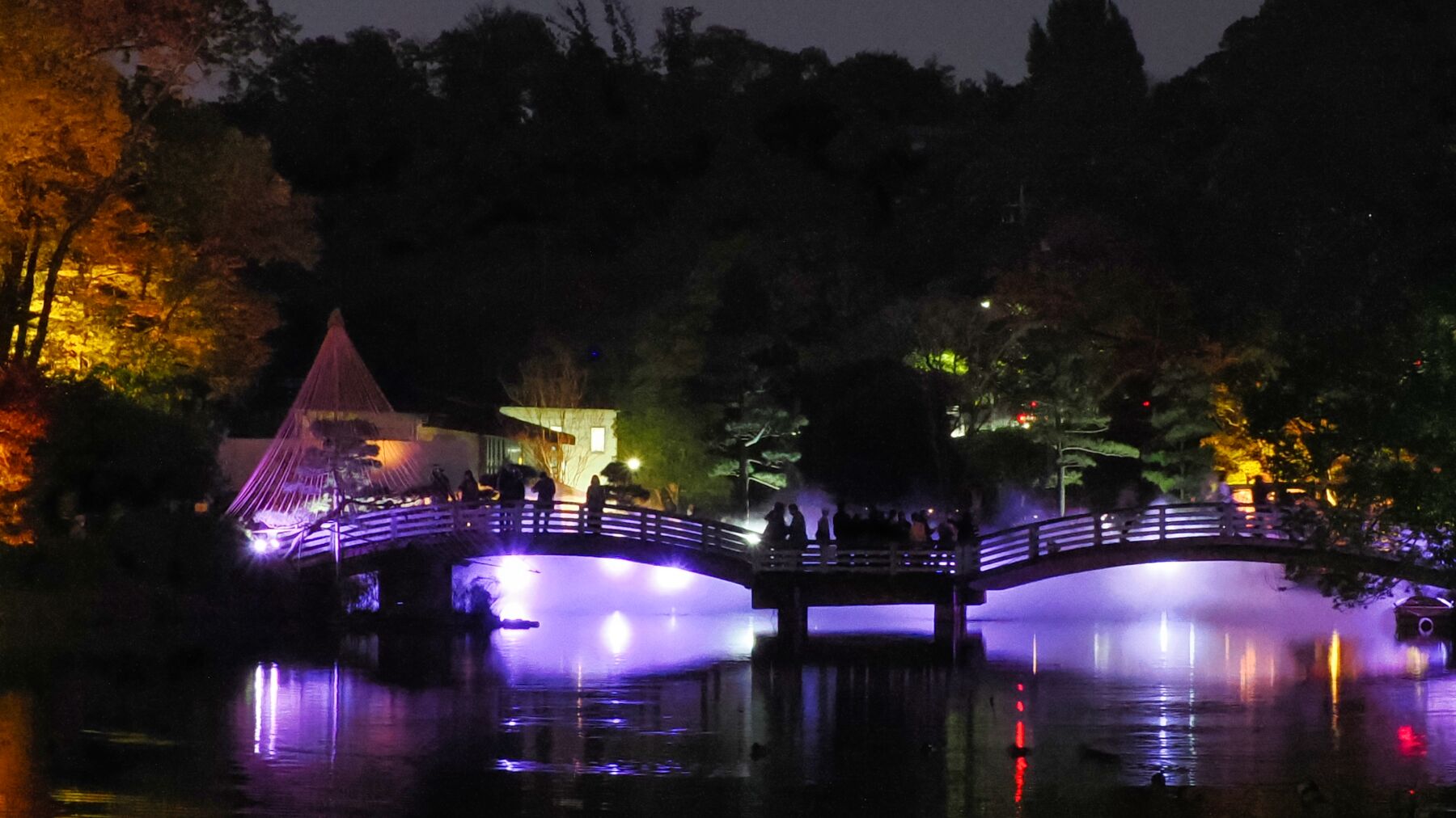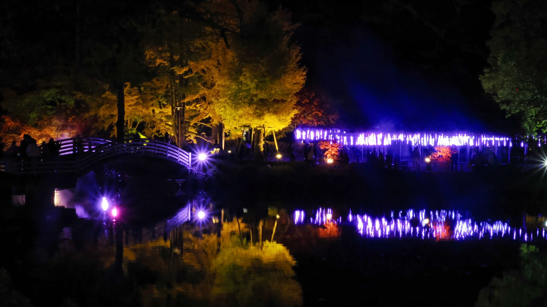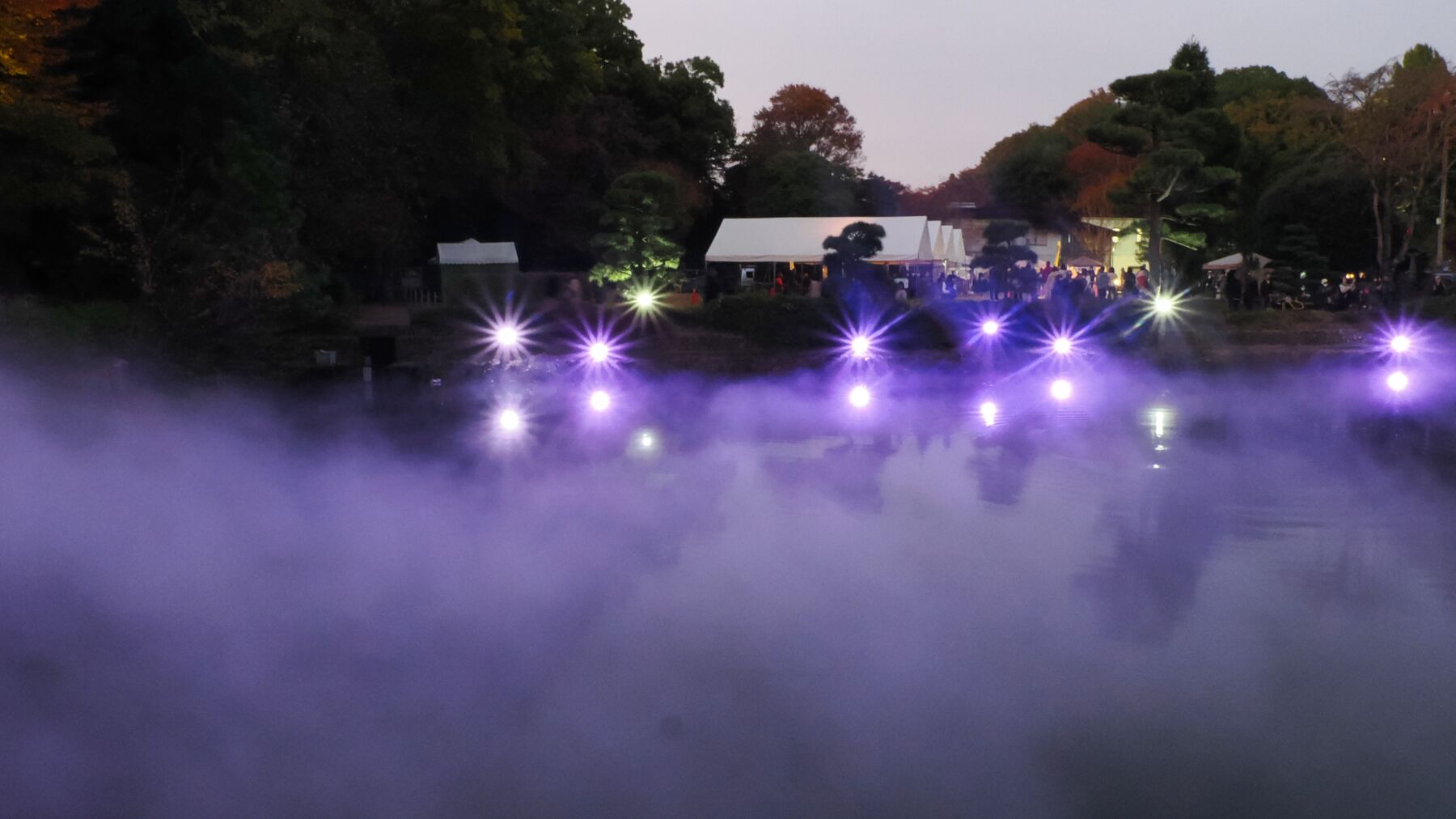 11月15日から薬師池公園のライトアップが始まった。去年から池の縁から霧を発生させて雲海をイメージさせる。今年は藤棚に棒のようなイルミネーションが付けられた。