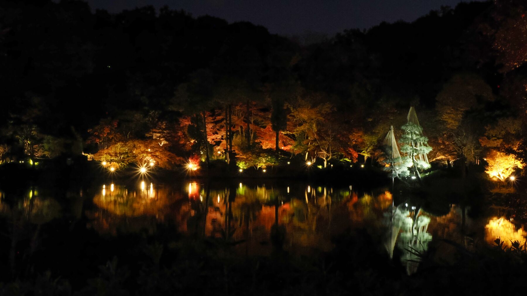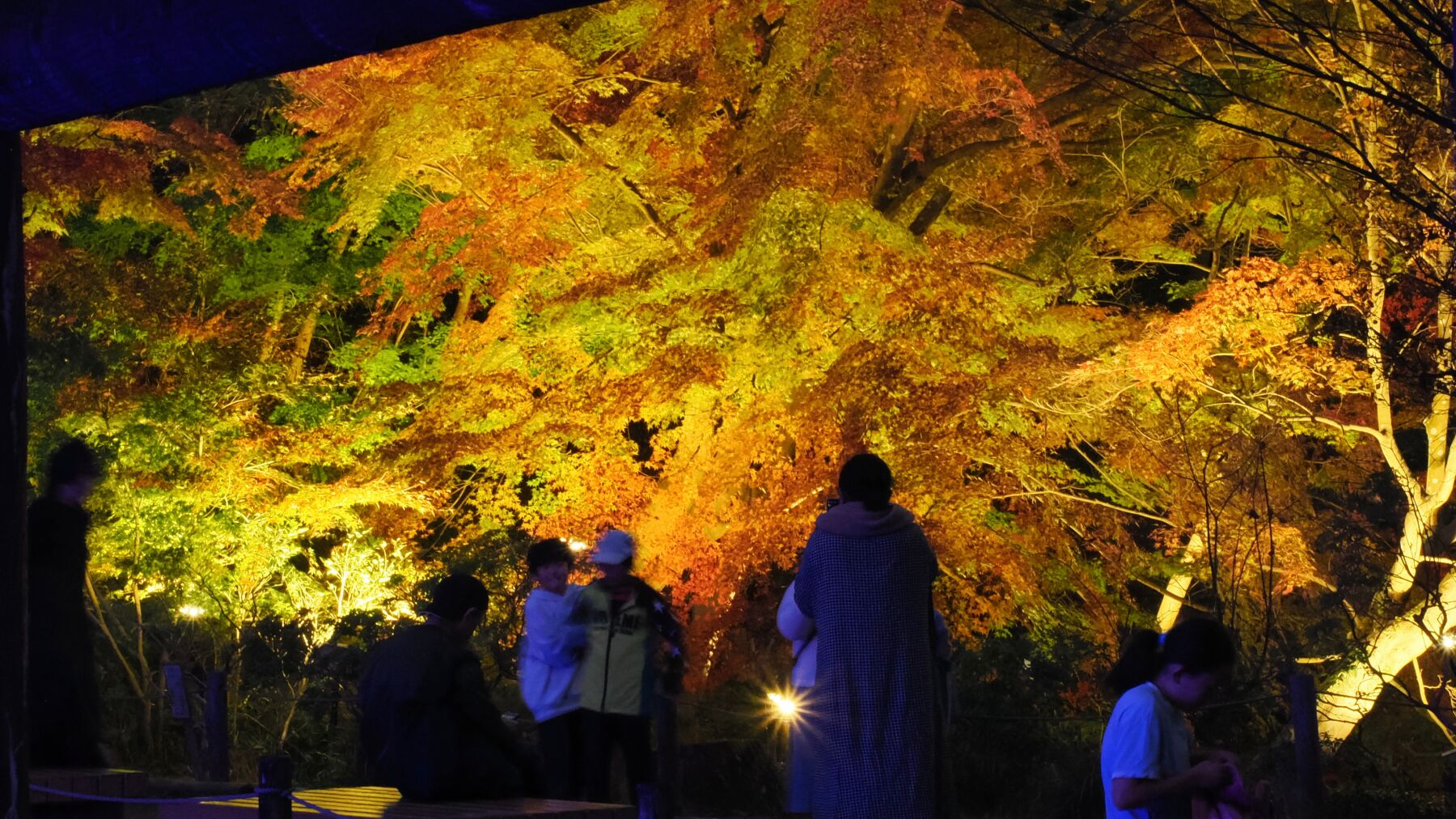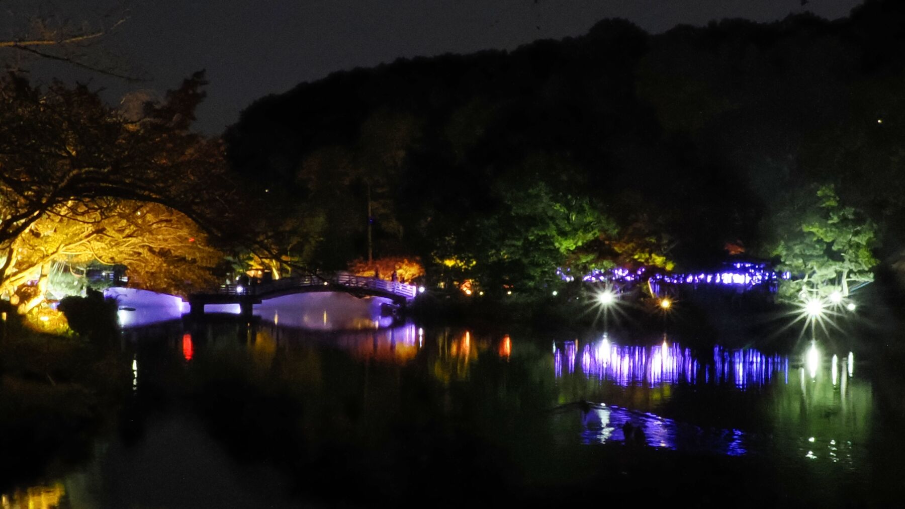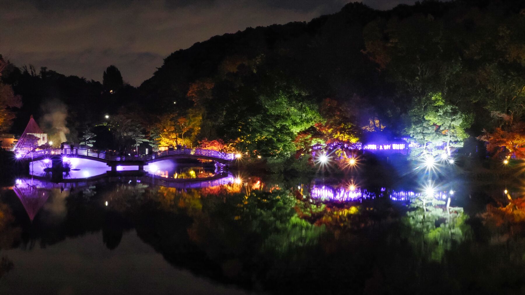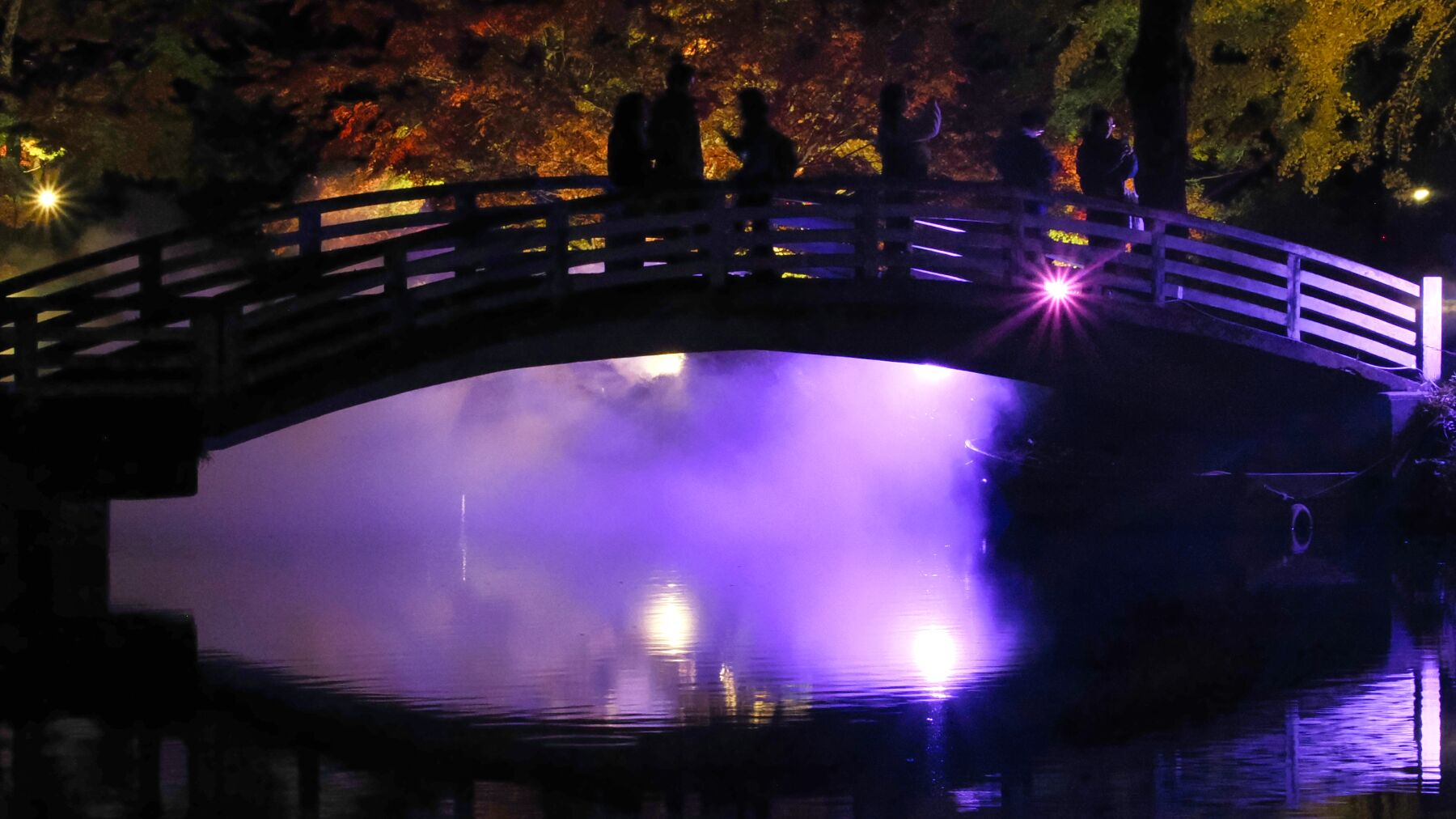 11月15日から薬師池公園のライトアップが始まった。去年から池の縁から霧を発生させて雲海をイメージさせる。今年は藤棚に棒のようなイルミネーションが付けられた。