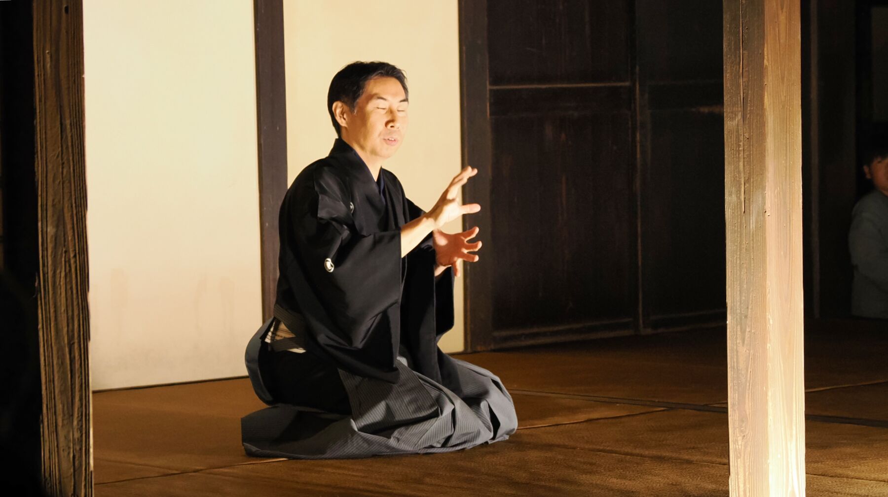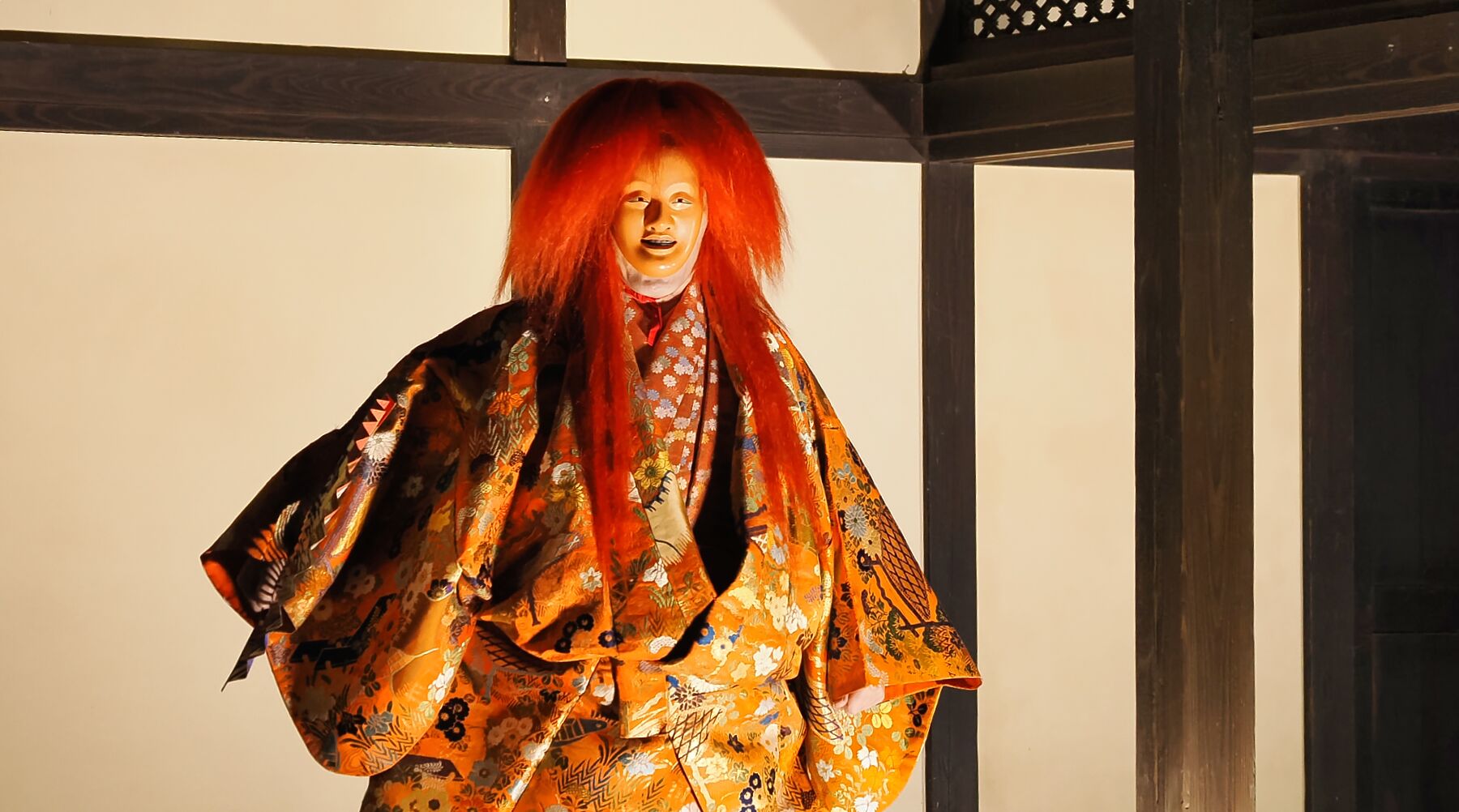 決して広くはない旧荻野家住宅の前庭へおよそ80人が押し寄せたため、写真撮影にはたいへんな苦労があった。 しかし、幕末に建てられたとされる医家の建物を移築したこの場所は、歴史の重みを静かに湛えている。そこで披露された能の衣装は、その重厚な空気と見事に調和し、ほかの会場ではなかなか味わえない独特の雰囲気を醸し出していた。