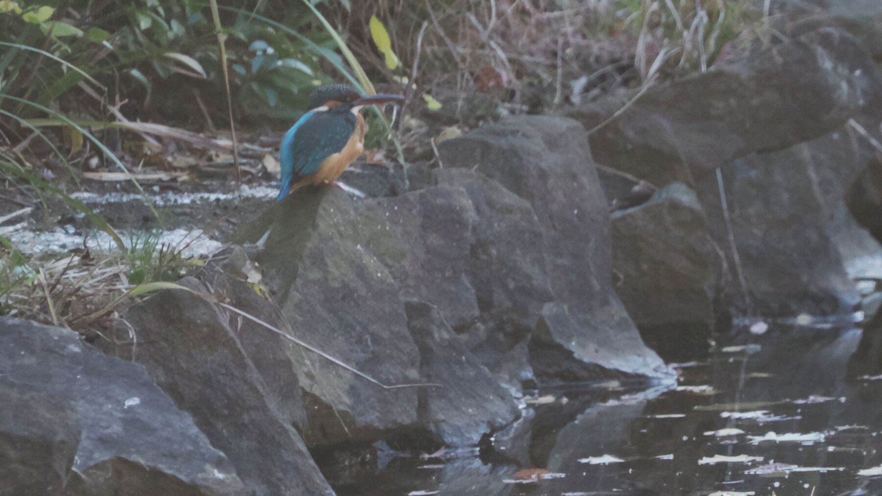 この日のカワセミは池の淵の石垣の陰から動かなかった。