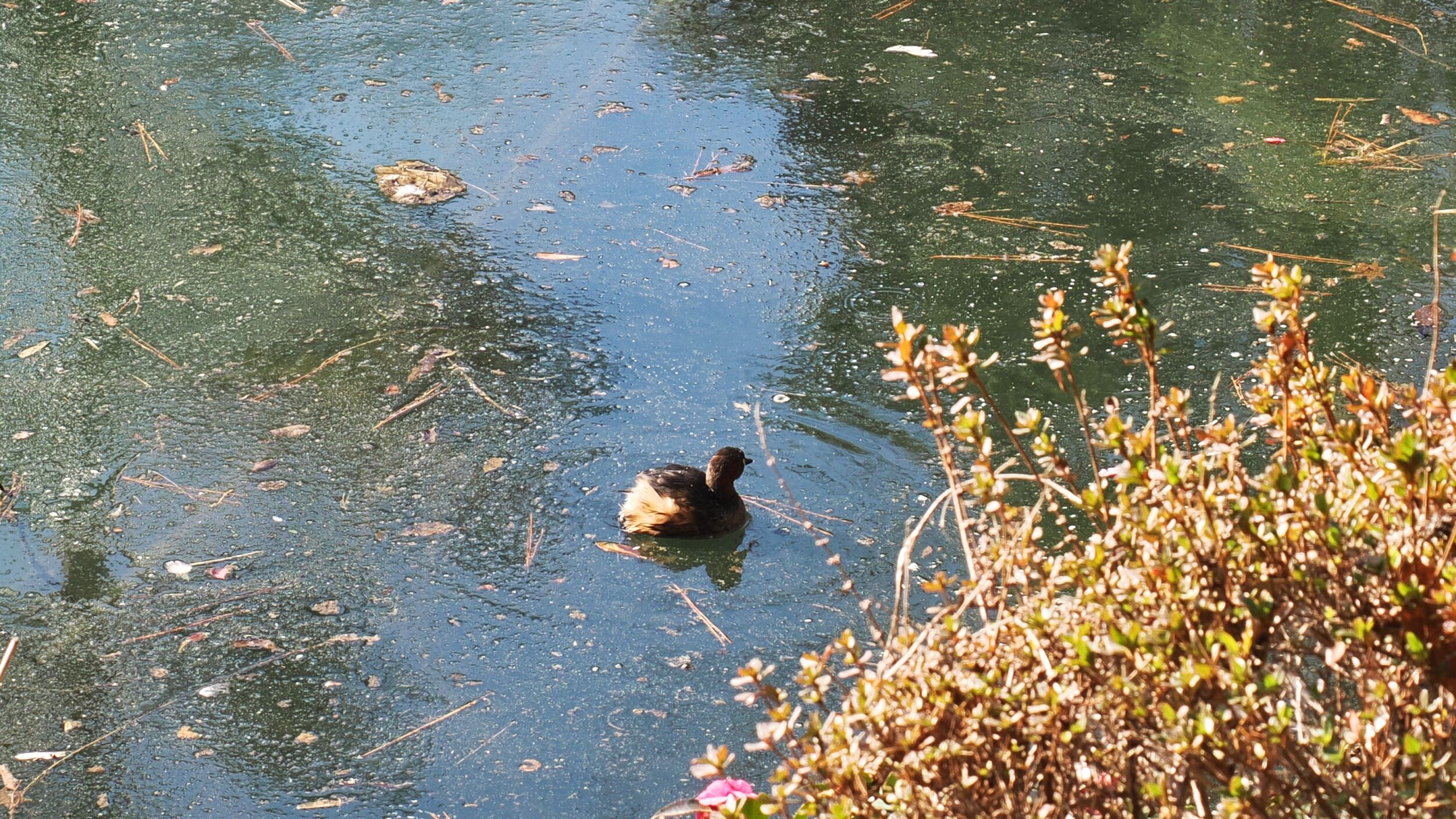 薬師池にはカイツブリのツガイがいたが、他の水鳥が全く見えない。カルガモ、マガモ、ホシハジロ、キンクロハジロなど毎年訪れる常連鳥はどこへ行ってしまったのかこんな年は記憶にない。カイツブリのツガイは先週も排水溝の出口付近にいたので食べ物がないのかもしれない。