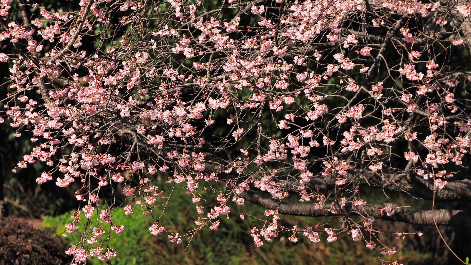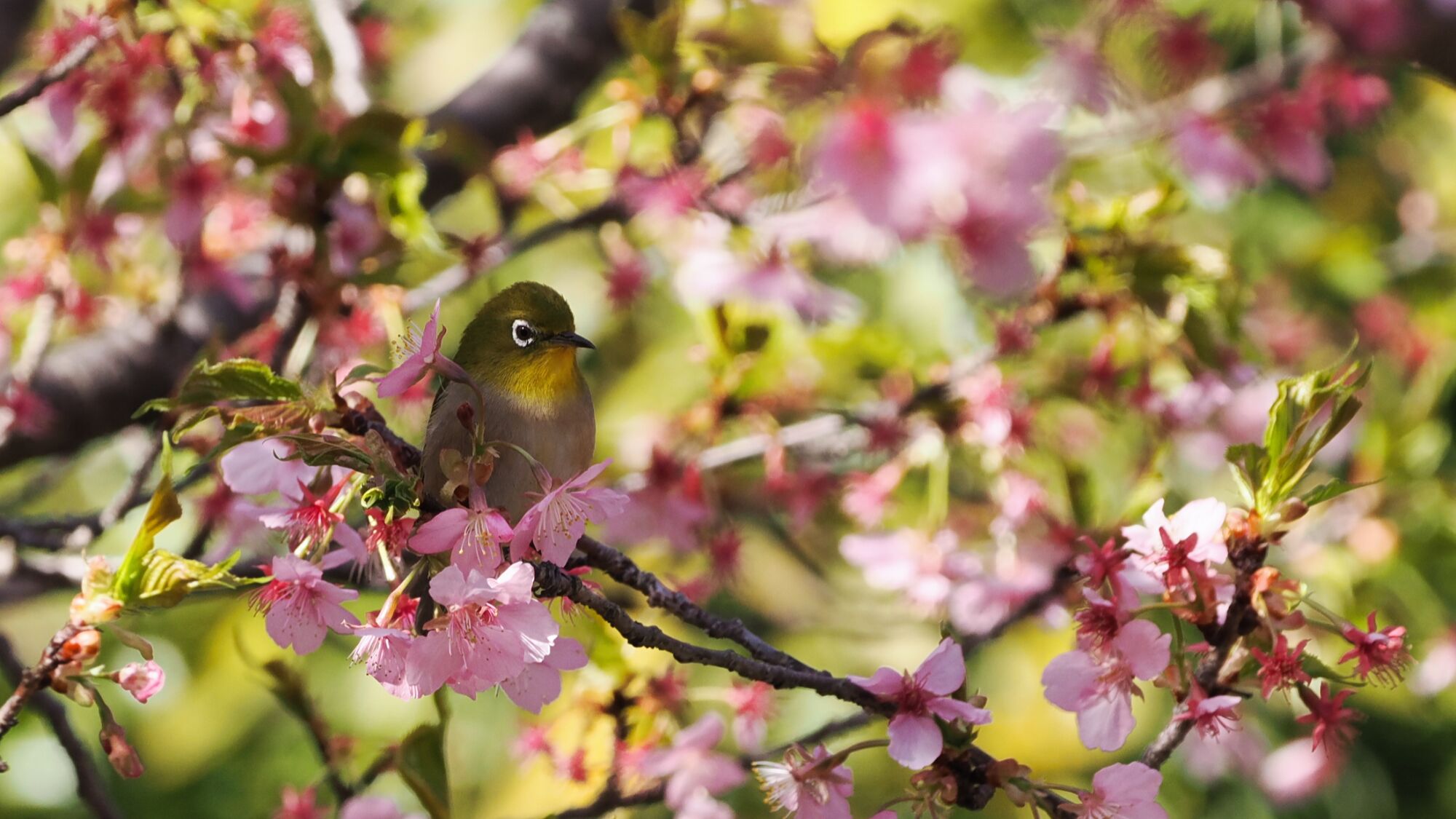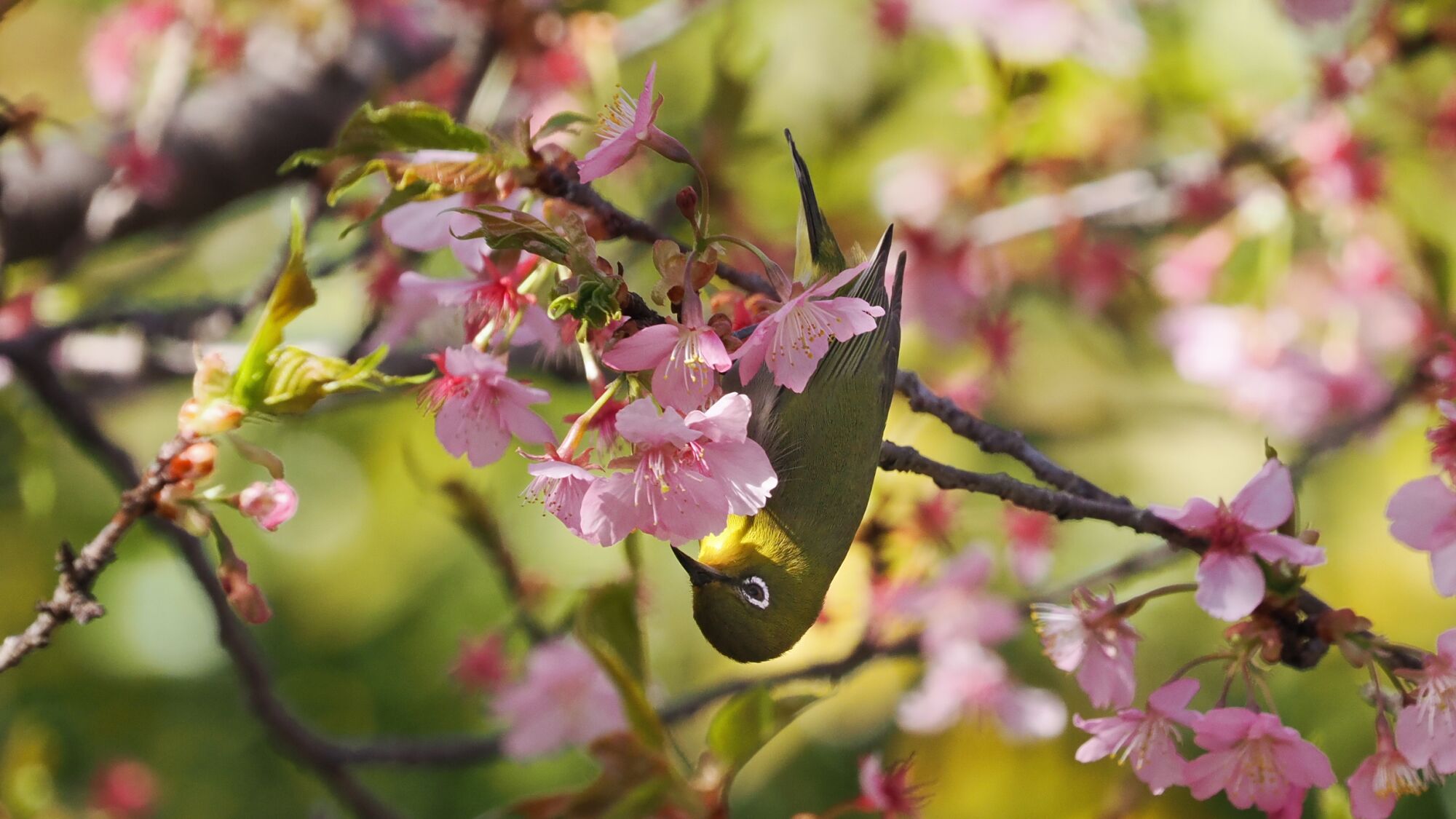 昨夜は強い雨が降った。午前中まで雨空が残ったが、11時頃から青空になった。梅林の梅は多くは散った。薬師池では河津桜にメジロがきていた。