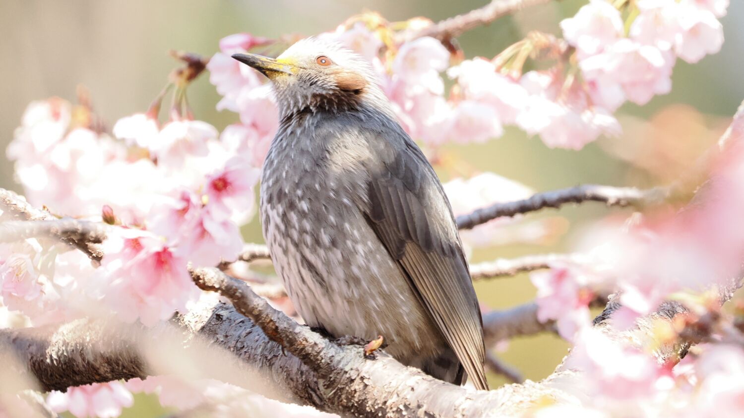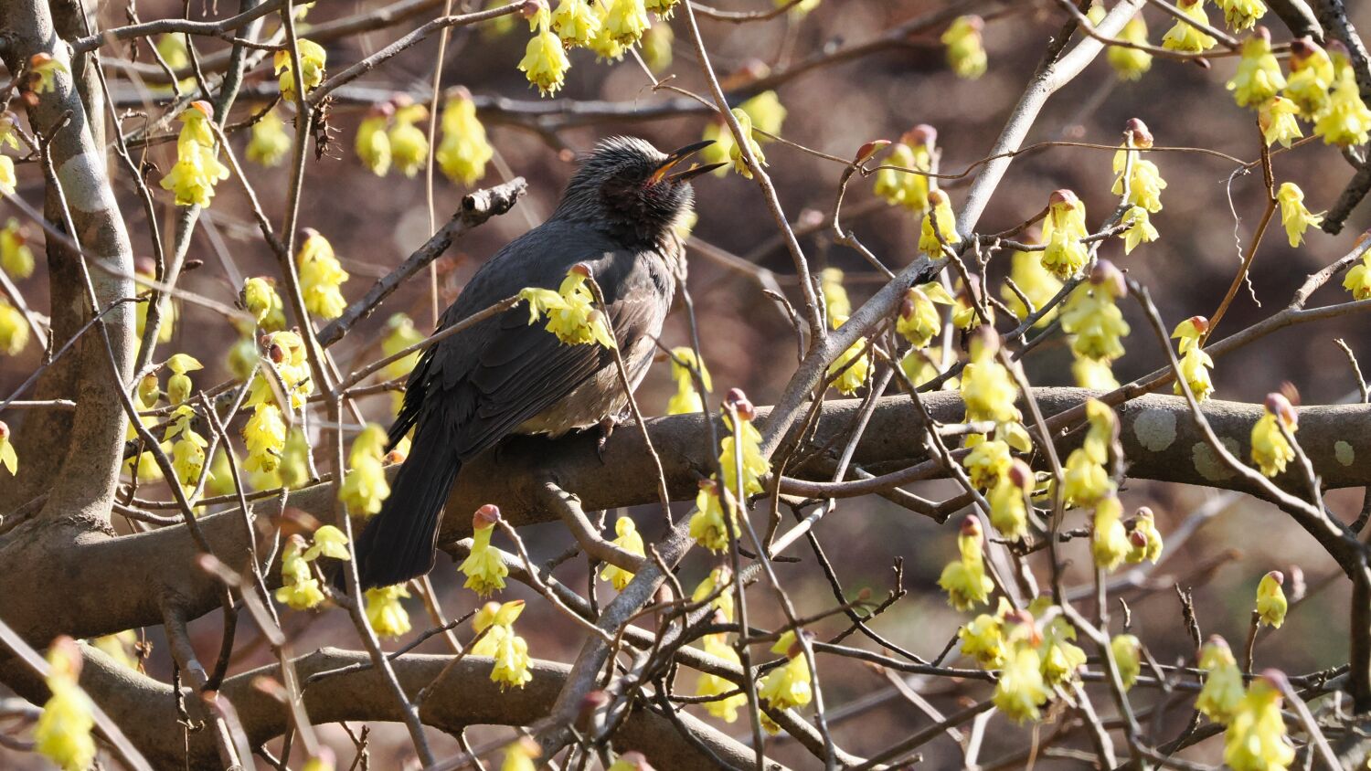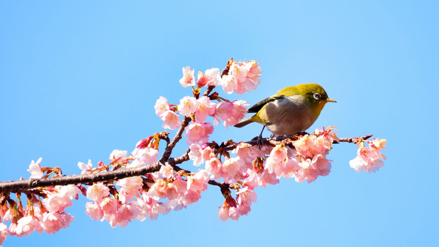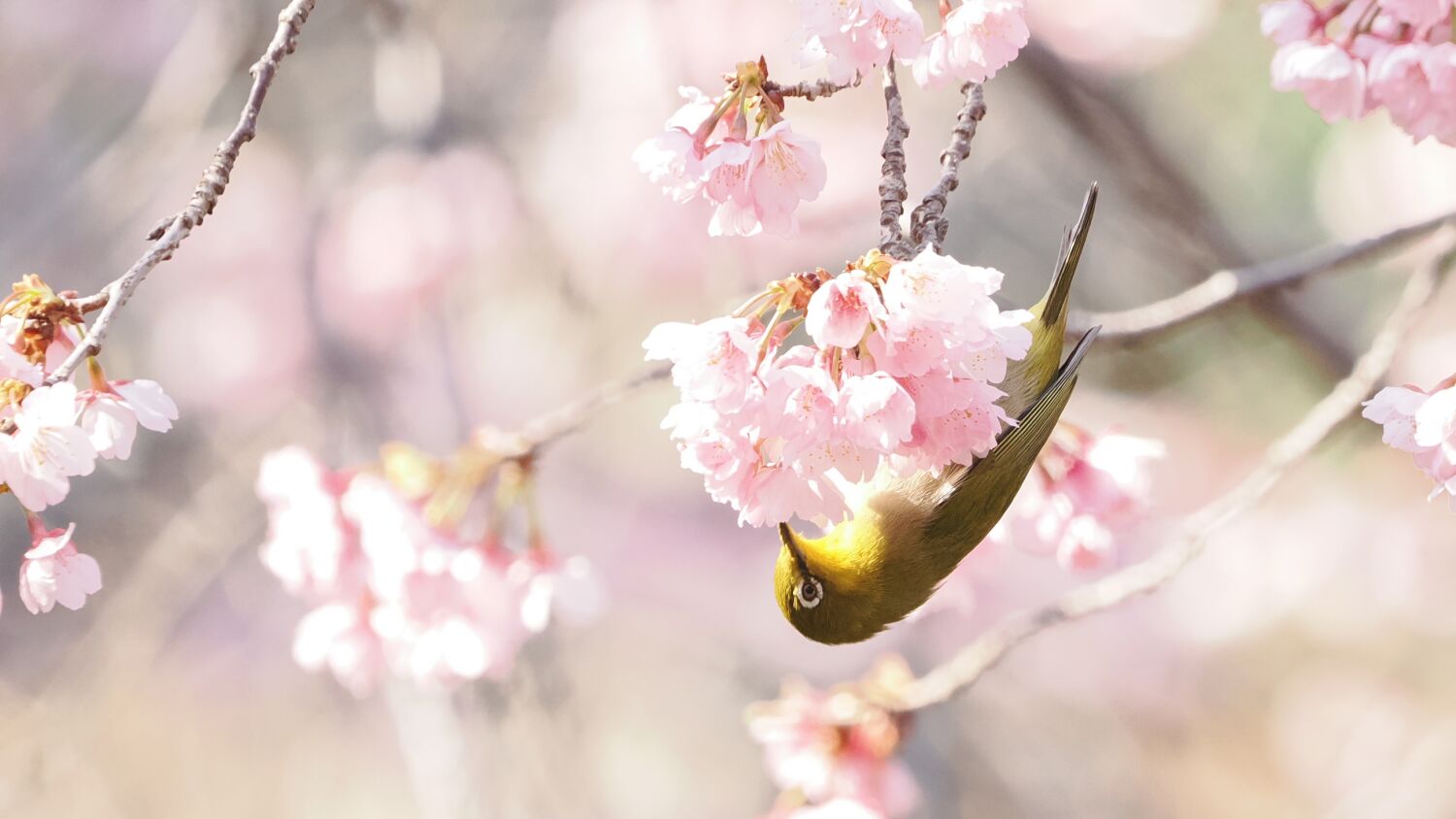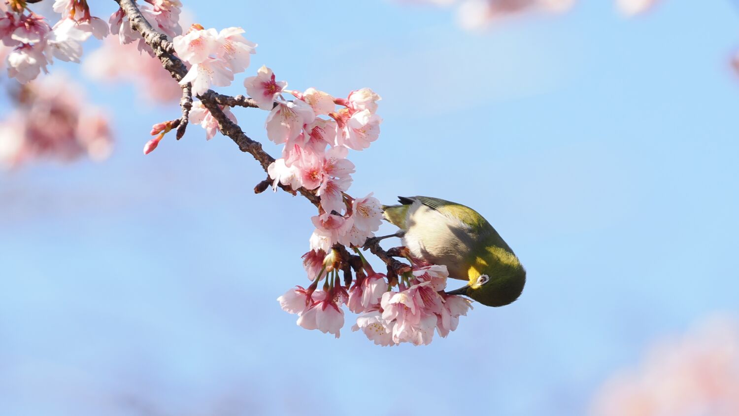 蓮田の熱海寒桜にメジロが十数羽花の蜜を求めて集まっていた。ヒヨドリがメジロを追い払う、ヒヨドリがいなくなると近くの木の葉に避難していたメジロが再び現れる。